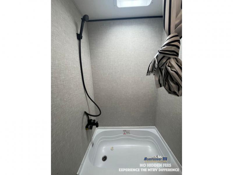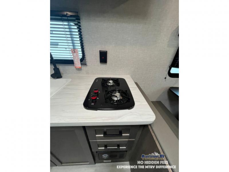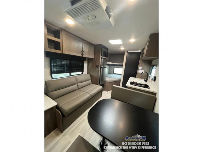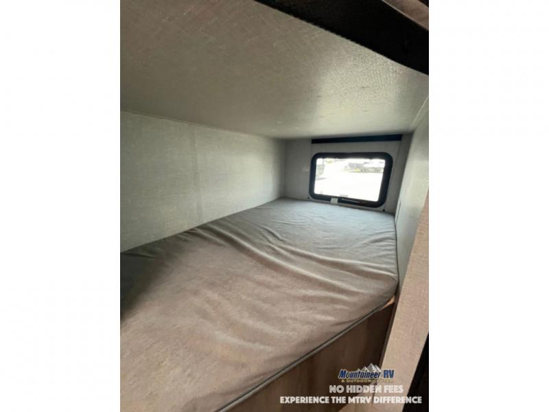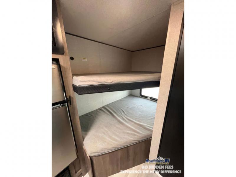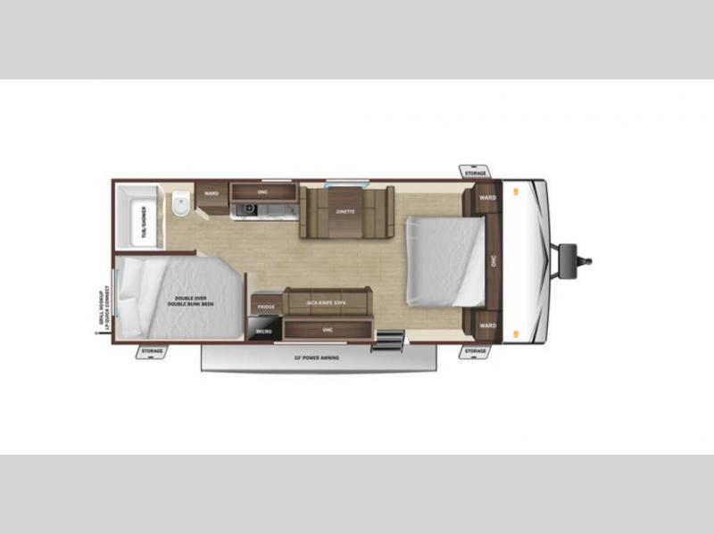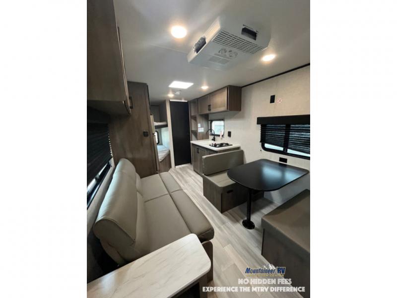 This travel trailer has everything you need for a fun getaway! You can unload the exterior storage when you get to camp, then head inside to make lunch on the two burner cooktop or microwave oven. A 12V refrigerator will keep your perishables fresh, and a booth dinette will provide dining space. The jackknife sofa offers a comfortable place to relax while you let your stomach settle from the delicious meal. Everyone can take turns freshening up in the rear corner private bath that includes a tub/shower and a toilet, and the little ones are sure to love the double over double bunk beds!