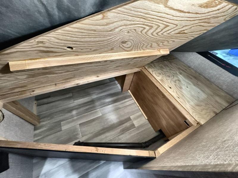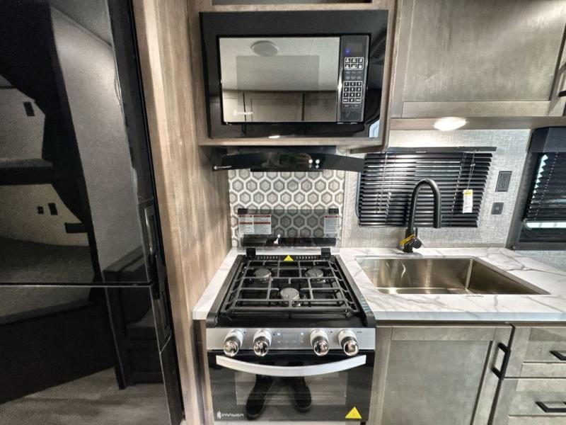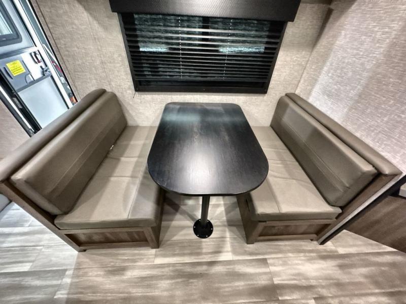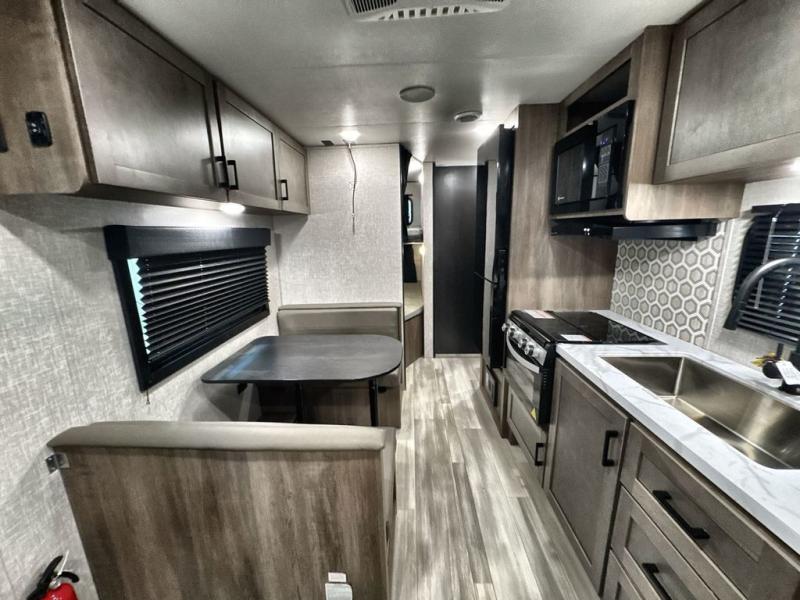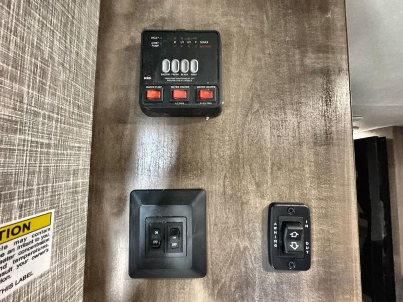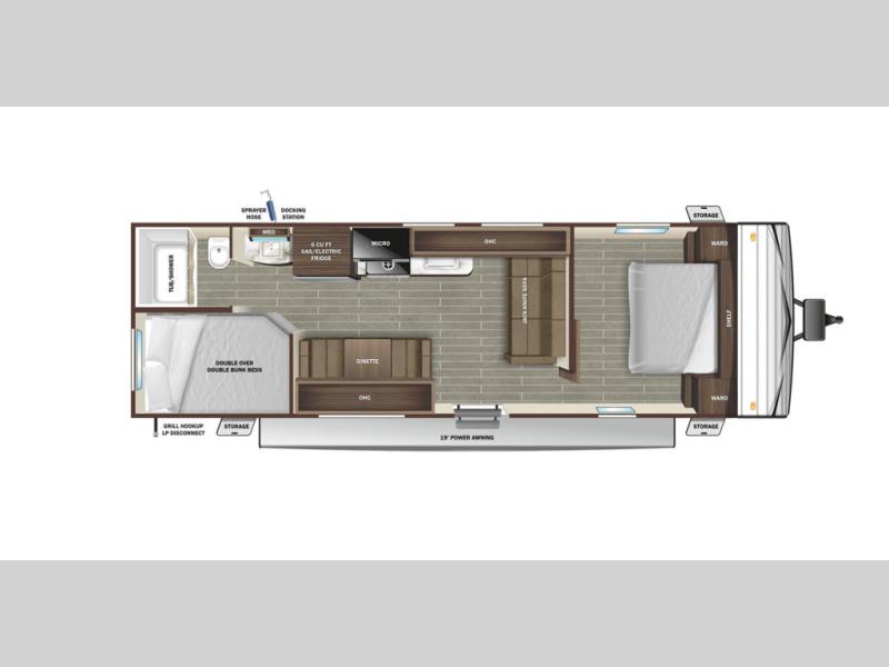 Enjoy outdoor fun with inside comforts in this dual axle trailer that offers privacy in the front bedroom with a sliding door, a walk-around bed and storage. There is a private toilet and tub/shower room with a bathroom sink just outside the door in the rear. The double-size bunks offer sleeping for four, plus the main living and kitchen area provides a jack-knife sofa and booth dinette that can double as sleeping space when everyone joins you on camping trips. The galley kitchen gives the cook a refrigerator, a microwave and a 17" oven, plus overhead cabinets to place your dry goods. The exterior provides a sprayer hose, a docking station, a grill hookup and LP disconnect, plus a 18' power awning and lighted exterior storage. And there are options to add to enhance this trailers standard features, take a look!