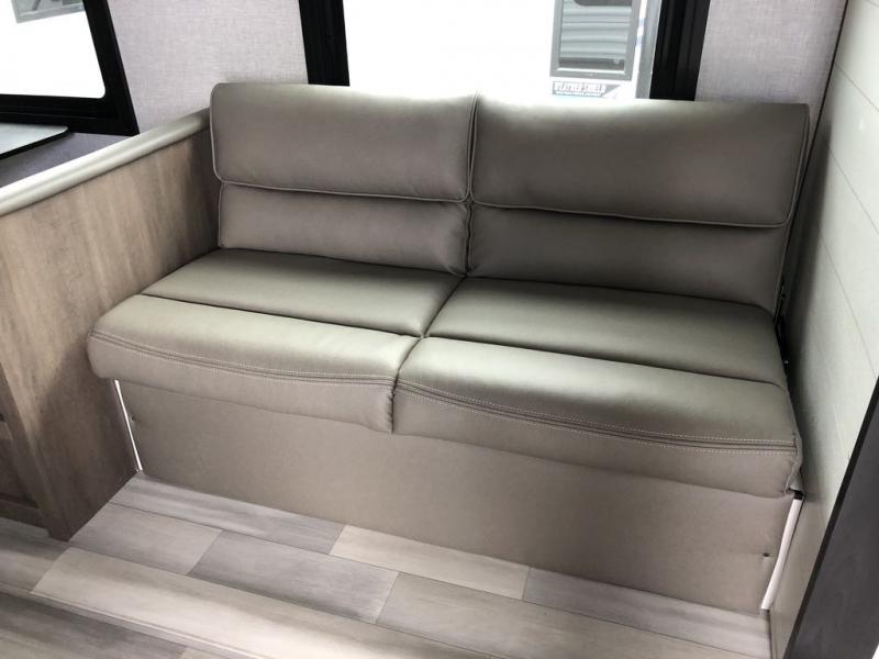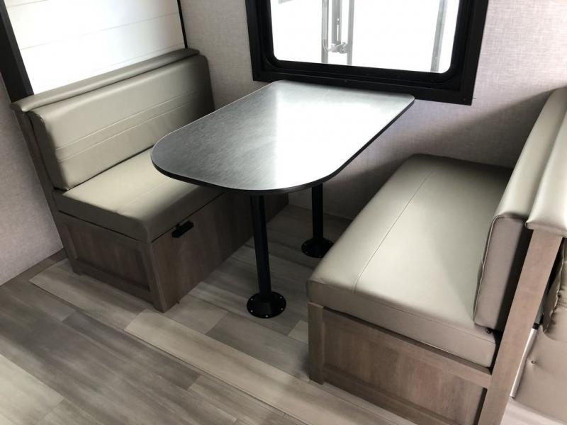 Enjoy camping at local RV spots or even national parks in this dual axle trailer that offers a large slide with a jackknife sofa and booth dinette. There is a full bathroom to get cleaned up in with extra counter space for toiletries, and the kitchen provides a three burner range with glass cover, a 17" oven and a pantry to hold all the goodies. You can enter the front bedroom from each side of the entertainment center giving you your own side, and there are dual wardrobes plus a shelf overhead. And don't forget about the 16' power awning with LED lighting, the exterior storage for your outdoor gear and the outside kitchen including an outdoor griddle and a refrigerator. You might even like to add a few options, take a look at the list!