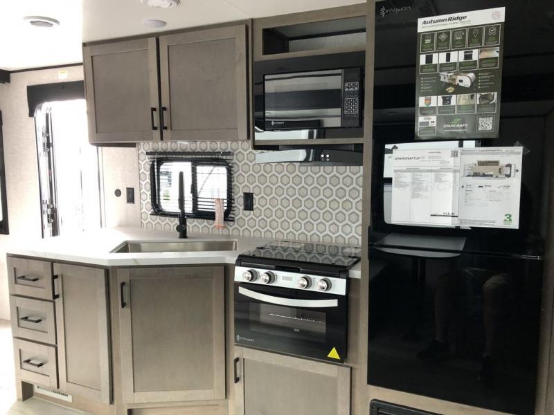 The Autumn Ridge travel trailers by Starcraft are easy to tow and easy to love! Each one is constructed with a durable Magnum Roof system, black front diamond plate protection, and fiberglass insulation so you can camp well into the colder months. The kid and pet friendly residential vinyl flooring will be easy to keep clean, and you'll love the hardwood cabinet doors, pleated blackout night shades, and pressed membrane kitchen countertops. A ceiling mount Bluetooth speaker means you can listen to your favorite tunes as you visit with friends and family, plus there is a power awning with LED lights for an inviting outdoor living space. The Autumn Ridge also comes with the Xtend Solar I Package with a 200-watt solar panel and a 30 amp controller for off-grid capabilities!