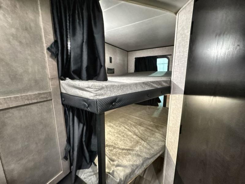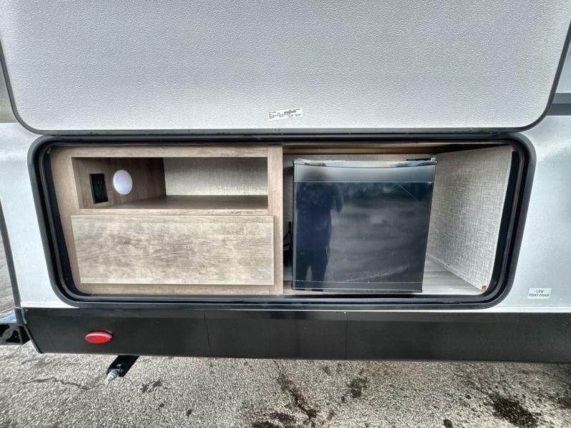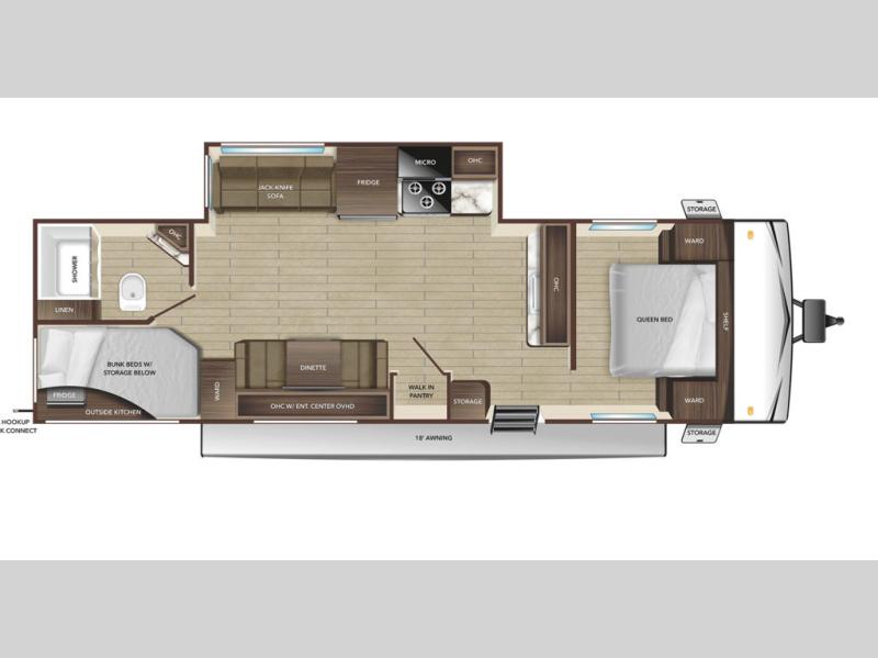 Gone are the days of having guests stay on air mattress thanks to this travel trailer with double-size bunks! You will have the bed in the front private bedroom all to yourselves and any other guests can sleep on the booth dinette and jackknife sofa in the main living area. The kitchen in this Autumn Ridge model includes a microwave oven, three burner range, and a refrigerator for food storage. There is also a walk-in pantry to keep snacks and paper goods stocked! The exterior is just as accommodating with its storage compartment, outside kitchen and 18' power awning with LED lights!