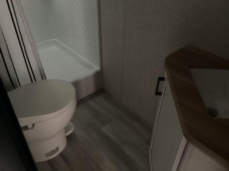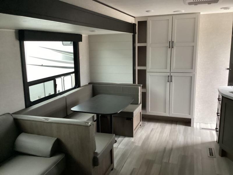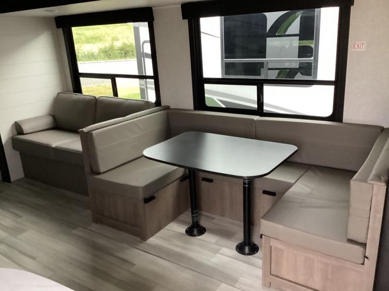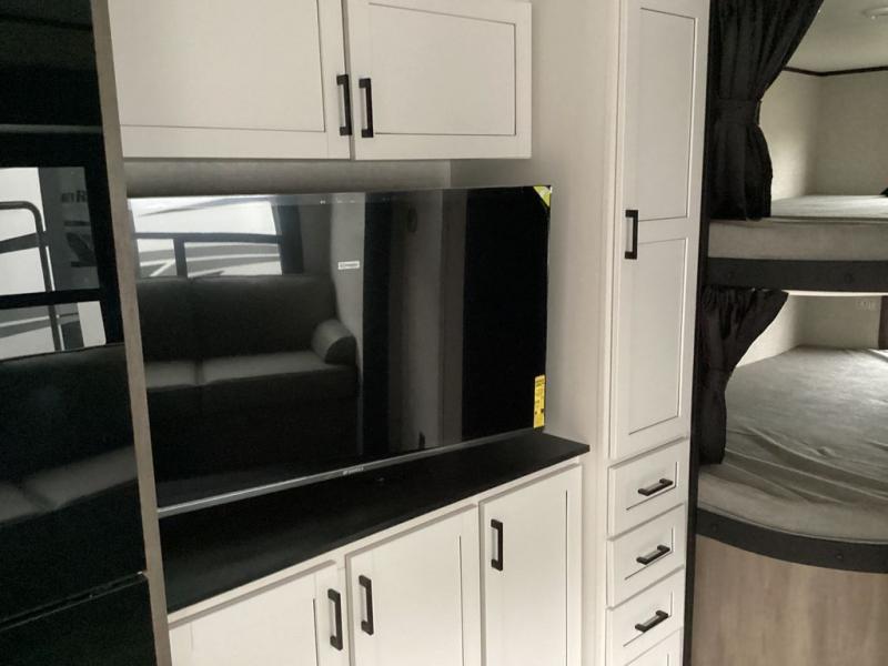You and the whole family will have a fun time camping in this dual axle trailer! The kiddos can sleep on the corner set of double-size bunk beds and you will have your own privacy with the front private bedroom which has wardrobes on either side of the bed. You could even transform the U-shaped dinette and jack-knife sofa slide into extra sleeping spaces for a couple of cousins to tag along too. Everyone will stay squeaky clean with the shower in the rear corner bathroom, and there is even an exterior sprayer hose to wash the mud off your feet before entering inside the trailer. The chef will enjoy cooking delicious meals indoors, but love being able to breathe in some fresh air while cooking at the outside kitchen. When mother nature rains on your parade, simply head inside and enjoy the entertainment center!