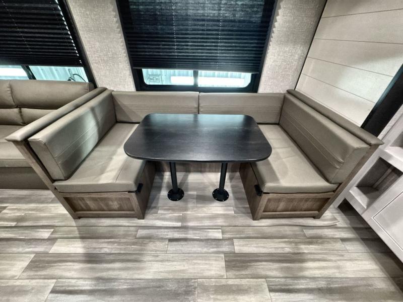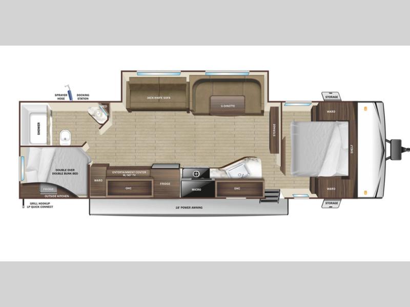 You and the whole family will have a fun time camping in this dual axle trailer! The kiddos can sleep on the corner set double-size bunk beds and you will have your own privacy with the front private bedroom which has wardrobes on either side of the bed. You could even transform the U-shaped dinette and jack-knife sofa slide into extra sleeping spaces for a couple of cousins to tag along too. Everyone will stay squeaky clean with the shower in the rear corner bathroom, and there is even an exterior sprayer hose to wash the mud off your feet before entering inside the trailer. The chef will enjoy cooking delicious meals indoors, but love being able to breathe in some fresh air while cooking at the outside kitchen.