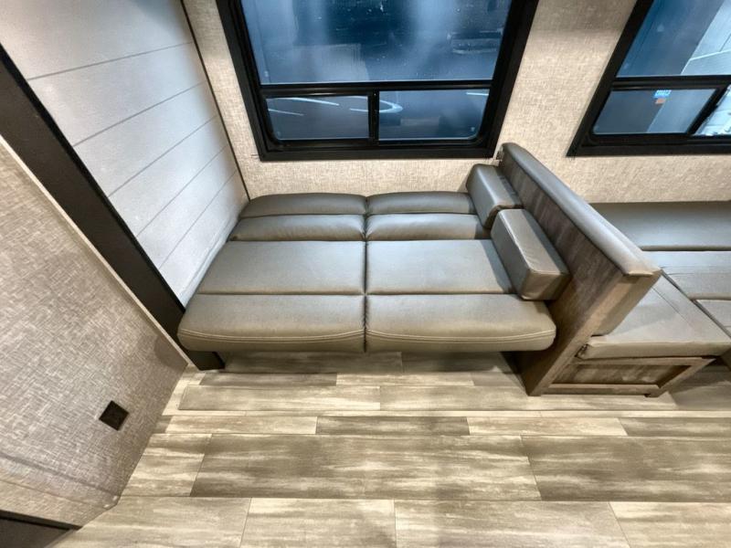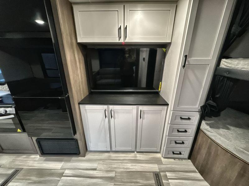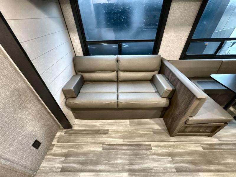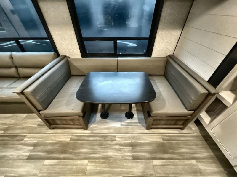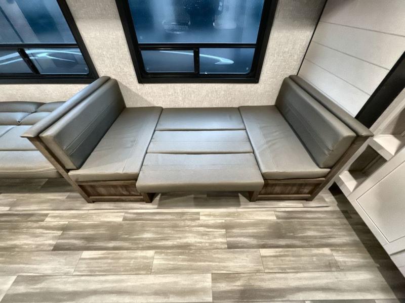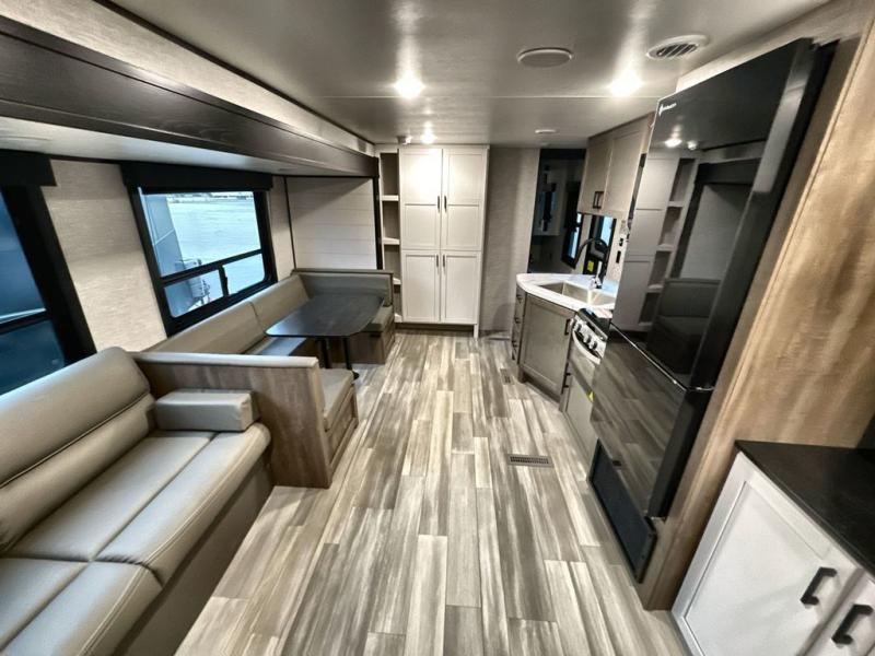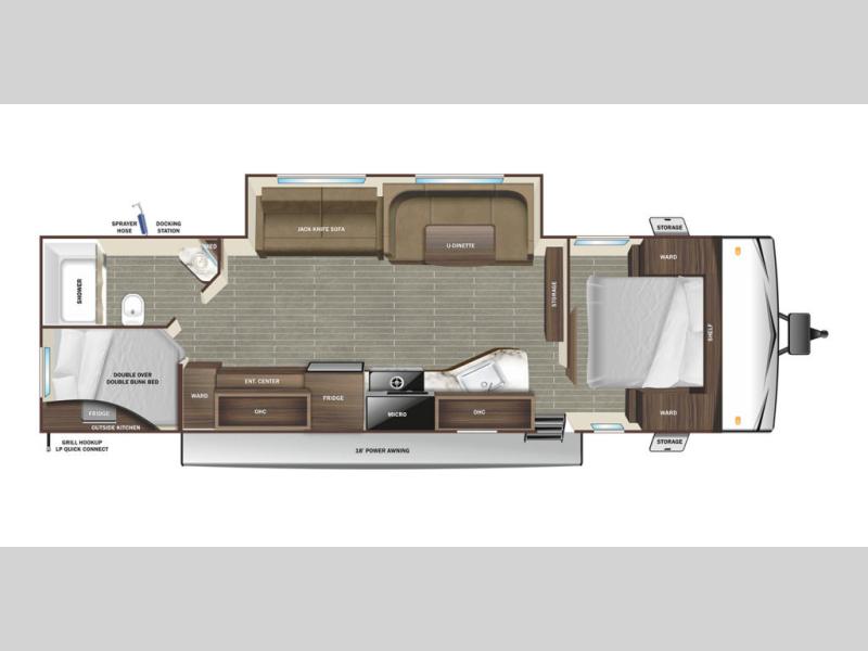 You and the whole family will have a fun time camping in this dual axle trailer! The kiddos can sleep on the corner set double-size bunk beds and you will have your own privacy with the front private bedroom which has wardrobes on either side of the bed. You could even transform the U-shaped dinette and jack-knife sofa slide into extra sleeping spaces for a couple of cousins to tag along too. Everyone will stay squeaky clean with the shower in the rear corner bathroom, and there is even an exterior sprayer hose to wash the mud off your feet before entering inside the trailer. The chef will enjoy cooking delicious meals indoors, but love being able to breathe in some fresh air while cooking at the outside kitchen.