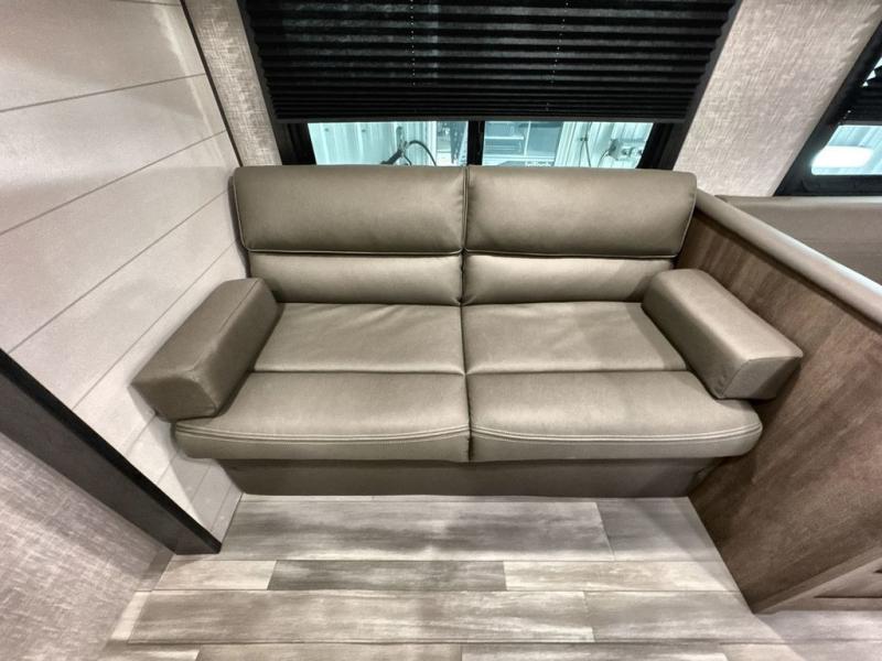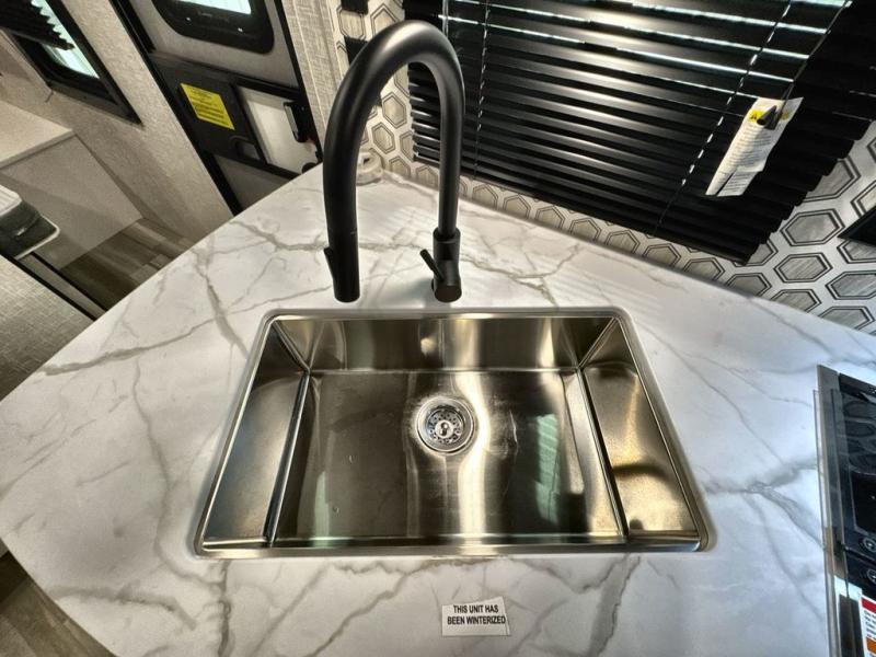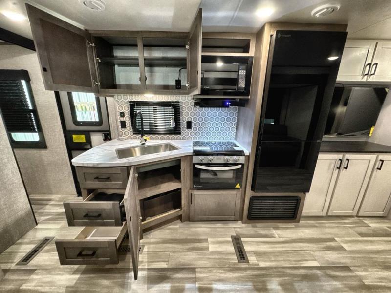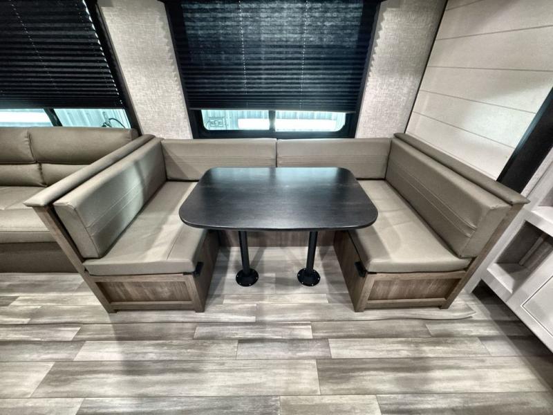 You and the whole family will have a fun time camping in this dual axle trailer! The kiddos can sleep on the corner set double-size bunk beds and you will have your own privacy with the front private bedroom which has wardrobes on either side of the bed. You could even transform the U-shaped dinette and jack-knife sofa slide into extra sleeping spaces for a couple of cousins to tag along too. Everyone will stay squeaky clean with the shower in the rear corner bathroom, and there is even an exterior sprayer hose to wash the mud off your feet before entering inside the trailer. The chef will enjoy cooking delicious meals indoors, but love being able to breathe in some fresh air while cooking at the outside kitchen.