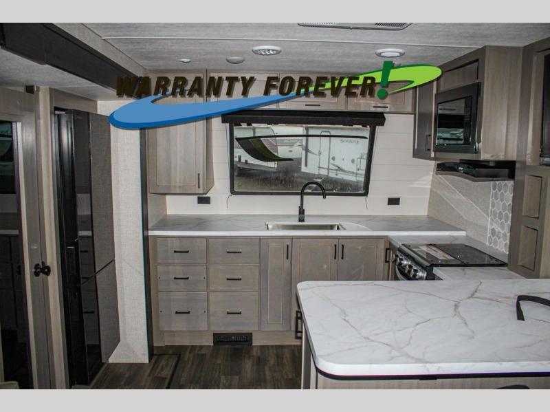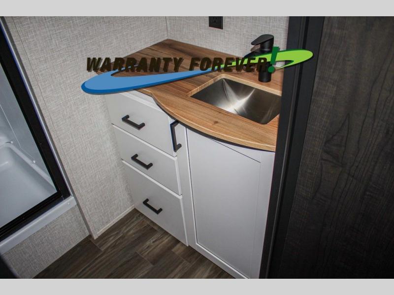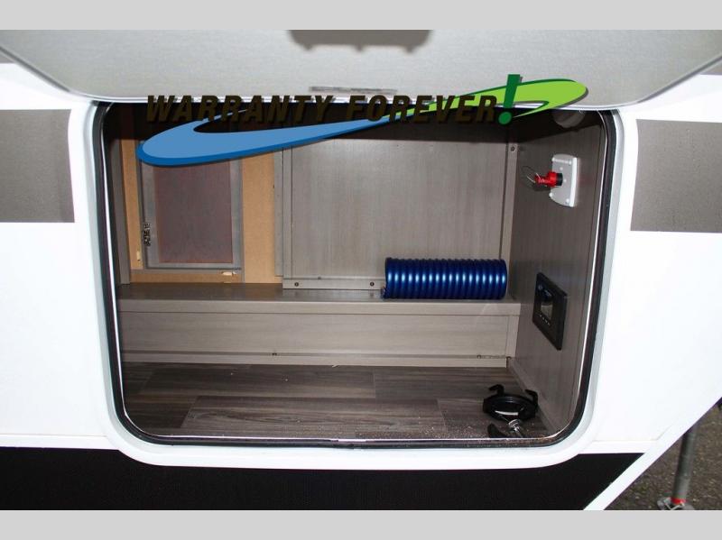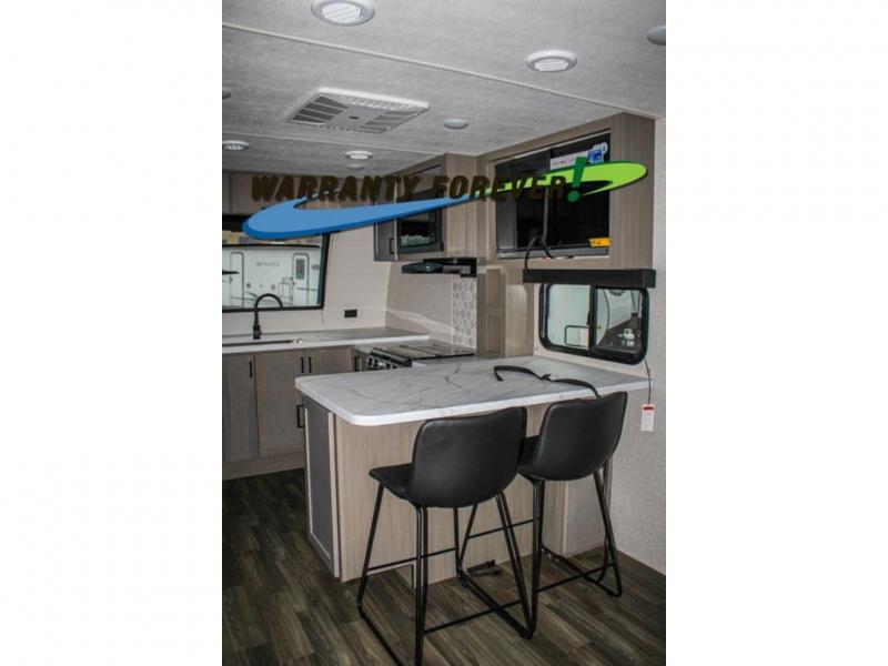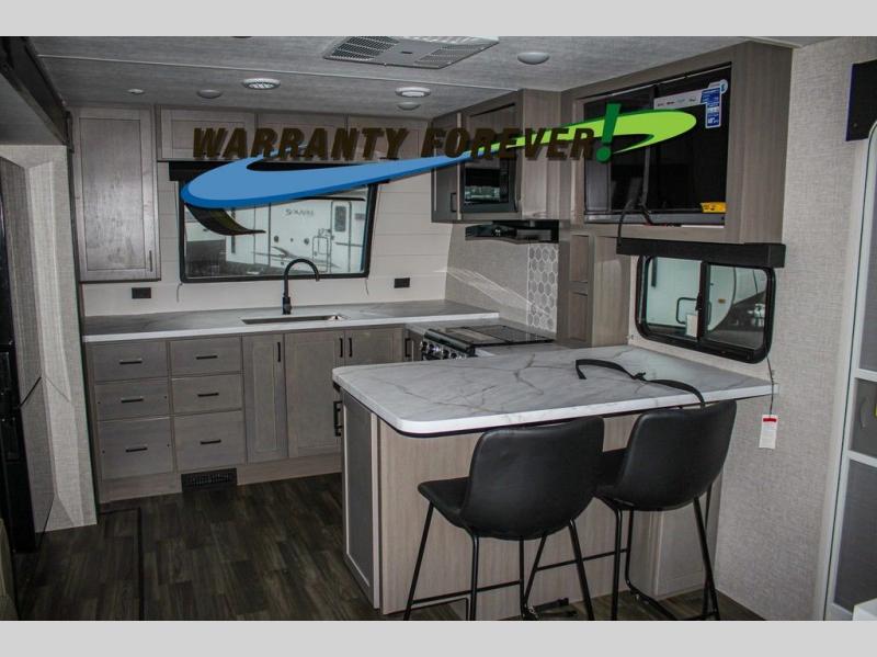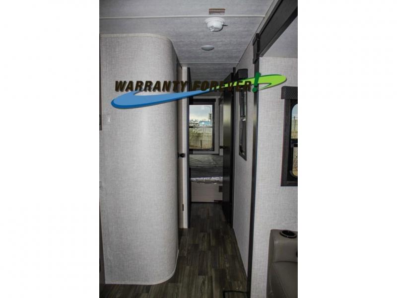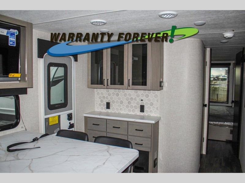 This couple's trailer will be perfect for weekend trips to the campground! The front kitchen includes generous overhead cabinetry, plus a pantry and a hutch for snacks, dishes and more. You can dine at the bartop with chairs and relax on the theater seats after dinner. A mid-coach full bath will let you freshen up each day, and a rear private bedroom is sure to make you feel right at home. Here, you'll find a king bed slide, a closet and a dresser for storage, plus one of the dual entry doors for added convenience. This travel trailer also includes a bath closet with washer and dryer prep if you choose to add these appliances.