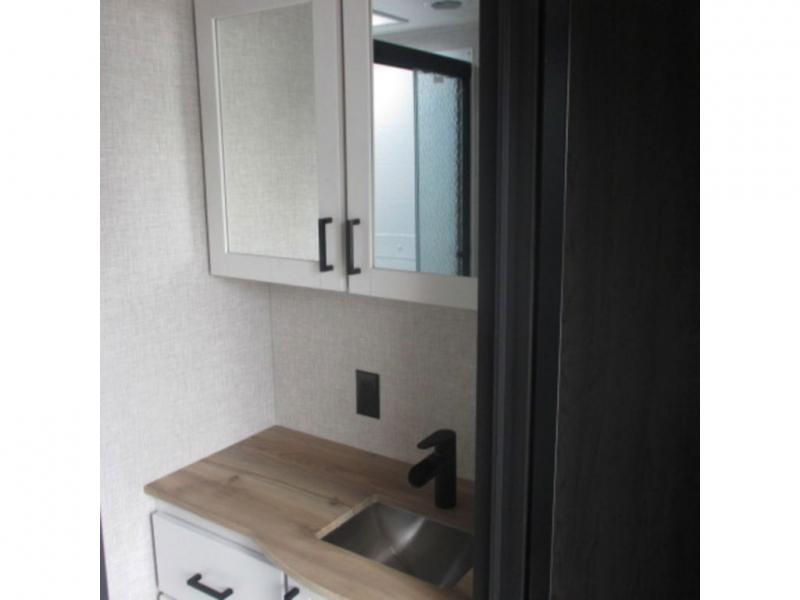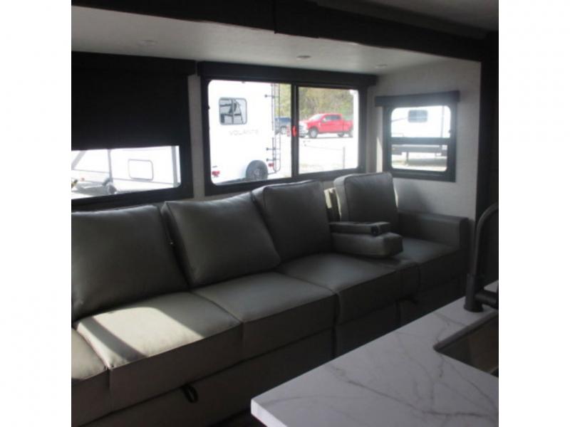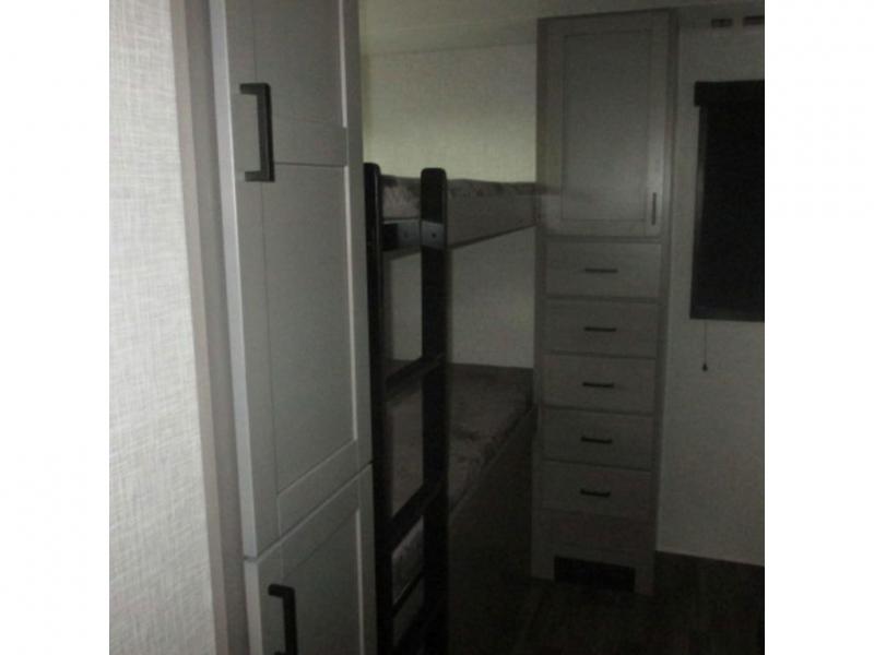 This travel trailer will have you feeling right at home! The rear private bunkhouse has plenty of space for the kiddos to move around, as well as a set of double-size bunks with a ladder and two wardrobes. There is also a slide with a flip-up bunk above a jackknife sofa for even more sleeping space. Everyone can gather together and either relax on the theater seating across from the entertainment center with a fireplace and Smart HDTV or play a game at the booth dinette. The kitchen island makes meal prepping easier and you can store your dishes in the hutch. You could even cook your meals while breathing in some fresh air with the outside kitchen which also has a refrigerator to keep your beverages cold. There's a full bathroom to stay clean and a closet in the front private bedroom with washer and dryer prep for the option to add these appliances.