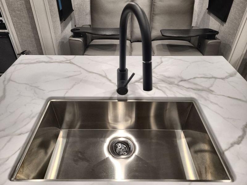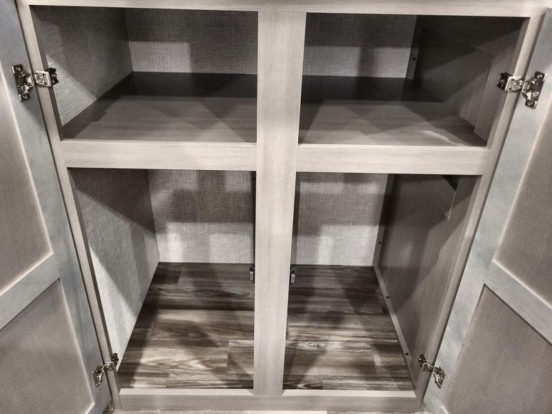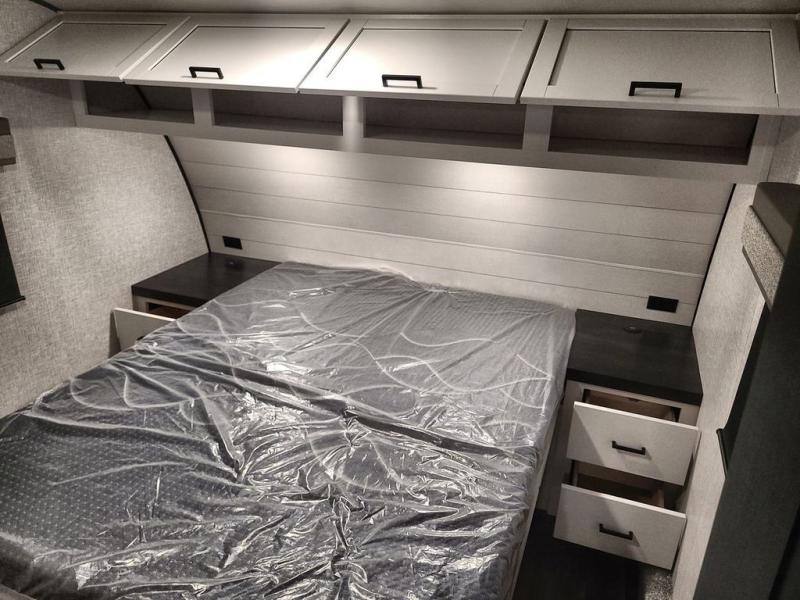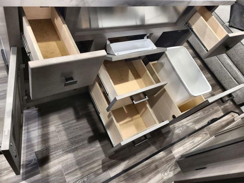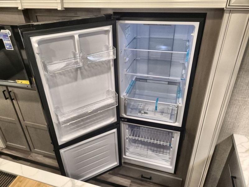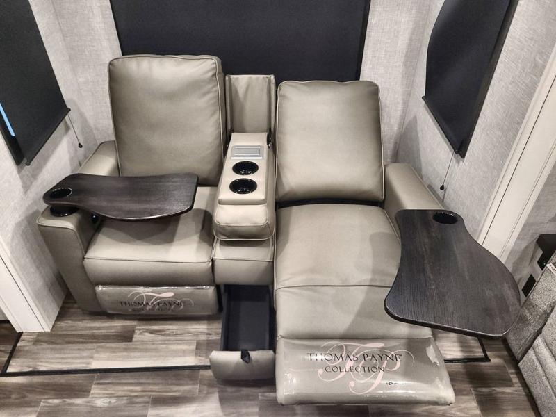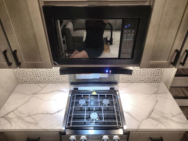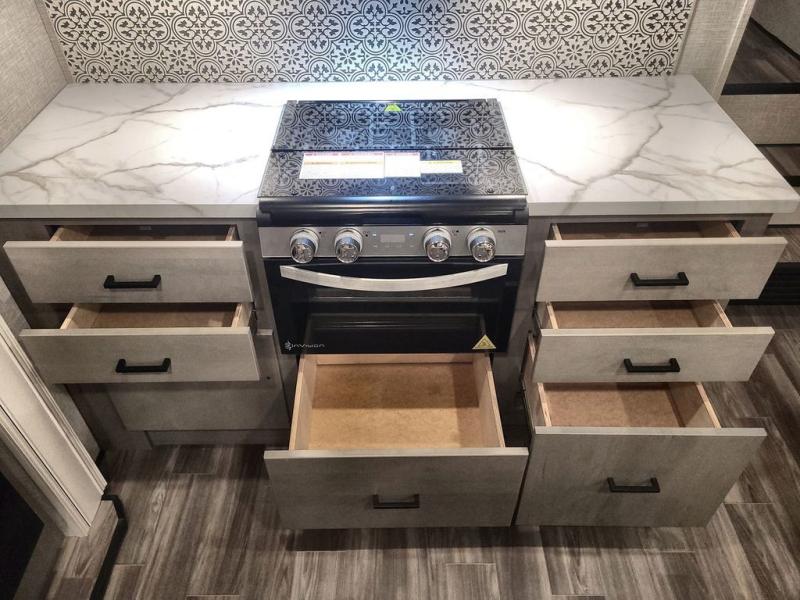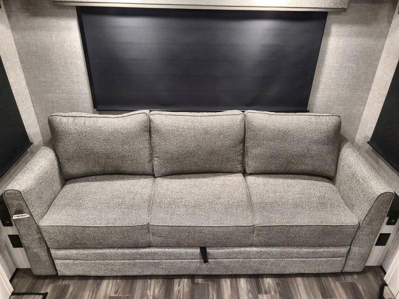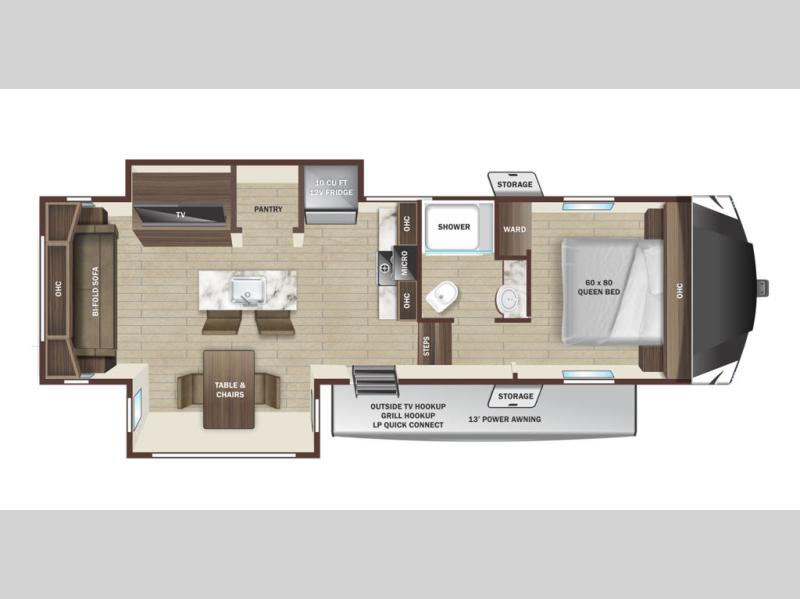 Start living your best camping lifestyle in this fifth wheel! A rear bi-fold sofa offers a comfortable place to relax after swimming in the water. When your stomach starts rumbling head to the fully equipped kitchen to prepare a meal with the three burner cooktop, large pantry, and kitchen island with two bar stools so you can sit down while chopping veggies. The table with four chairs slide offers a comfortable place to dine at, but you could also switch it out for an optional theater seat for more comfort. The full bathroom has a shower for you to rinse the sand out of your hair, and the front private bedroom has a queen bed for you to get a good night's rest. The exterior has storage space, a 13' power awning, an outside TV hook-up area, and grill hook-up area!
