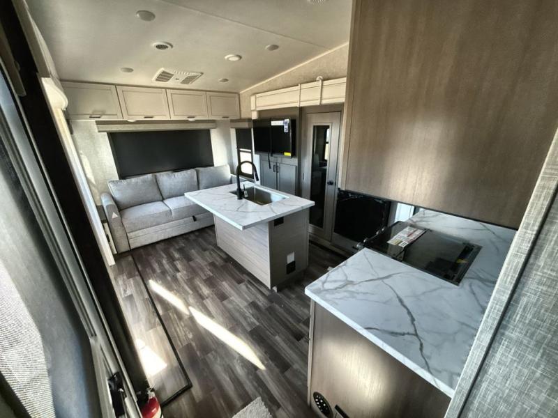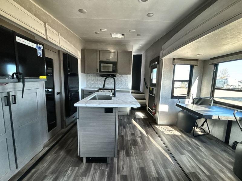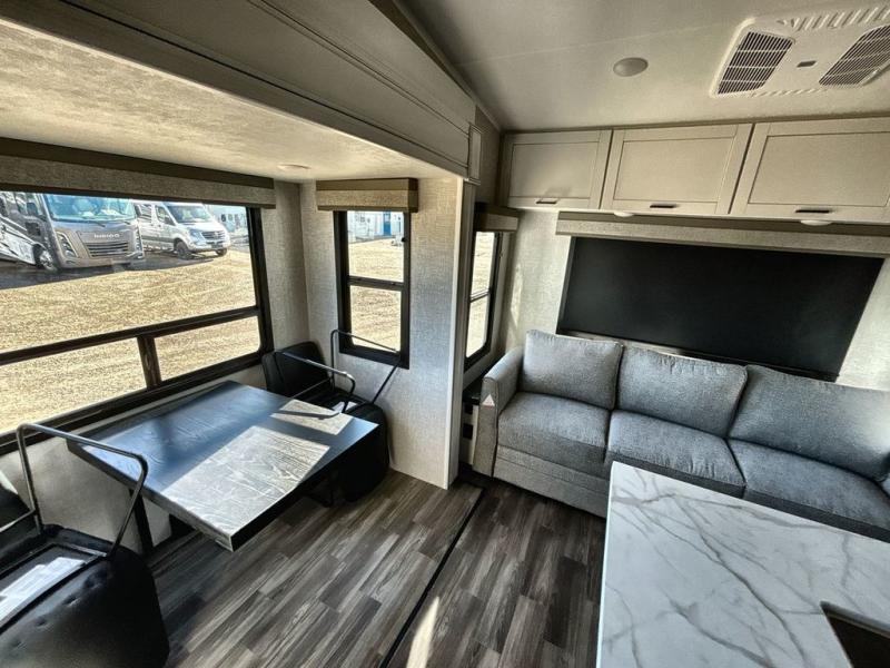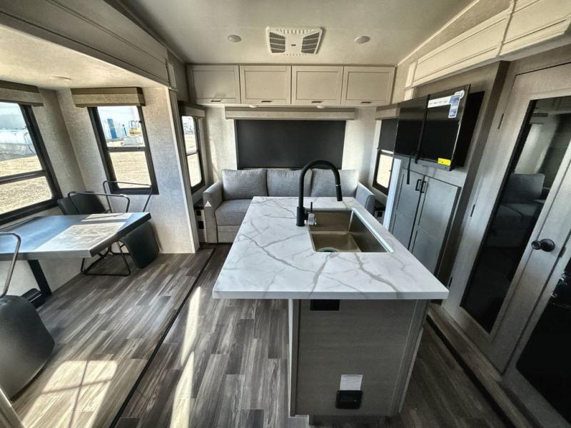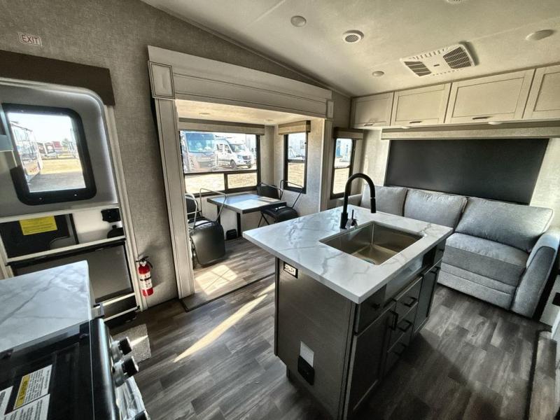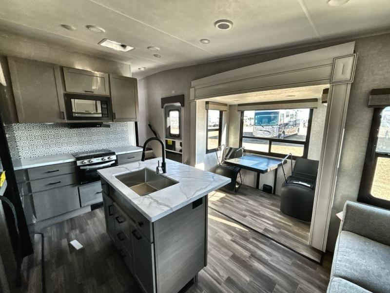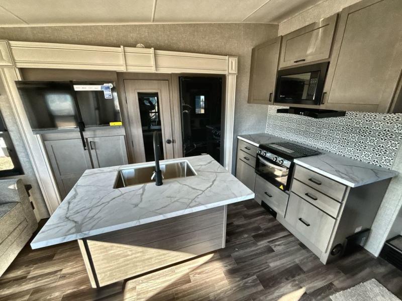 Start living your best camping lifestyle in this fifth wheel! A rear bi-fold sofa offers a comfortable place to relax after swimming in the water. When your stomach starts rumbling head to the fully equipped kitchen to prepare a meal with the three burner cooktop, large pantry, and kitchen island with two bar stools so you can sit down while chopping veggies. The table with four chairs slide offers a comfortable place to dine at, but you could also switch it out for an optional theater seat for more comfort. The full bathroom has a shower for you to rinse the sand out of your hair, and the front private bedroom has a queen bed for you to get a good night's rest. The exterior has storage space, a 13' power awning, an outside TV hook-up area, and grill hook-up area!