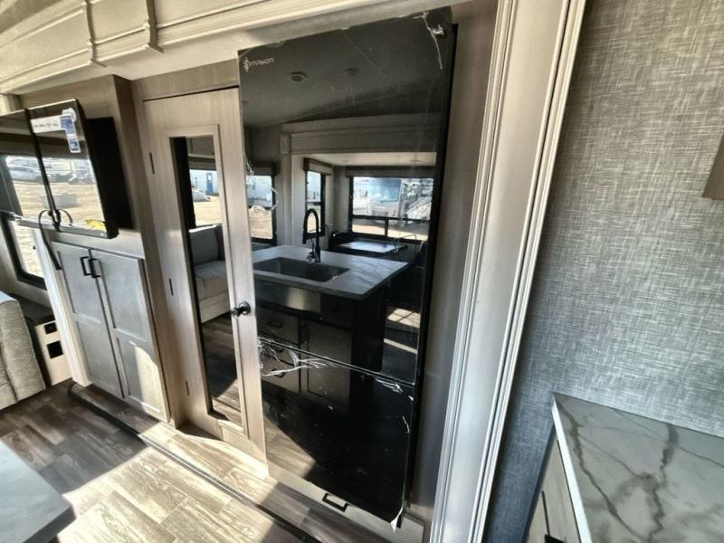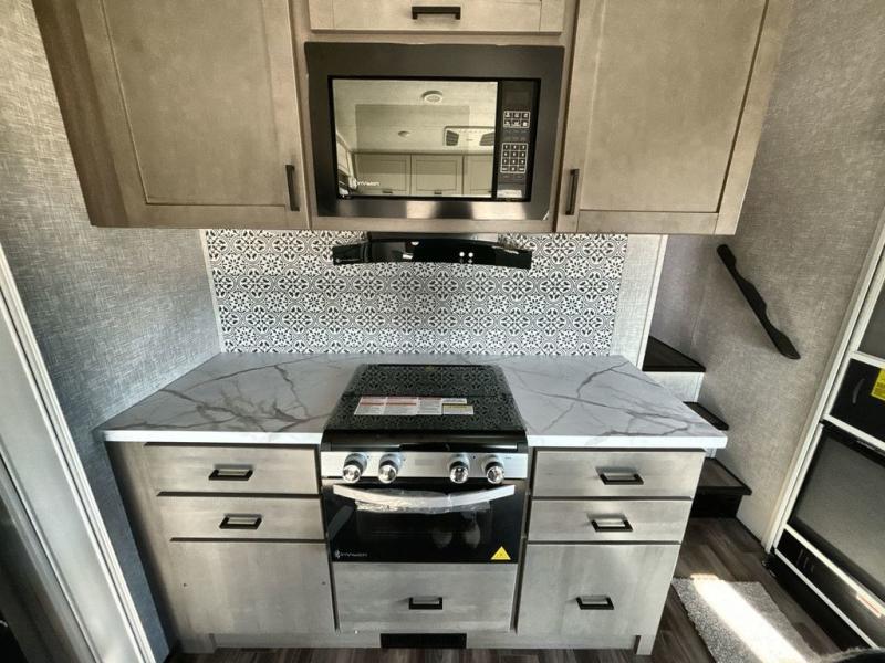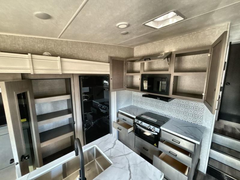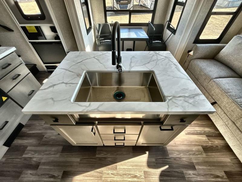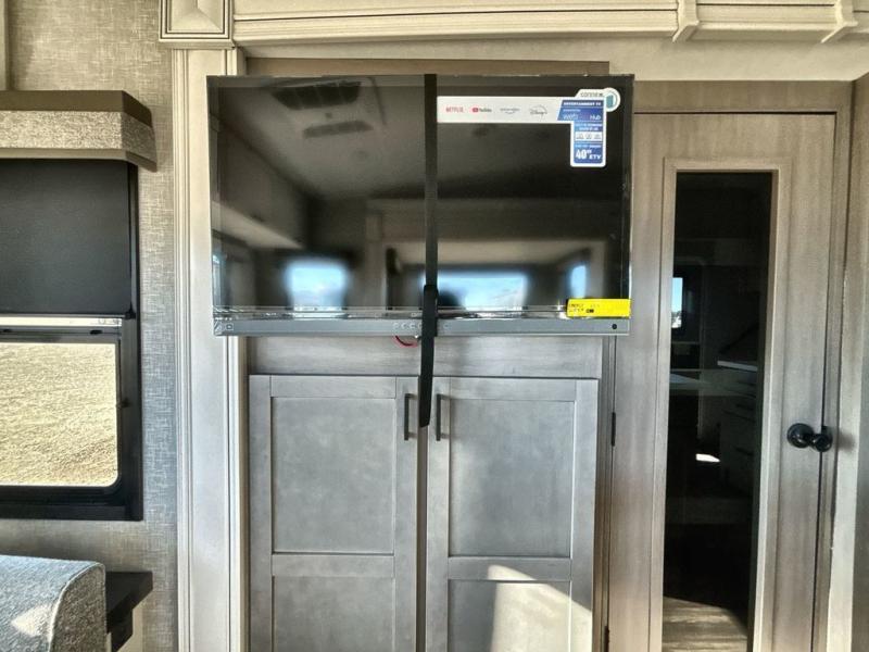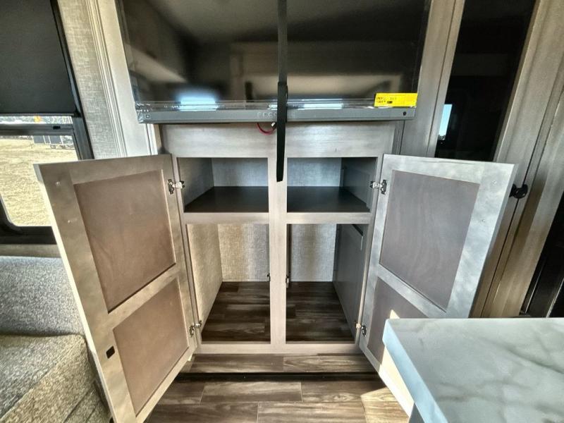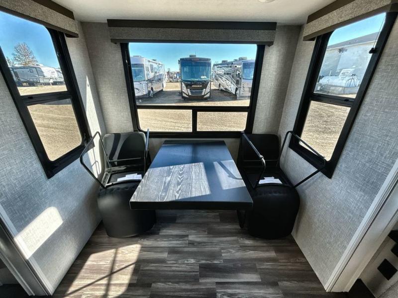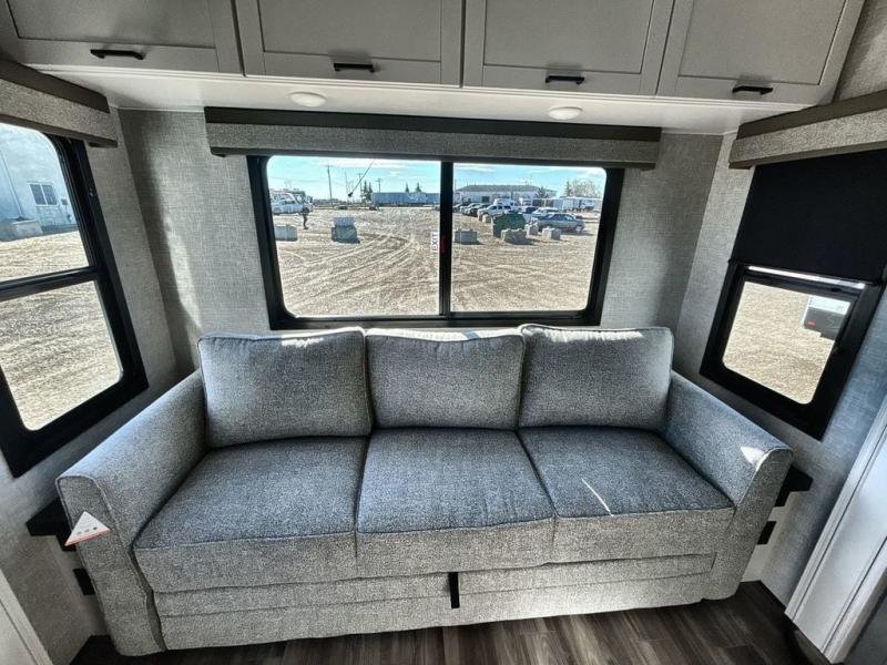 Start living your best camping lifestyle in this fifth wheel! A rear bi-fold sofa offers a comfortable place to relax after swimming in the water. When your stomach starts rumbling head to the fully equipped kitchen to prepare a meal with the three burner cooktop, large pantry, and kitchen island with two bar stools so you can sit down while chopping veggies. The table with four chairs slide offers a comfortable place to dine at, but you could also switch it out for an optional theater seat for more comfort. The full bathroom has a shower for you to rinse the sand out of your hair, and the front private bedroom has a queen bed for you to get a good night's rest. The exterior has storage space, a 13' power awning, an outside TV hook-up area, and grill hook-up area!