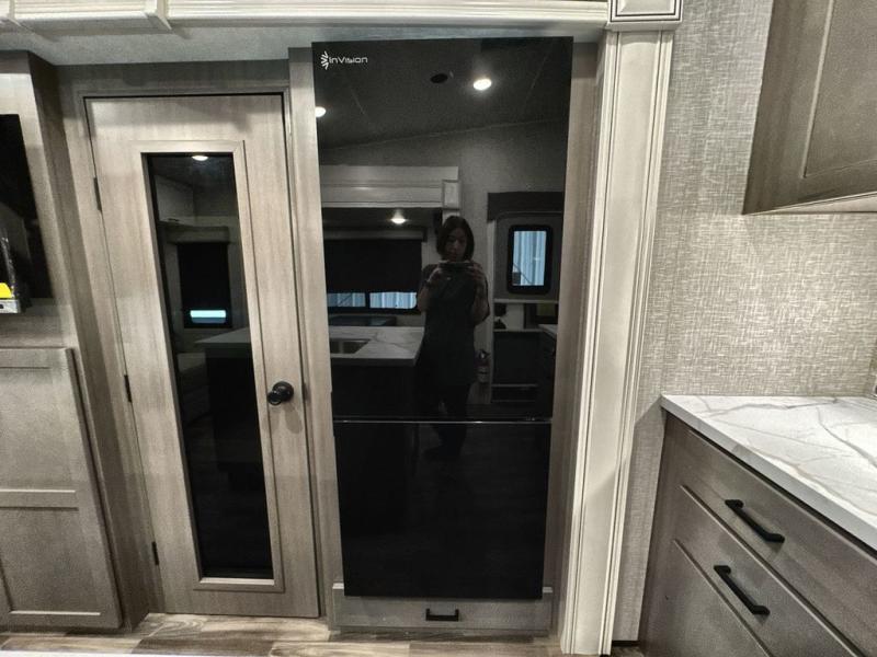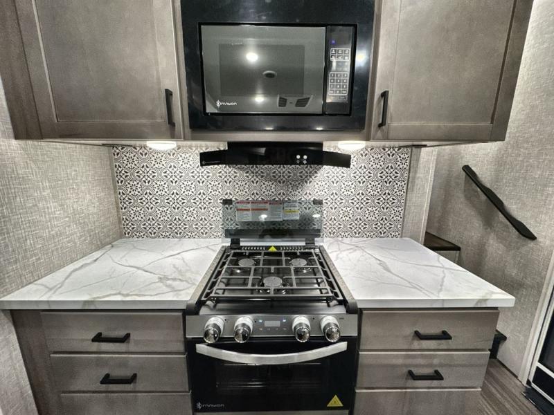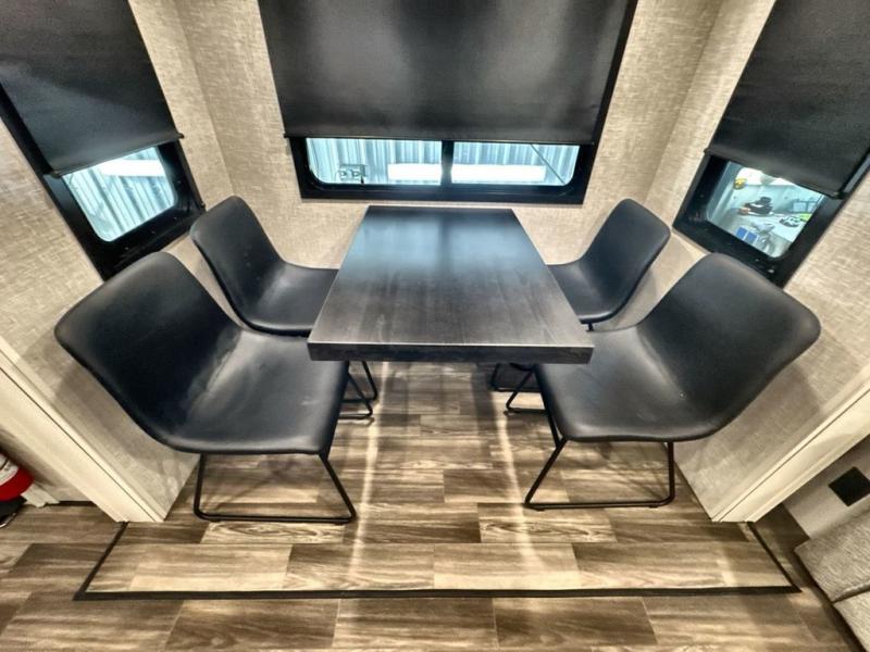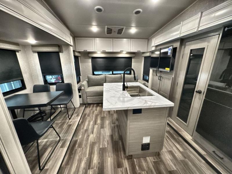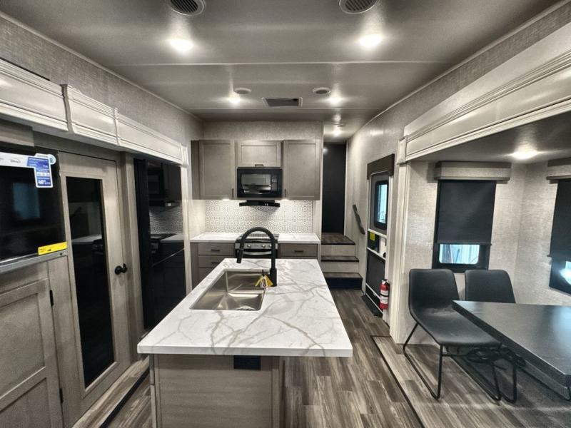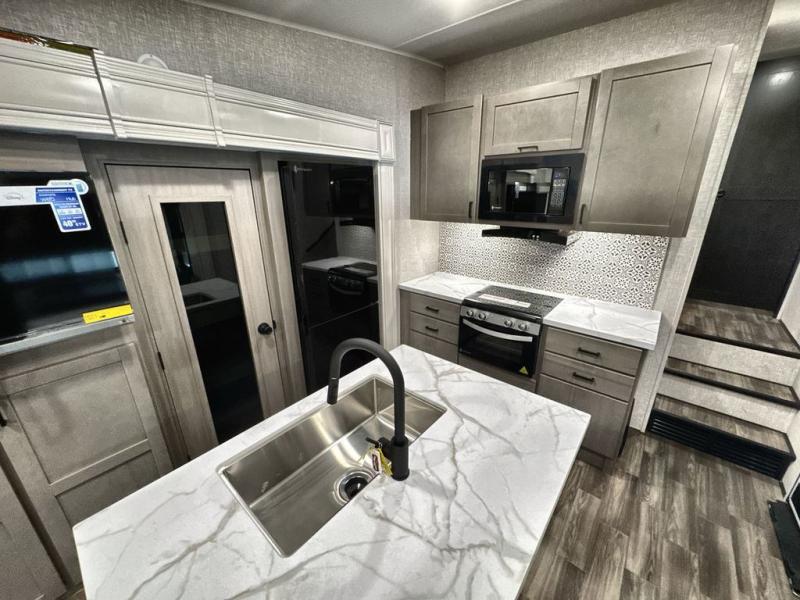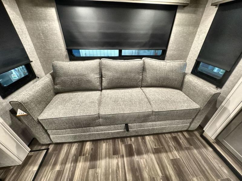 Start living your best camping lifestyle in this fifth wheel! A rear bi-fold sofa offers a comfortable place to relax after swimming in the water. When your stomach starts rumbling head to the fully equipped kitchen to prepare a meal with the three burner cooktop, large pantry, and kitchen island with two bar stools so you can sit down while chopping veggies. The table with four chairs slide offers a comfortable place to dine at, but you could also switch it out for an optional theater seat for more comfort. The full bathroom has a shower for you to rinse the sand out of your hair, and the front private bedroom has a queen bed for you to get a good night's rest. The exterior has storage space, a 13' power awning, an outside TV hook-up area, and grill hook-up area!
