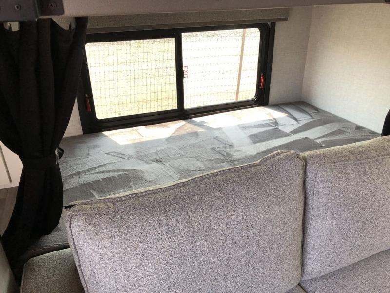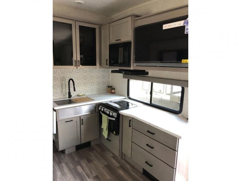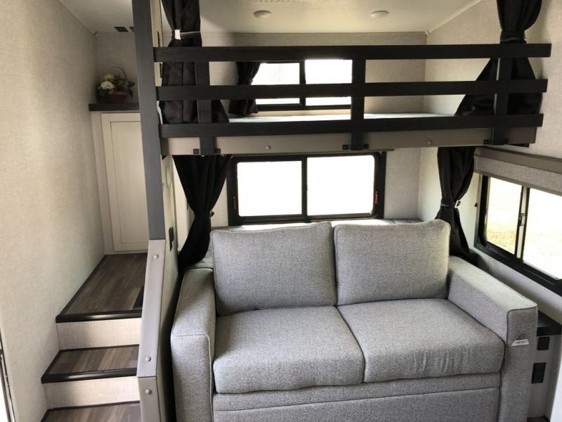 There is much to love about this fifth wheel! Starting with the 54" x 74" top bunk above a 38" x 74" bottom bunk behind the tri-fold sofa in the rear. The booth dinette is great for enjoying delicious meals prepared with the three burner cooktop and 10 cu. ft. refrigerator, plus it can transform into an extra sleeping space when needed. Everyone can freshen up in the full bathroom with the shower and there is even an outside shower to rinse your feet off before entering inside. You will feel right at home in the front private bedroom with a queen bed. The outside not only has storage space and an 18' power awning to protect you rain or shine, but also a TV hook-up area, grill hook-up, and LP quick connect!