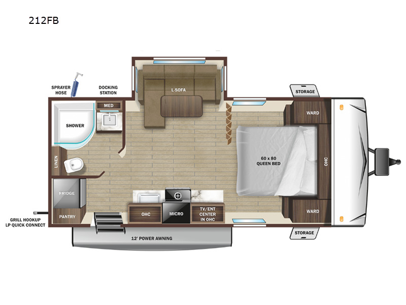 Get ready for some fun and relaxation with this trailer setup at your favorite campground! After enjoying the outdoors and everything it has to offer, you can whip up a meal in the galley kitchen with full amenities and clean the dishes with a single basin stainless steel under-mount kitchen sink with a residential high-rise faucet. The smart HDTV will provide inside entertainment as you relax on the L-shaped sofa with a table to dine at, and this space doubles as a sleeping area at night. The front bedroom offers a privacy curtain, a queen bed, dual wardrobes, and electric outlets and USB ports. And everyone can take turns getting cleaned up in the rear corner bathroom which offers linen storage after hanging out under the 12' power awning.