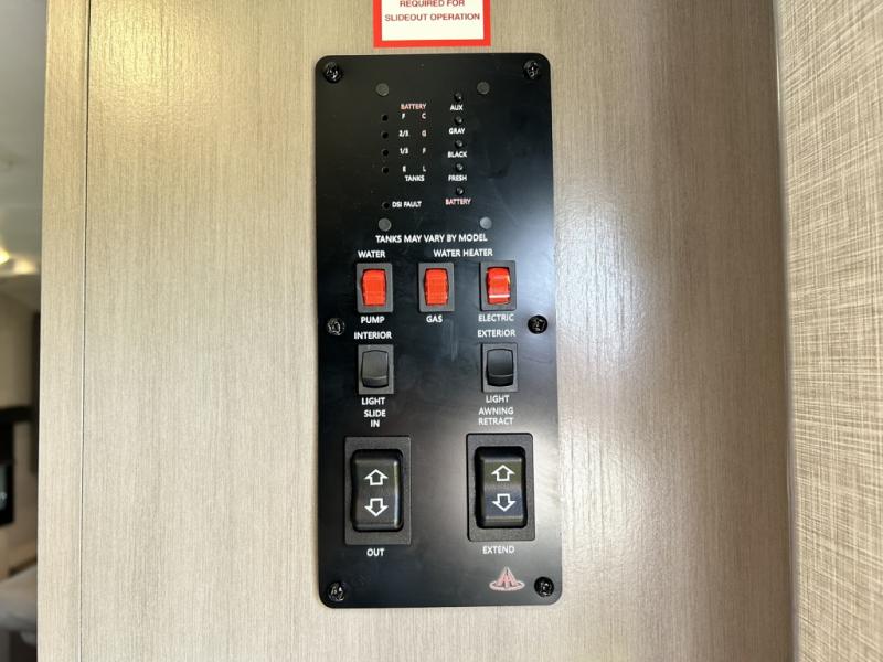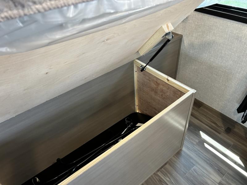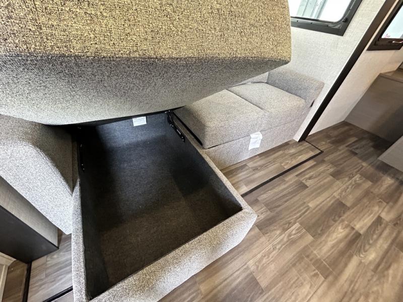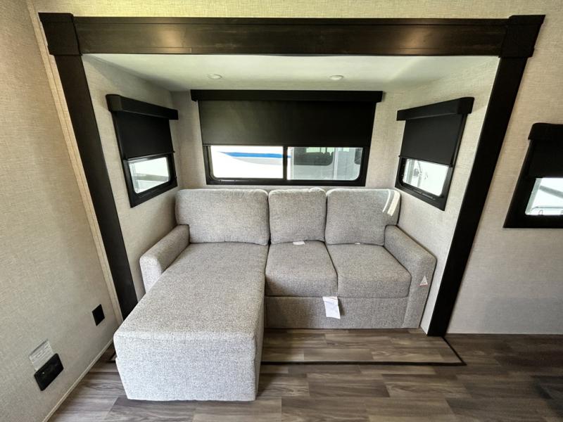 With any Starcraft Super Lite travel trailer, the solid and lightweight construction includes a fully walkable roof with a PVC roofing membrane that easily reflects solar heat and UV rays and TuffShell vacuum bonded laminated construction, reinforced with heavy-duty fiberglass and welded aluminum frames. There is also a molded front cap with LED lighting to protect against elements, a power tongue jack for easy towing, plus a power awning with LED lighting. The interior is spacious with an 81" living room ceiling height, hardwood cabinet doors, and flush floor slides with residential vinyl flooring and pressed membrane countertops for easy cleanup. Don't wait for your next adventure, take a Super Lite with you today!
