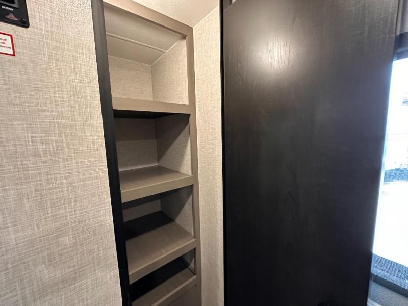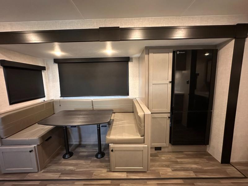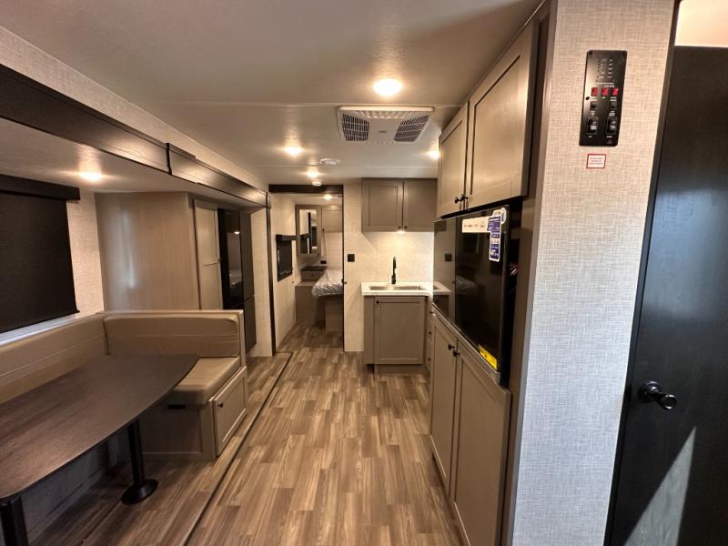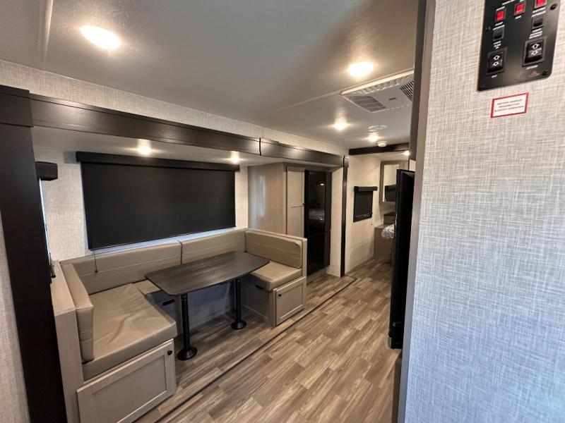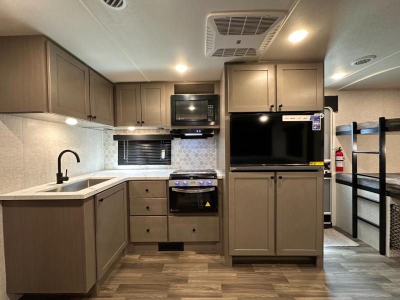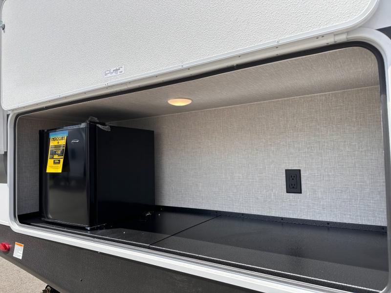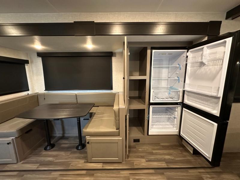 This trailer allows a bigger group enough space to sleep eight, plus an inside kitchen with full amenities and an outside kitchen to feed everyone! The combined living and kitchen area is spacious with a large slide out that includes the U-shaped dinette which doubles as sleeping space, a pantry and the 10 cu. ft. 12V refrigerator which allows more floor space when inside. The cook will enjoy the L-shaped area to make meals with overhead storage for cooking items, and everyone can watch the smart HDTV/entertainment center, and there is a second pantry behind the TV for even more storage. The full bathroom will keep everyone clean before bedtime, and the exterior spray port will keep your shoes and bikes clean.