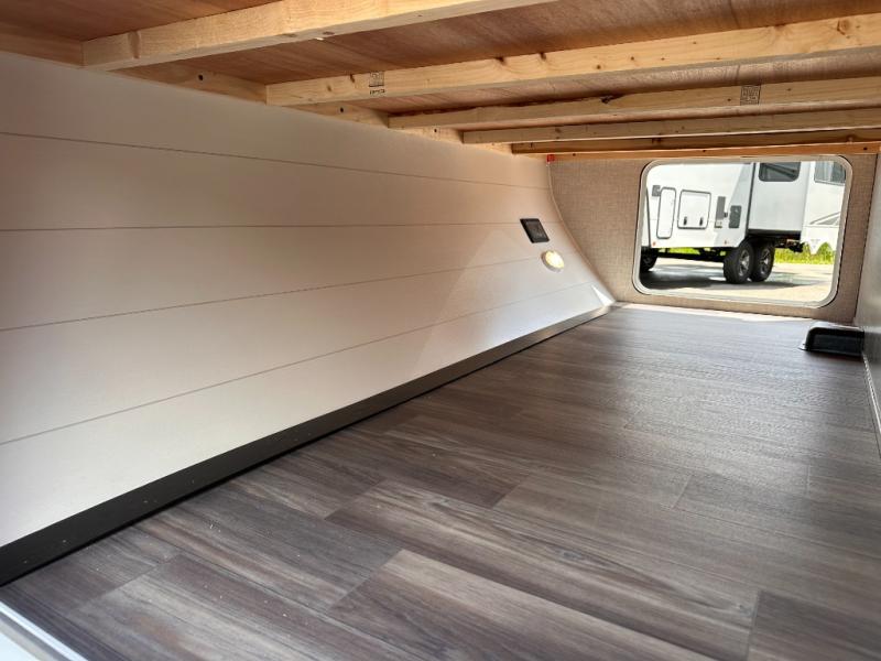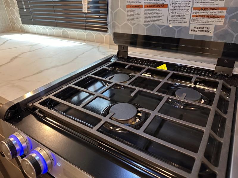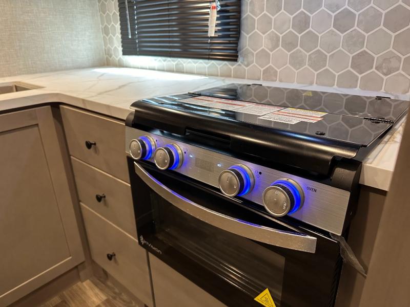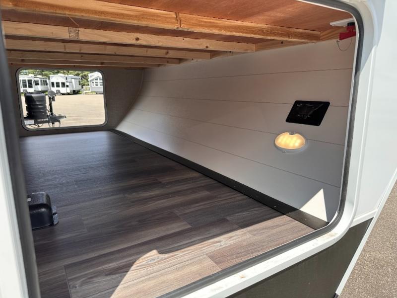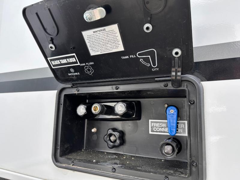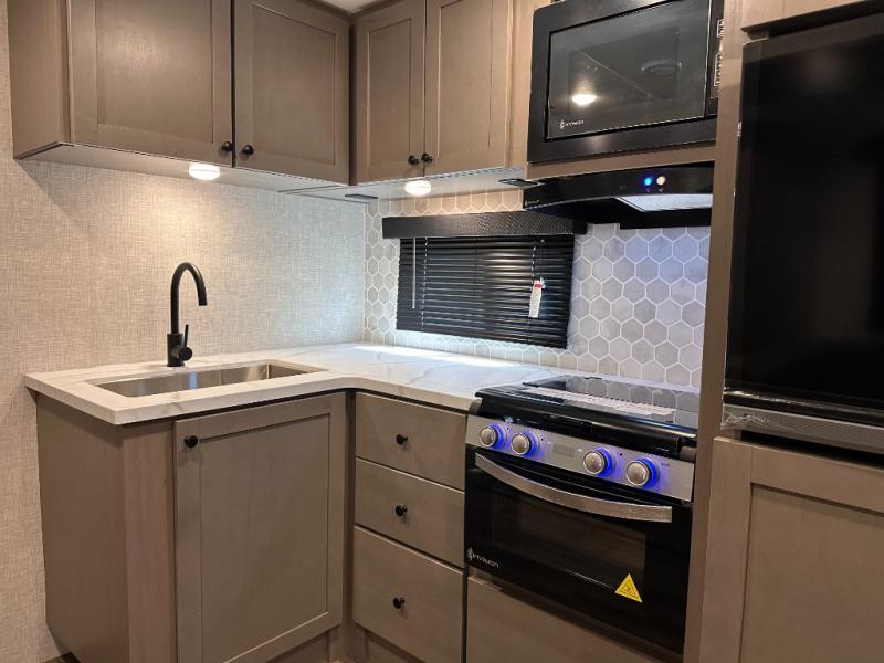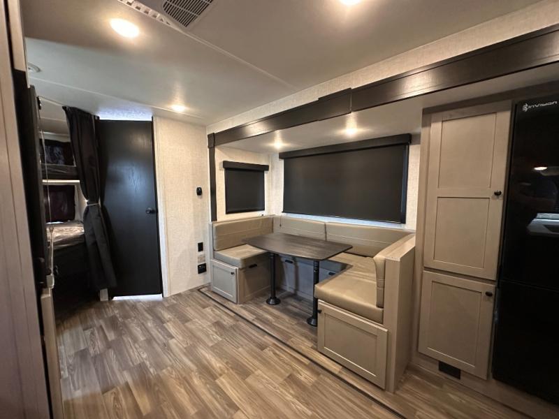 This trailer allows a bigger group enough space to sleep eight, plus an inside kitchen with full amenities and an outside kitchen to feed everyone! The combined living and kitchen area is spacious with a large slide out that includes the U-shaped dinette which doubles as sleeping space, a pantry and the 10 cu. ft. 12V refrigerator which allows more floor space when inside. The cook will enjoy the L-shaped area to make meals with overhead storage for cooking items, and everyone can watch the smart HDTV/entertainment center, and there is a second pantry behind the TV for even more storage. The full bathroom will keep everyone clean before bedtime, and the exterior spray port will keep your shoes and bikes clean.