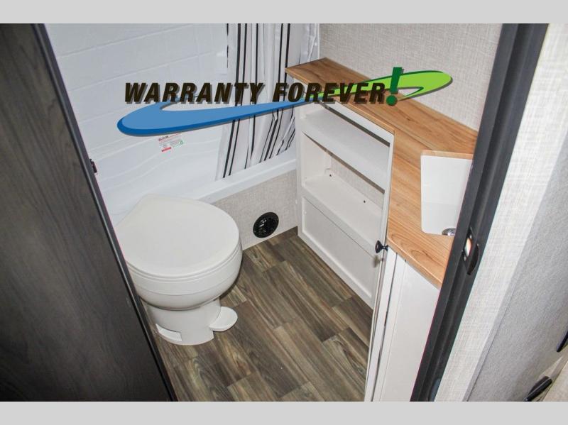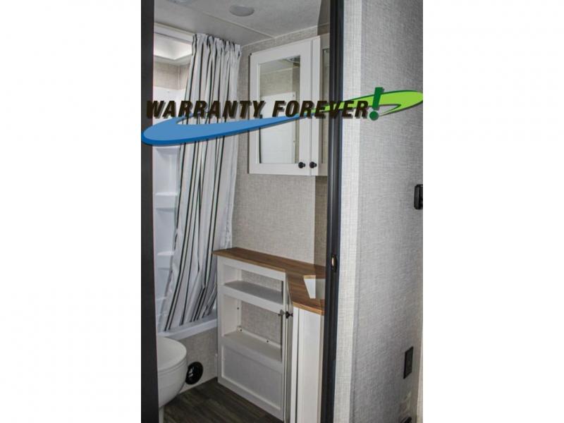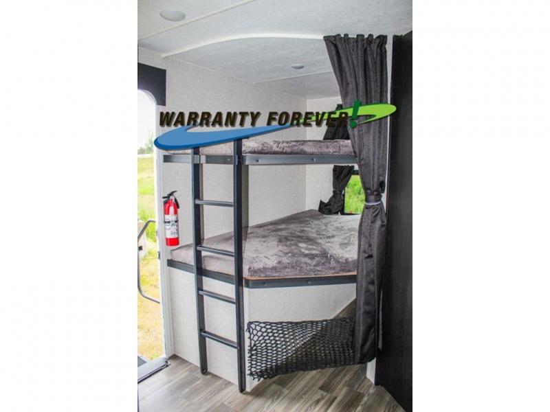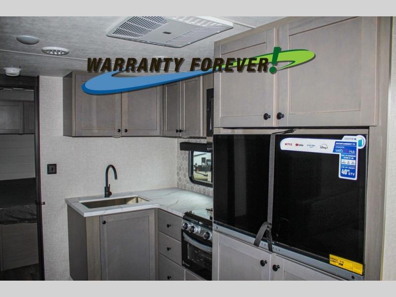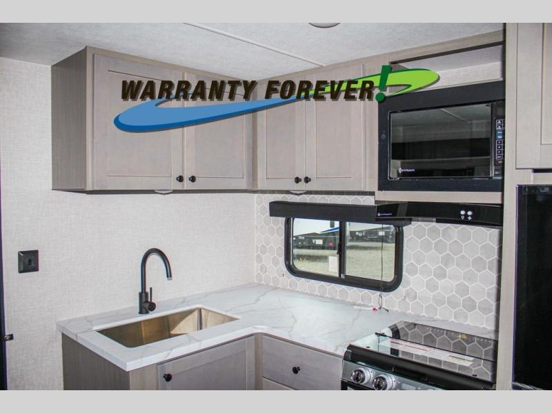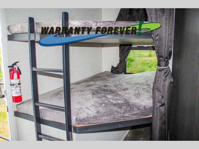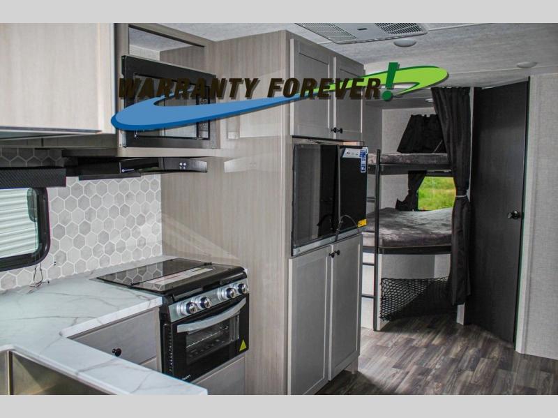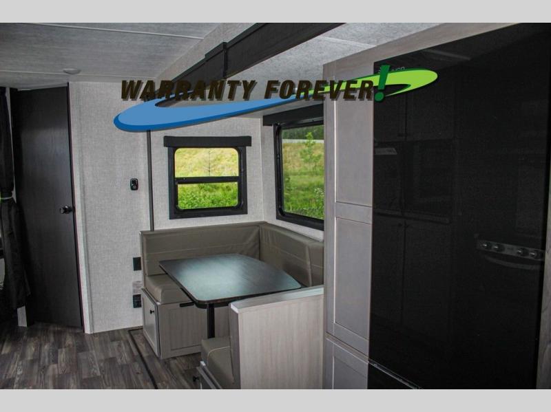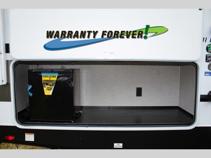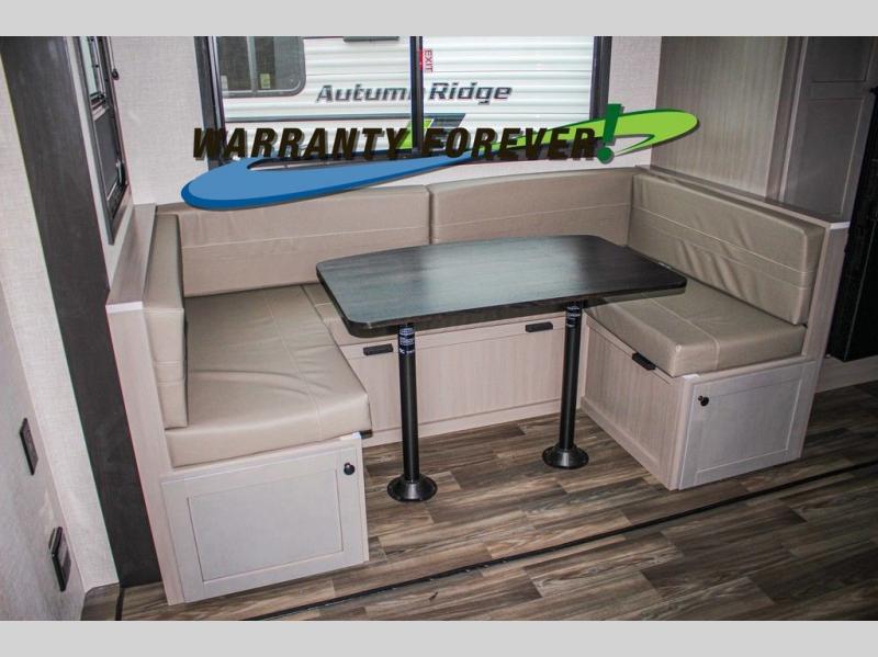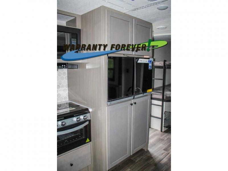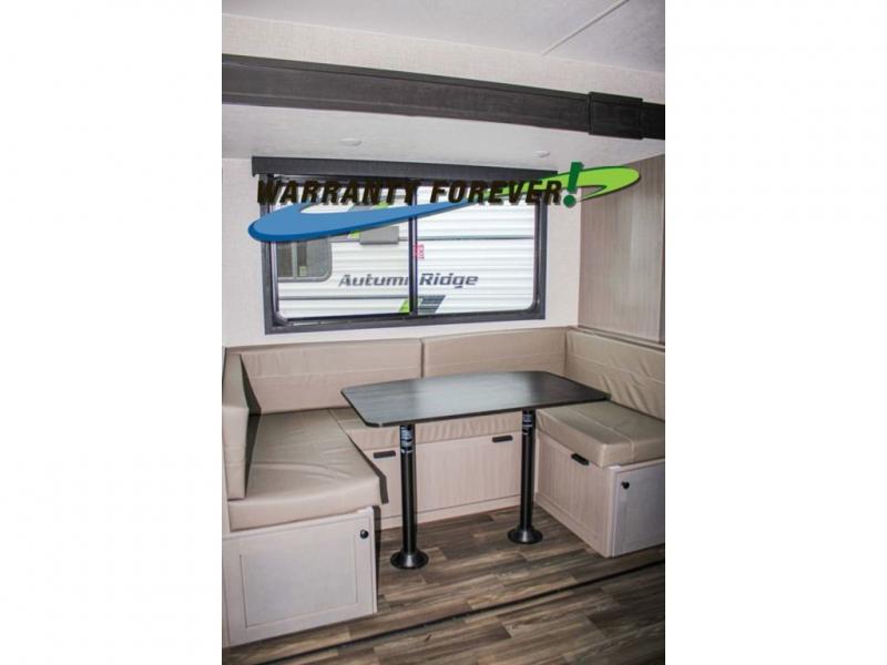 This trailer allows a bigger group enough space to sleep eight, plus an inside kitchen with full amenities and an outside kitchen to feed everyone! The combined living and kitchen area is spacious with a large slide out that includes the U-shaped dinette which doubles as sleeping space, a pantry and the 10 cu. ft. 12V refrigerator which allows more floor space when inside. The cook will enjoy the L-shaped area to make meals with overhead storage for cooking items, and everyone can watch the smart HDTV/entertainment center, and there is a second pantry behind the TV for even more storage. The full bathroom will keep everyone clean before bedtime, and the exterior spray port will keep your shoes and bikes clean.