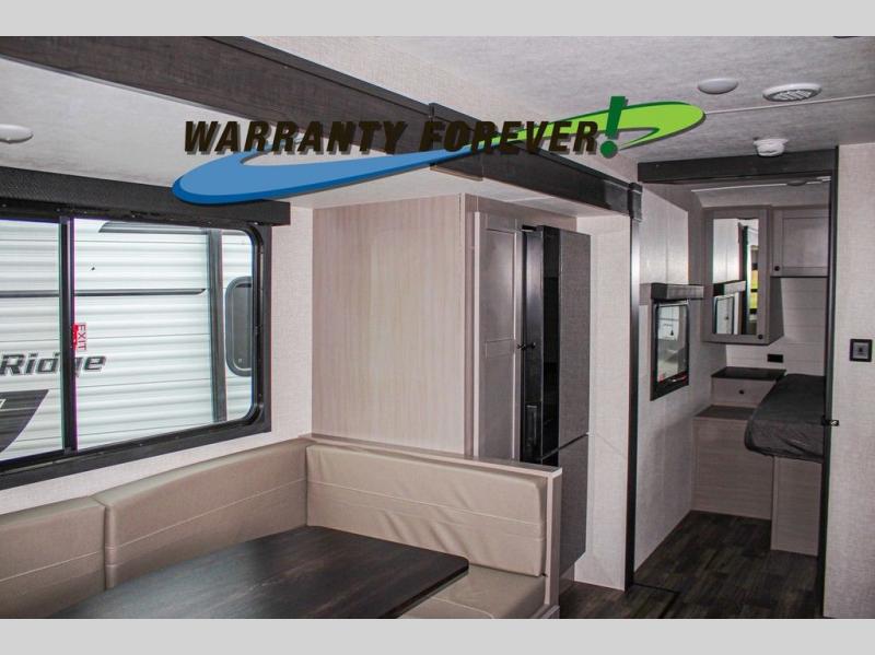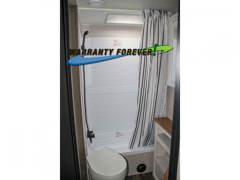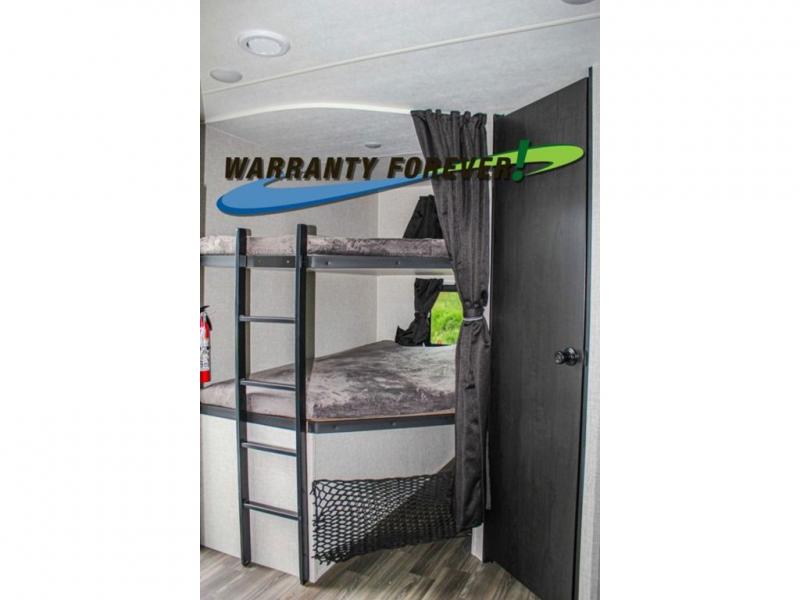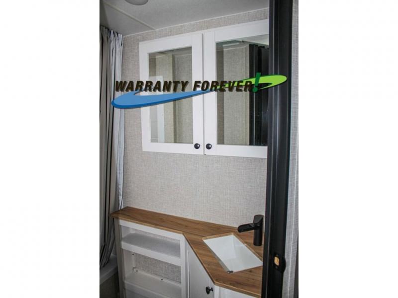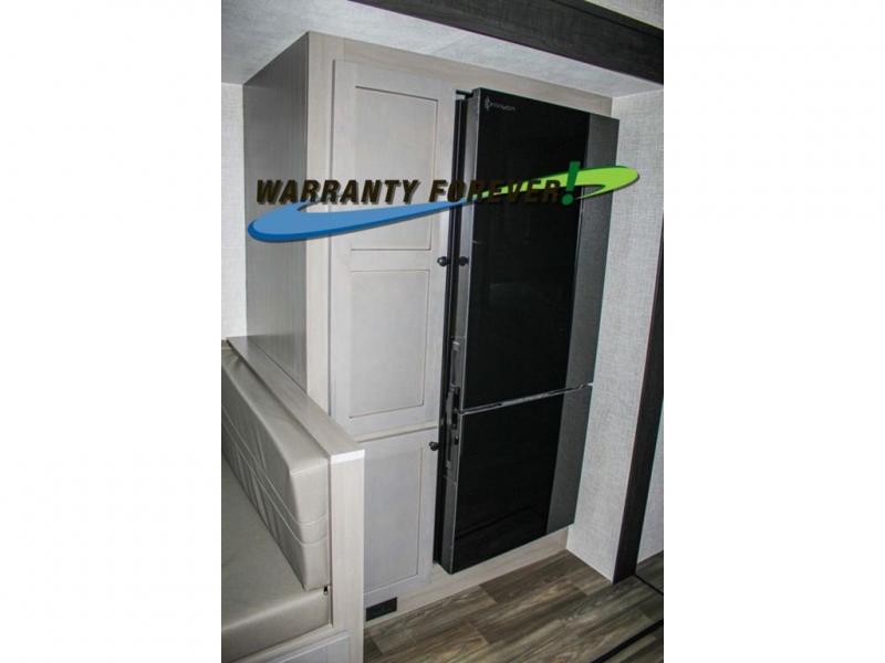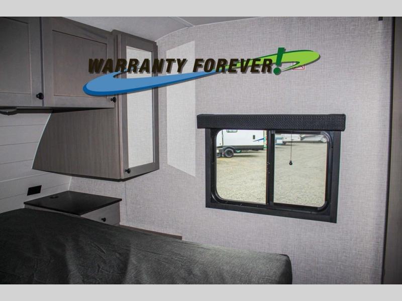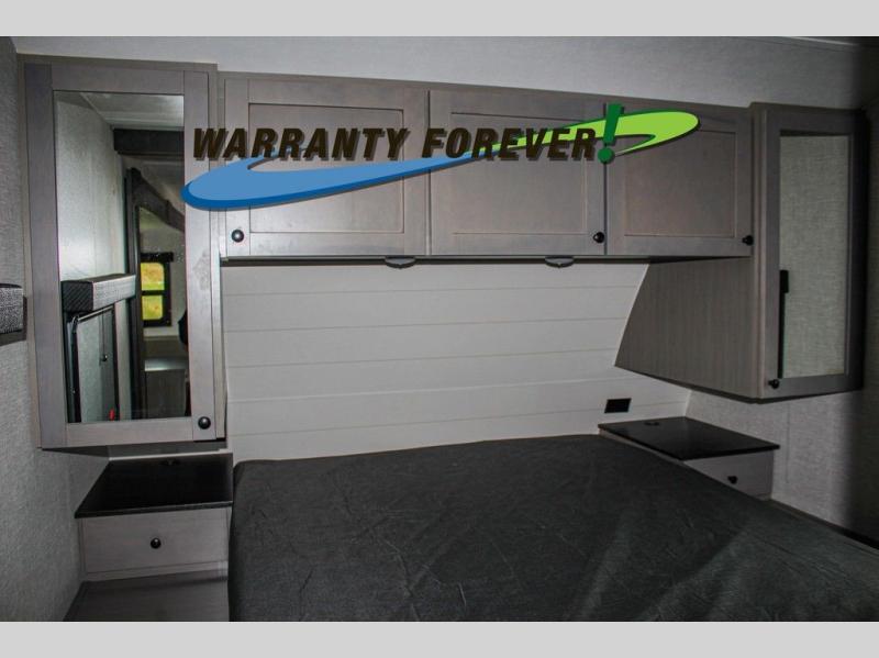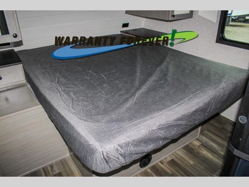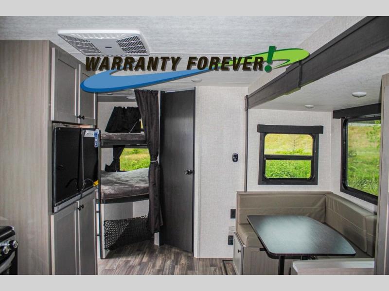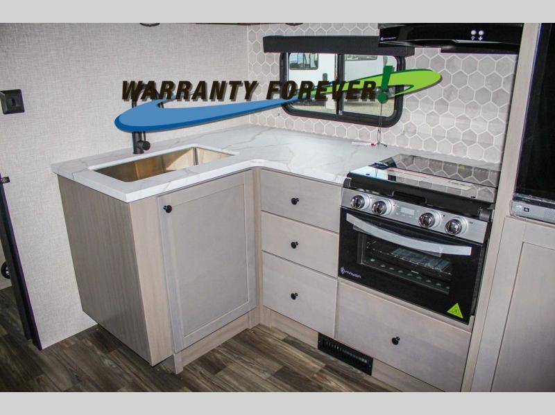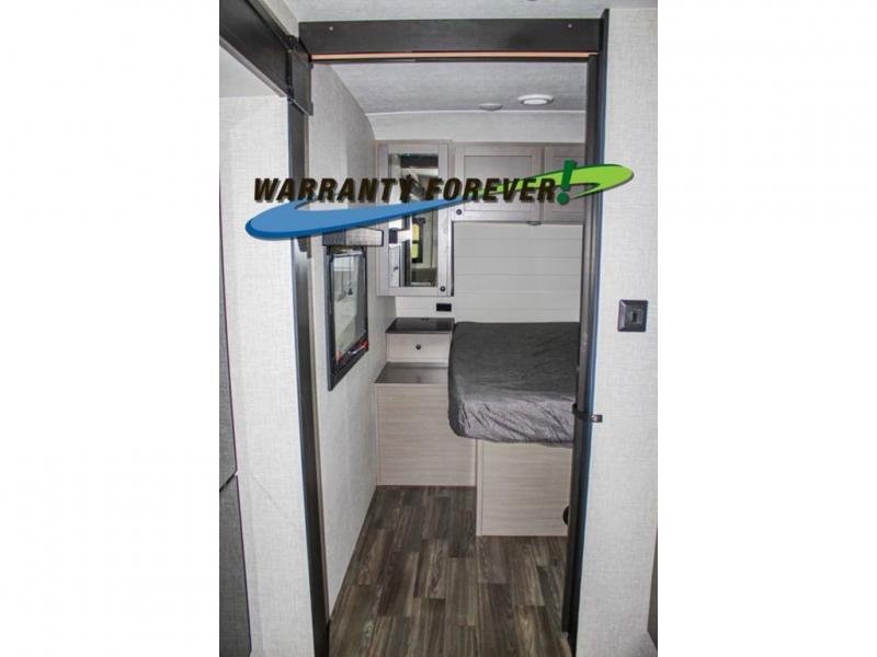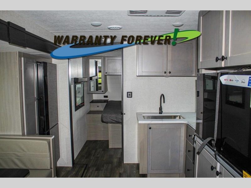 This trailer allows a bigger group enough space to sleep eight, plus an inside kitchen with full amenities and an outside kitchen to feed everyone! The combined living and kitchen area is spacious with a large slide out that includes the U-shaped dinette which doubles as sleeping space, a pantry and the 10 cu. ft. 12V refrigerator which allows more floor space when inside. The cook will enjoy the L-shaped area to make meals with overhead storage for cooking items, and everyone can watch the smart HDTV/entertainment center, and there is a second pantry behind the TV for even more storage. The full bathroom will keep everyone clean before bedtime, and the exterior spray port will keep your shoes and bikes clean.