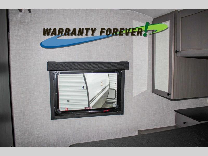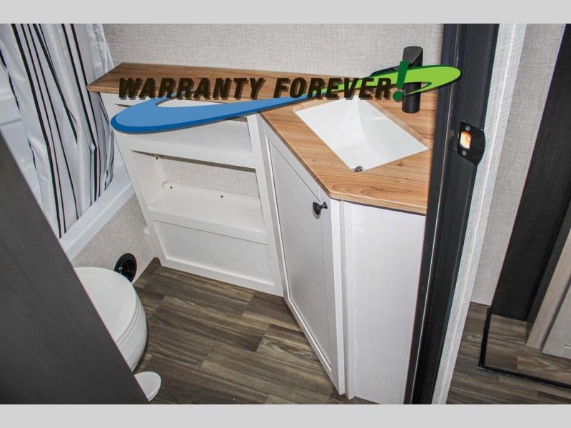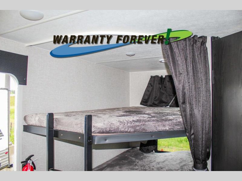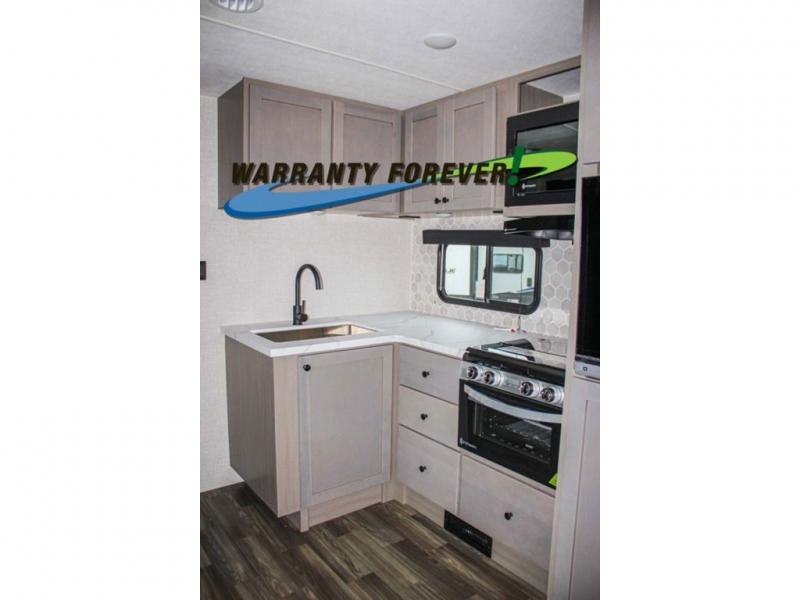With any Starcraft Super Lite travel trailer, the solid and lightweight construction includes a fully walkable roof with a PVC roofing membrane that easily reflects solar heat and UV rays and TuffShell vacuum bonded laminated construction, reinforced with heavy-duty fiberglass and welded aluminum frames. There is also a molded front cap with LED lighting to protect against elements, a power tongue jack for easy towing, plus a power awning with LED lighting. The interior is spacious with an 81" living room ceiling height, hardwood cabinet doors, and flush floor slides with residential vinyl flooring and pressed membrane countertops for easy cleanup. Don't wait for your next adventure, take a Super Lite with you today!
