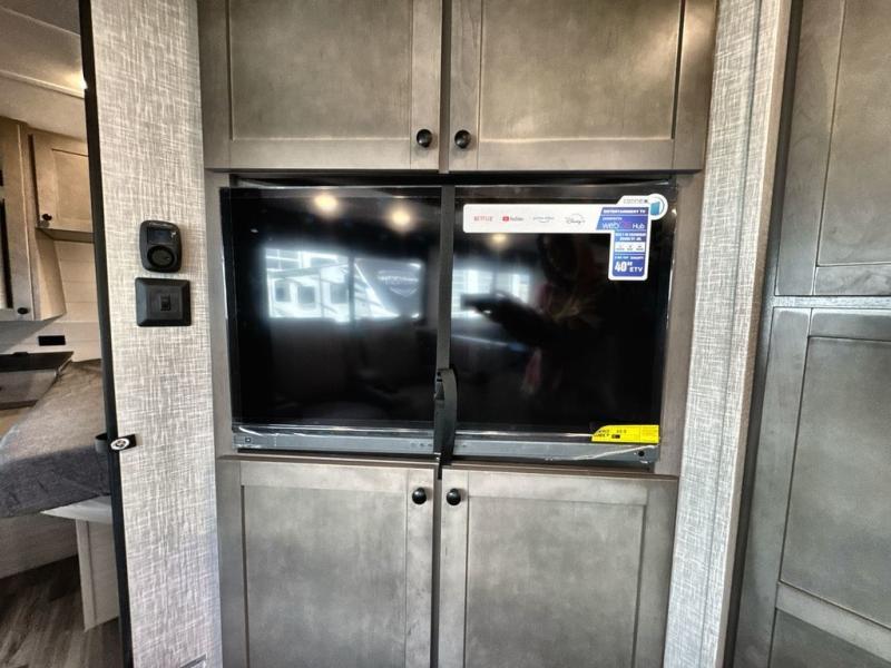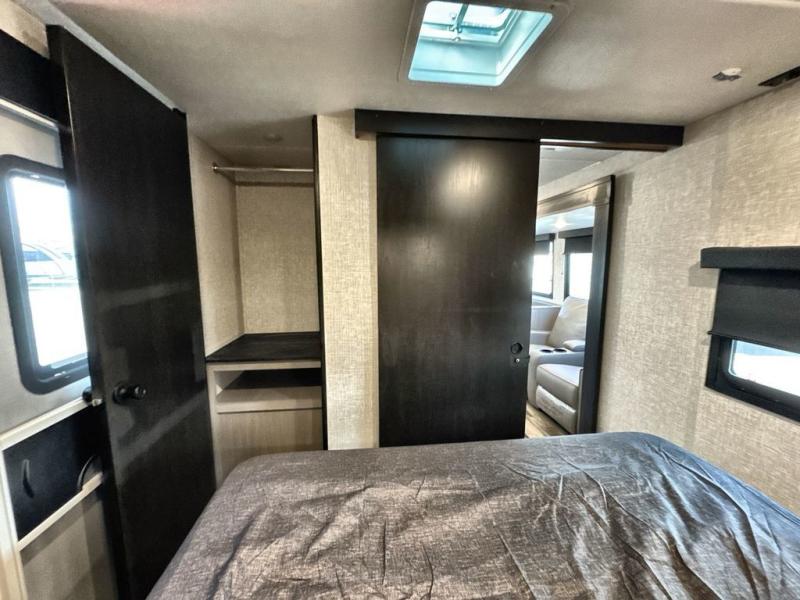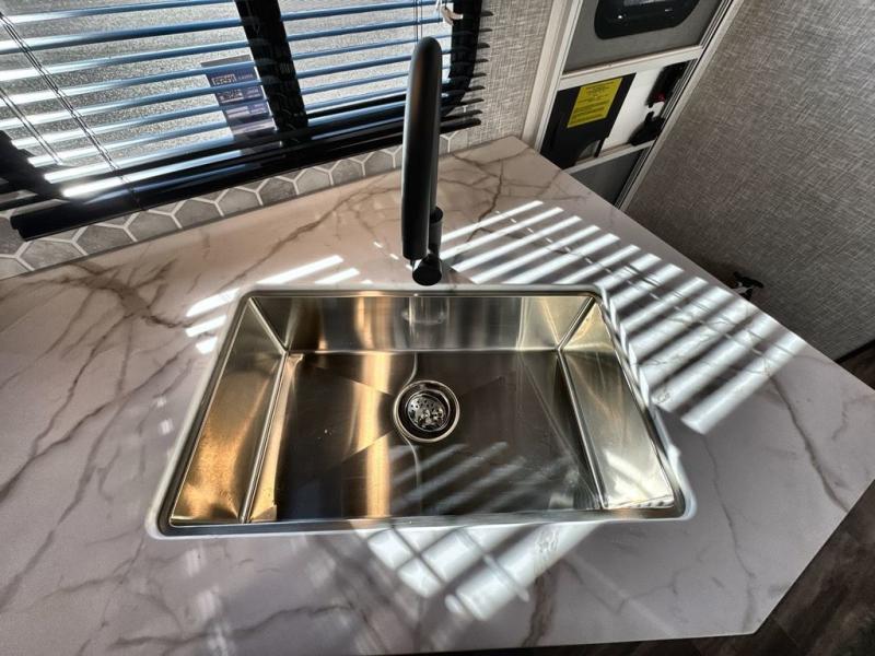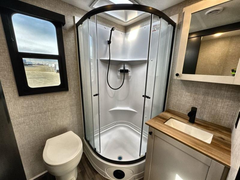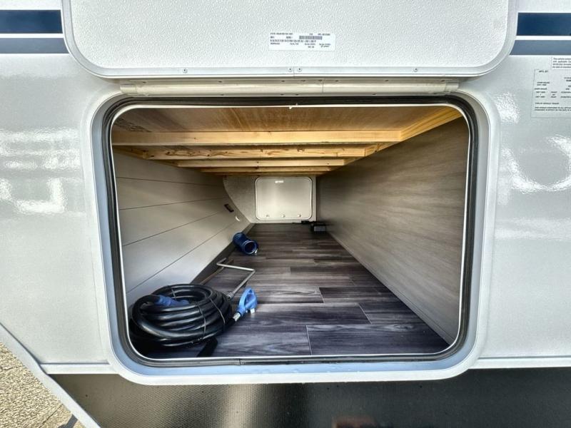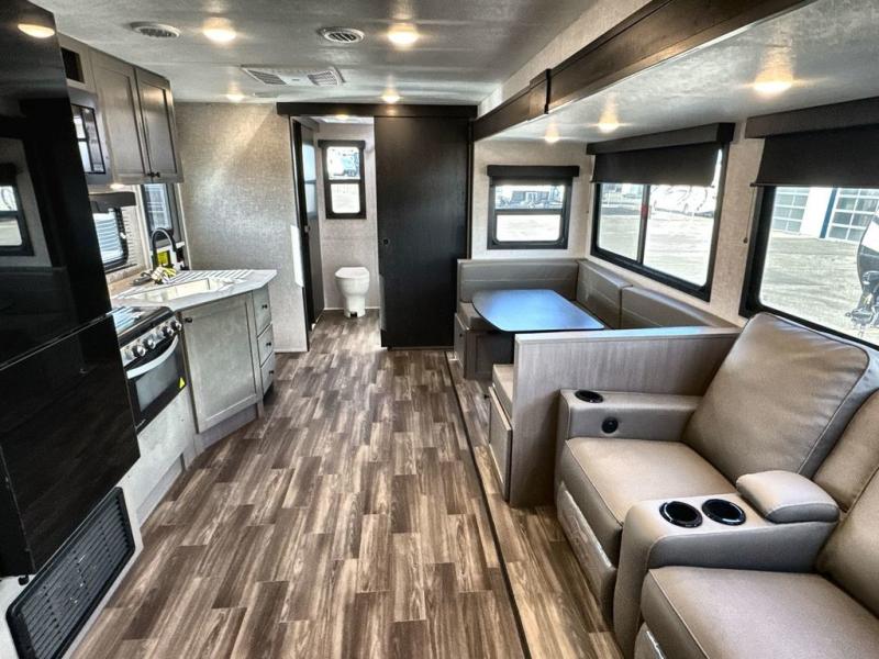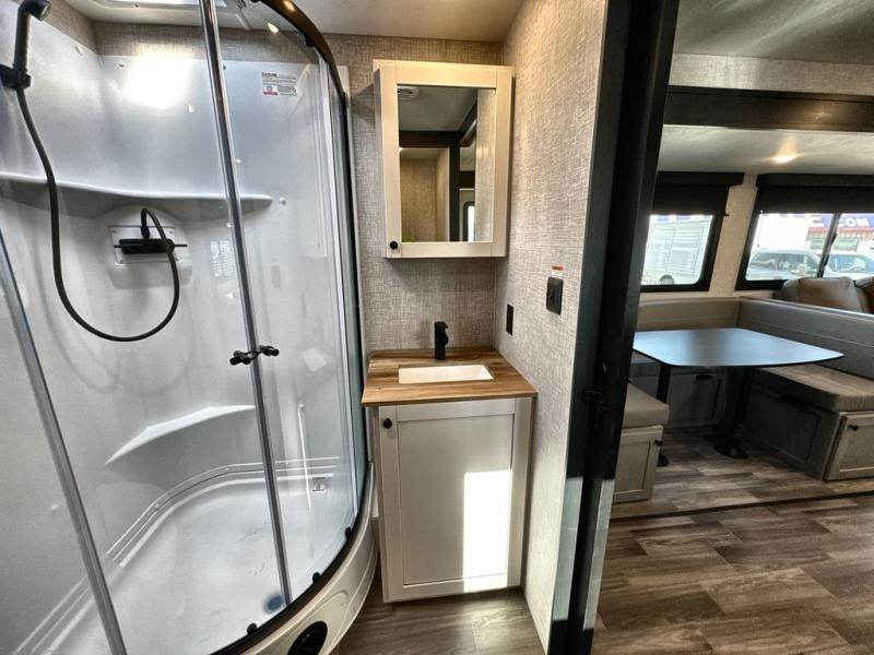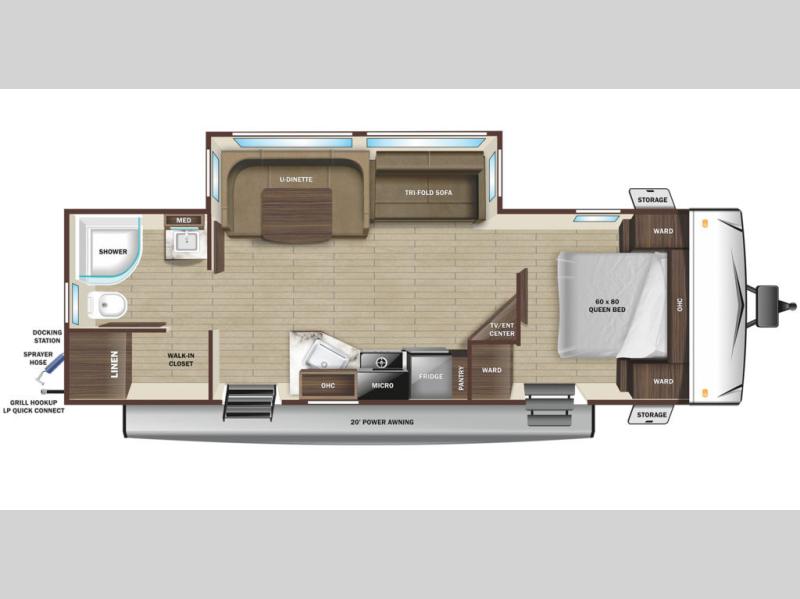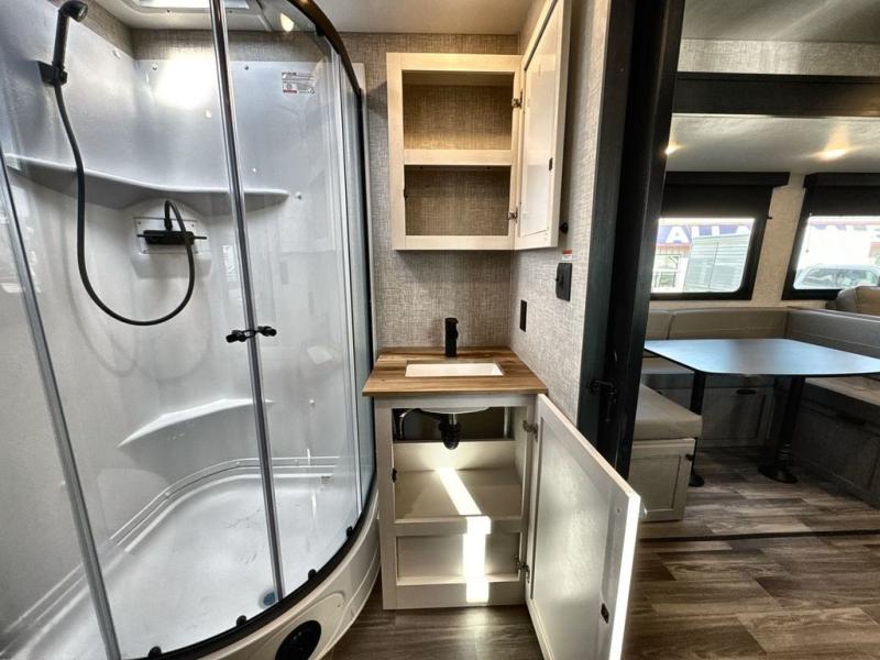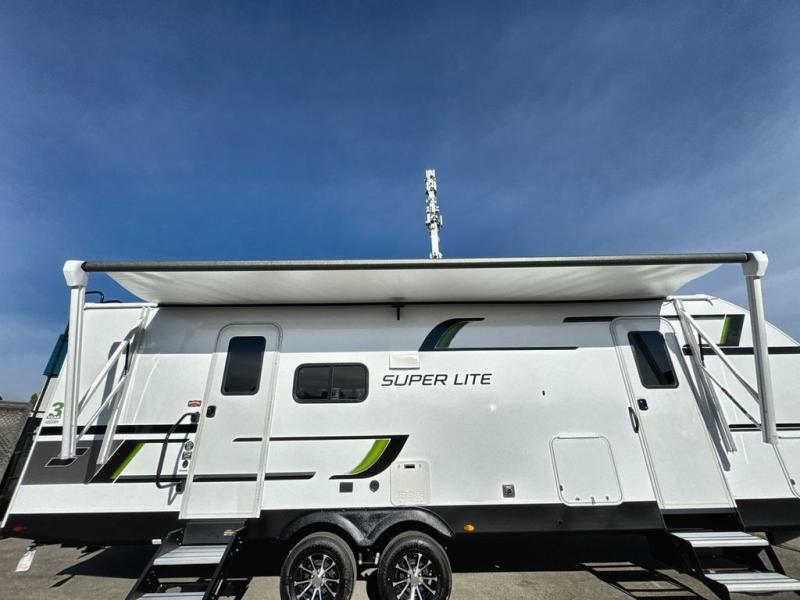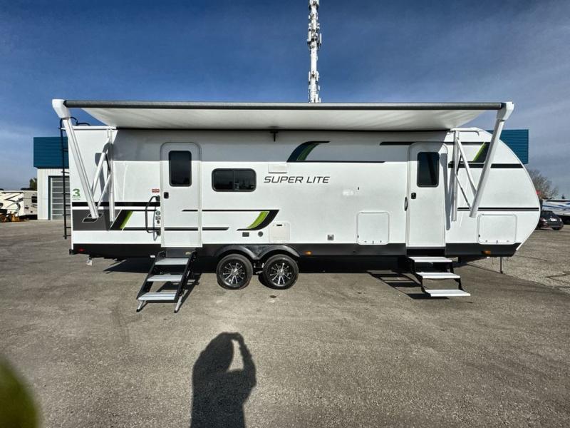 Convenience, space, and lots of camping amenities are wrapped up in this Super Lite so you can enjoy outdoor activities and inside comfort each day you are camping! There is a spacious rear bathroom that includes a walk-in closet, dual entry doors for a smooth flow of traffic in and out especially when your friends joined you, and a large slide with furniture giving you more interior floor space. The cook will have full amenities to feed everyone including a 10 cu. ft. 12V refrigerator to store the cold items, a single basin stainless steel under-mount kitchen sink, and everyone can play games at the U-shaped dinette or outside under the 20' power awning. And at night, you will have a queen bed with storage under the bed as well as beside wardrobes, USB ports and electrical outlets to keep everything charged, and a second entry into the trailer.