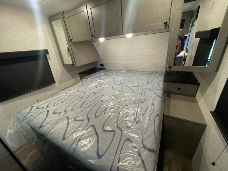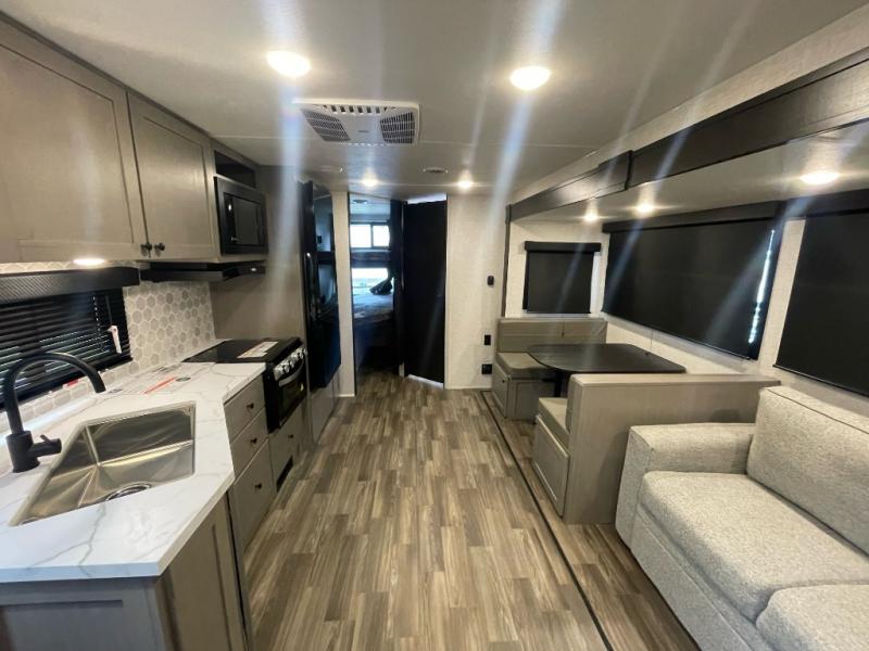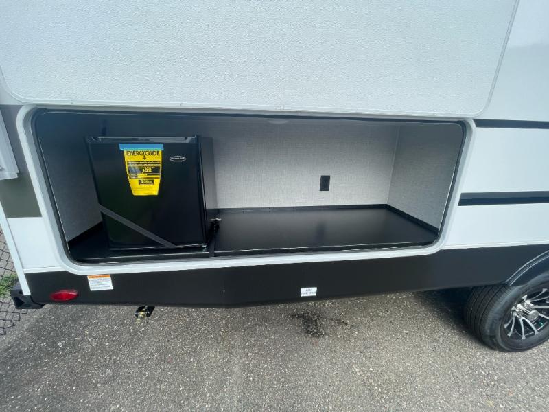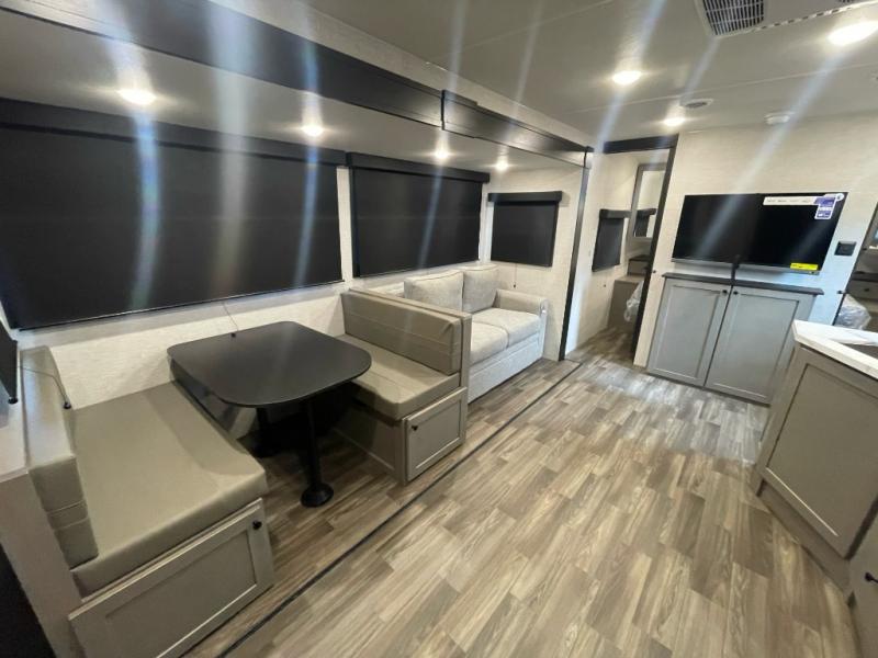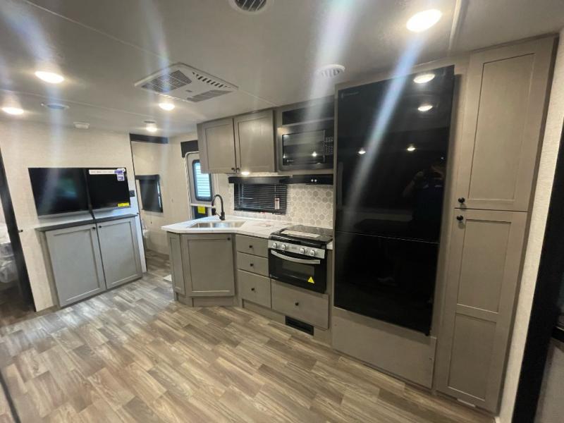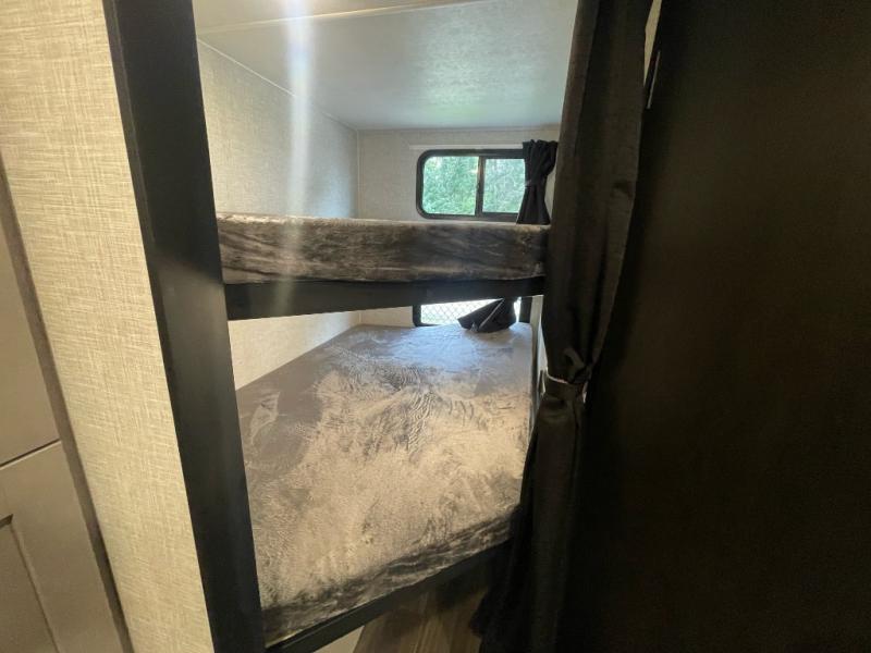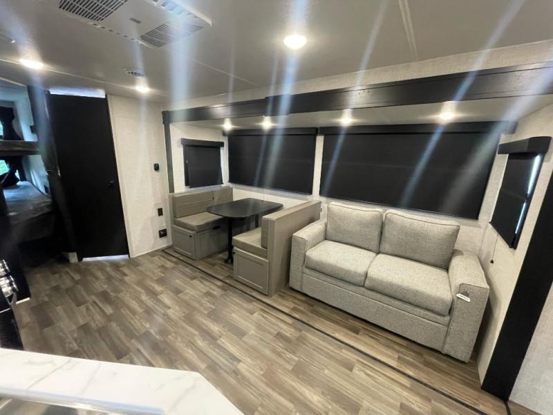 You will love the amount of storage space you'll find inside and outside this travel trailer. There is plenty of sleeping space for a larger group also between the slide out in the main area with a dinette and tri-fold sofa, the double-size bunks next to the rear corner full bathroom, and the queen bed in the front bedroom with access to each side with its own sliding door. The cook will have full amenities including a pantry for storage, a single basin stainless steel under-mount kitchen sink with a residential high-rise faucet and overhead cabinets for more items. And they can cook on the outside kitchen with an exterior fridge while others relax under the 20' 6" power awning with LED lighting.