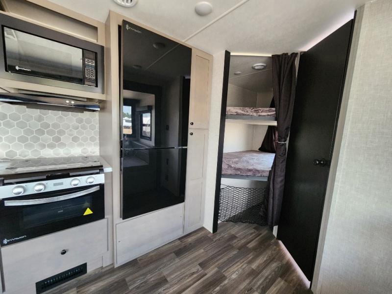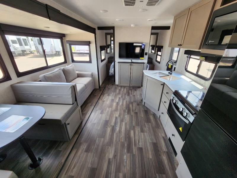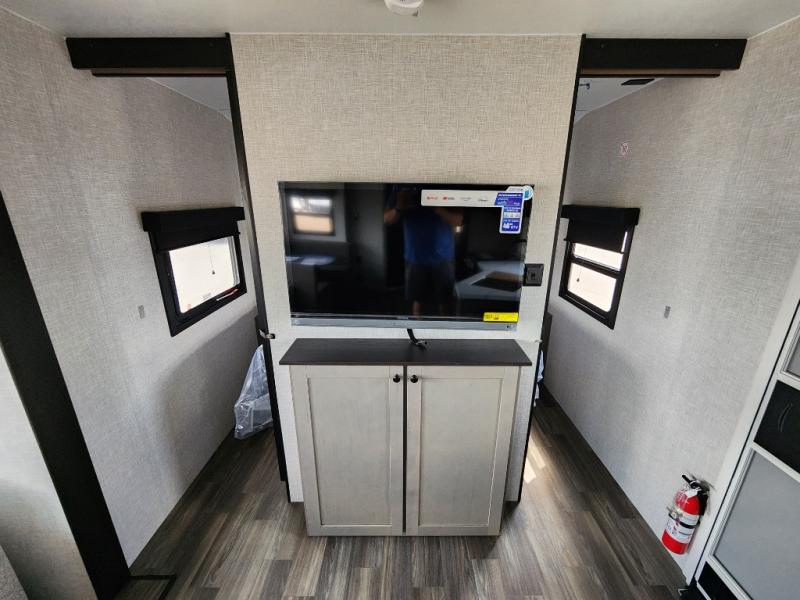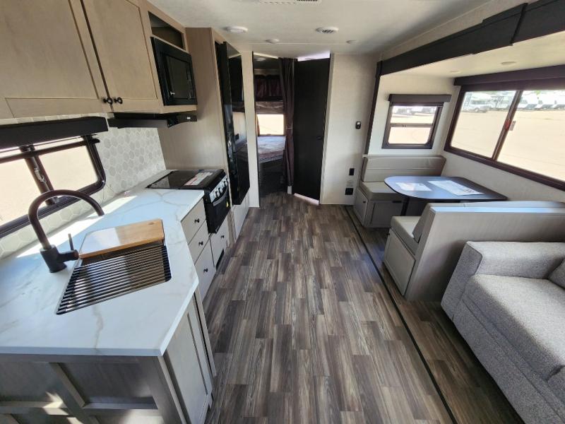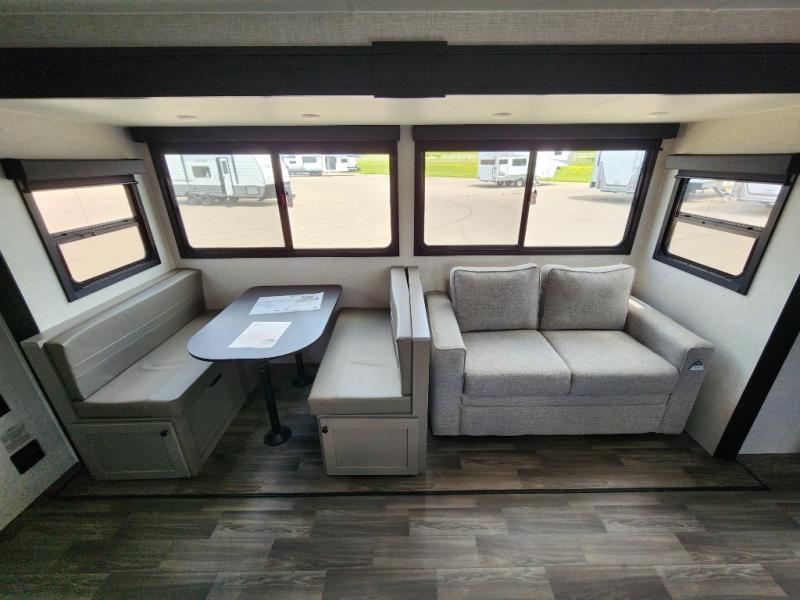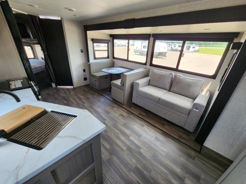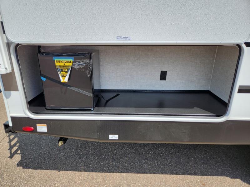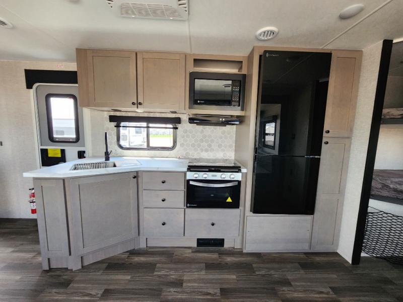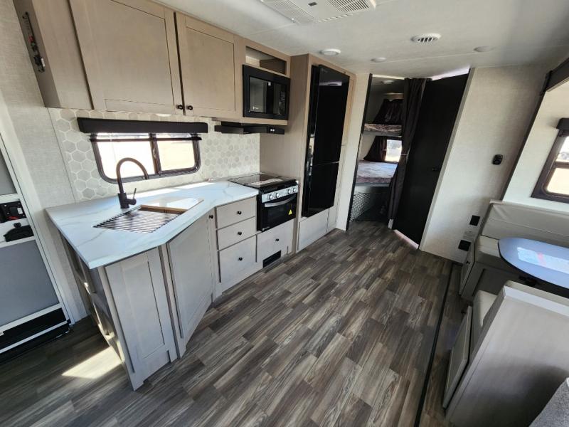 You will love the amount of storage space you'll find inside and outside this travel trailer. There is plenty of sleeping space for a larger group also between the slide out in the main area with a dinette and tri-fold sofa, the double-size bunks next to the rear corner full bathroom, and the queen bed in the front bedroom with access to each side with its own sliding door. The cook will have full amenities including a pantry for storage, a single basin stainless steel under-mount kitchen sink with a residential high-rise faucet and overhead cabinets for more items. And they can cook on the outside kitchen with an exterior fridge while others relax under the 20' 6" power awning with LED lighting.