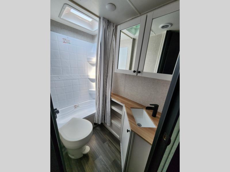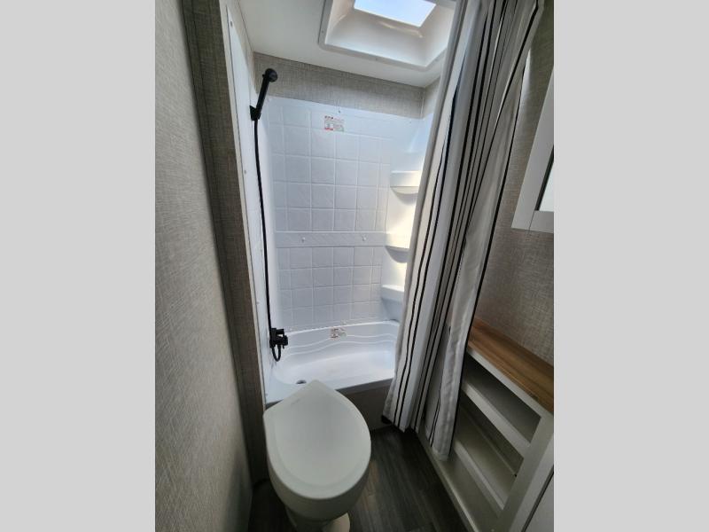 With any Starcraft Super Lite travel trailer, the solid and lightweight construction includes a fully walkable roof with a PVC roofing membrane that easily reflects solar heat and UV rays and TuffShell vacuum bonded laminated construction, reinforced with heavy-duty fiberglass and welded aluminum frames. There is also a molded front cap with LED lighting to protect against elements, a power tongue jack for easy towing, plus a power awning with LED lighting. The interior is spacious with an 81" living room ceiling height, hardwood cabinet doors, and flush floor slides with residential vinyl flooring and pressed membrane countertops for easy cleanup. Don't wait for your next adventure, take a Super Lite with you today!