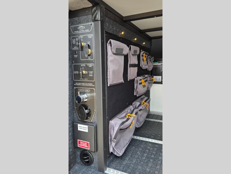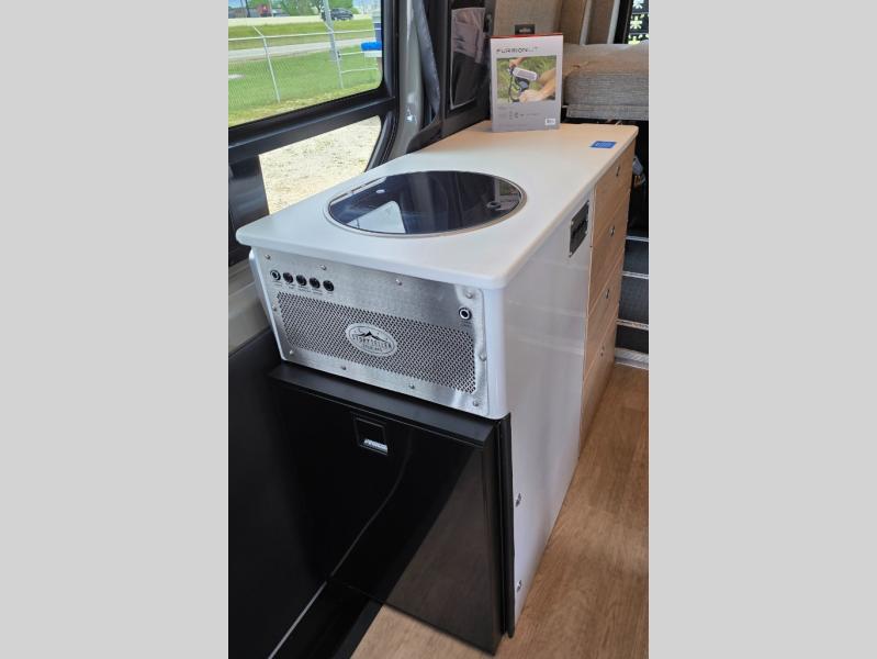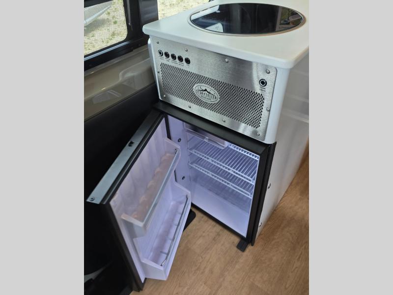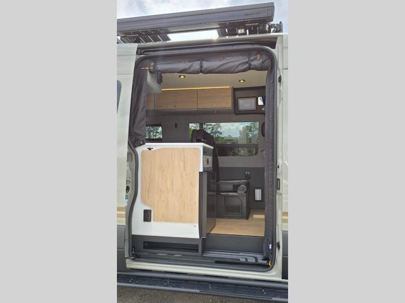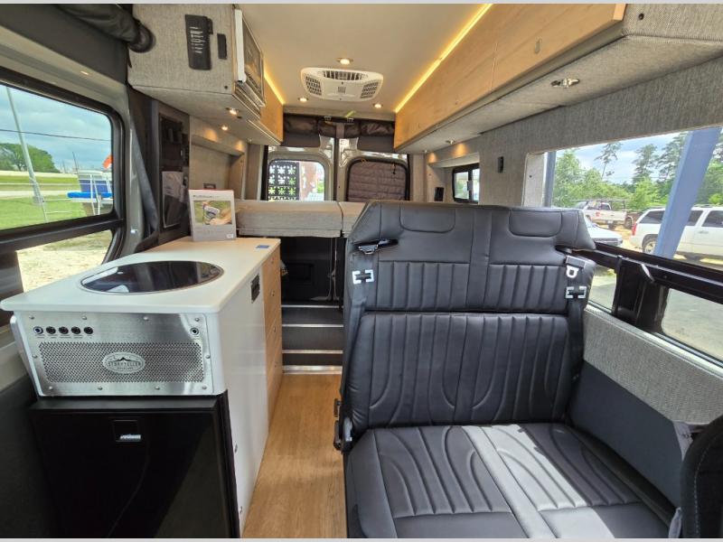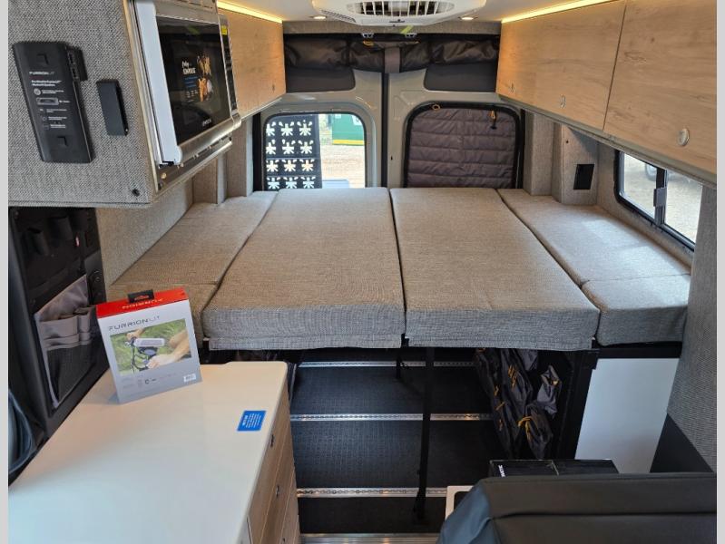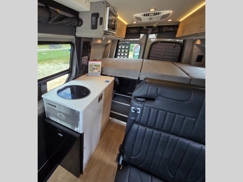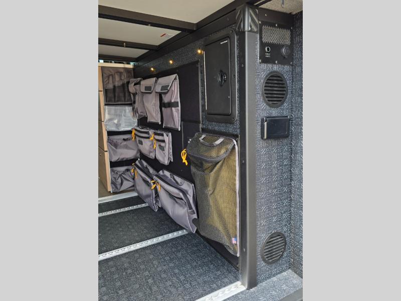 The Beast MODE van is more rugged than ever to meet your adventurous lifestyle! The nVader brush guard by Flarespace is new, along with an nVader ladder by Flarespace. The swivel driver and passenger seats make for a comfortable drive and once you arrive at your destination you can prepare a delicious meal with the portable induction cooktop, then enjoy it at the removable dinette table. The cargo area has a L-track system that can fold up the Dreamweaver bed when you need to load your bikes into the back. Plus, you have a GrooveLounge 2-seater convertible sofa bed that can be for sitting, lounging, or sleeping!