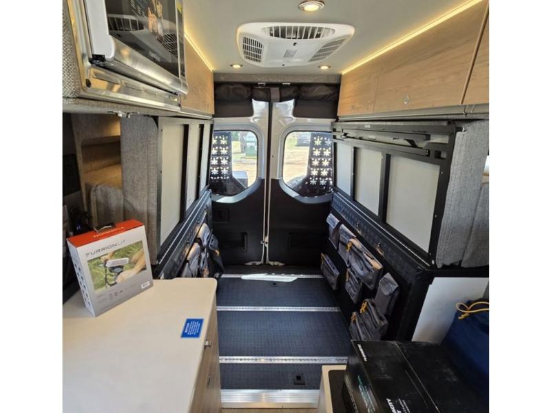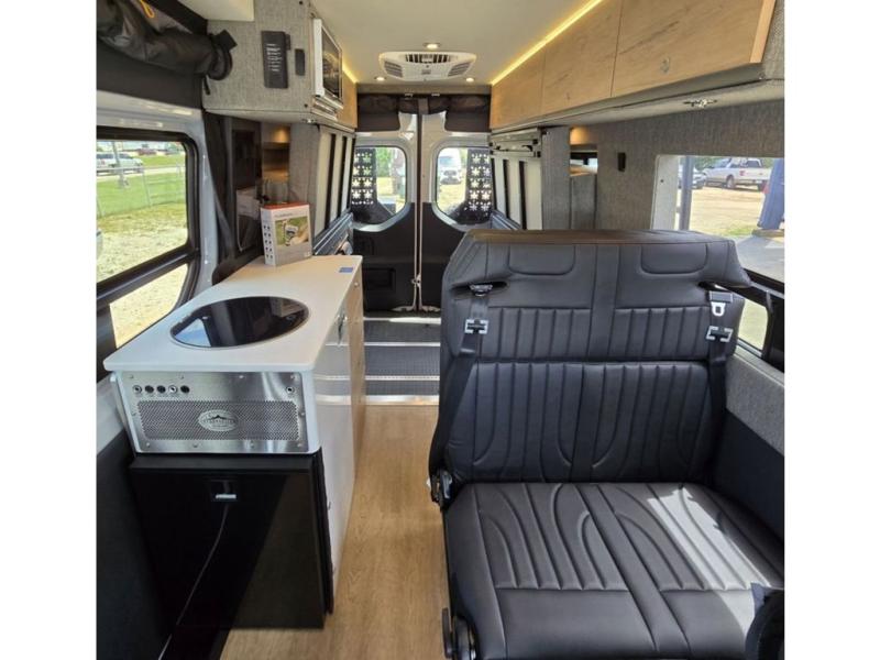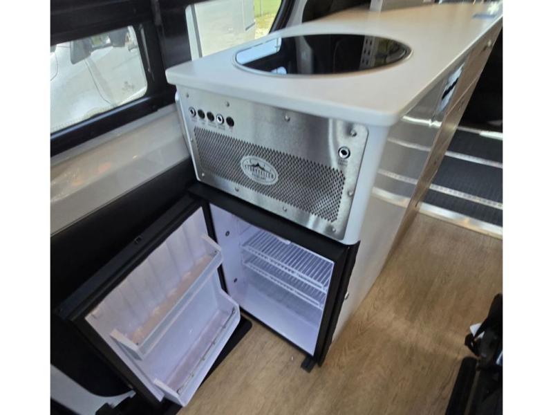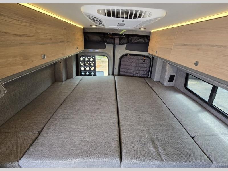 The Beast MODE van is more rugged than ever to meet your adventurous lifestyle! The nVader brush guard by Flarespace is new, along with an nVader ladder by Flarespace. The swivel driver and passenger seats make for a comfortable drive and once you arrive at your destination you can prepare a delicious meal with the portable induction cooktop, then enjoy it at the removable dinette table. The cargo area has a L-track system that can fold up the Dreamweaver bed when you need to load your bikes into the back. Plus, you have a GrooveLounge 2-seater convertible sofa bed that can be for sitting, lounging, or sleeping!