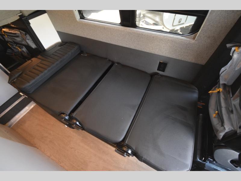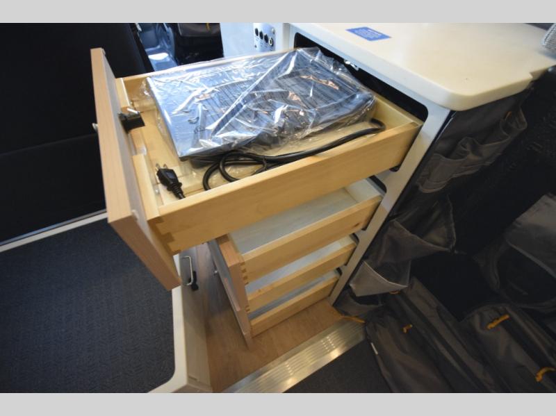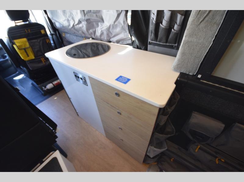 Inside, the GrooveLounge 2-seater transforms into a bed, lounger, or seating area depending on your needs, while the Dreamweaver Murphy-style bed folds up for added storage flexibility. The removable dinette table makes meals on the road easy and adaptable, and with the portable induction cooktop, you can cook anywhere, inside or out.