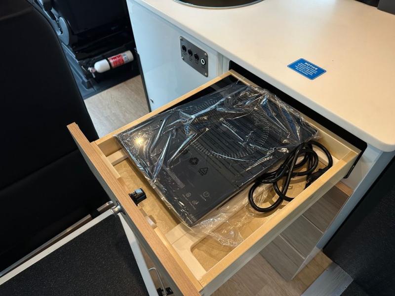 Pack your bags and head out on a great adventure in this motorhome! There is flexible living all throughout between the GrooveLounge which can be used for sitting, lounging, or sleeping at night, plus the cargo area has a L-track system to unfold the Dreamweaver bed/convertible work surface for versatile use. Prepare your best home cooked meals on the road with the portable induction cooktop and enjoy them with the removable dinette table. You can also freshen up after a long day of traveling in the HALO interior shower system with a FlexSpace concealed shower pan and portable toilet.