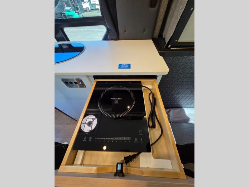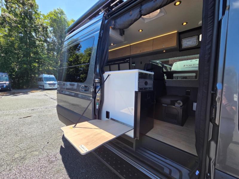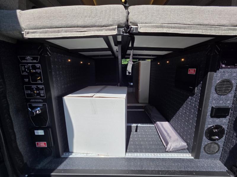 You'll love the stealthy exterior of the DARKMODE OG! The GrooveLounge can seat two adults and can convert to a couch or bed, plus you'll have Dreamweaver bed that easily folds up to reveal a workspace. There is plenty of storage space throughout, including under the bed and in the removable upper cabinetry. You can whip up your best meals with the portable induction cooktop and stainless steel microwave, and the refrigerator/freezer will keep cold items fresh. There is also a stainless steel sink with a folding faucet and an exterior fold-down table if you want to get some fresh air as you prep dinner. You'll appreciate the Halo shower with a FlexSpace concealed shower pan, along with a portable toilet and hot water recirculation system.