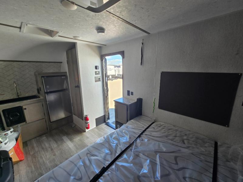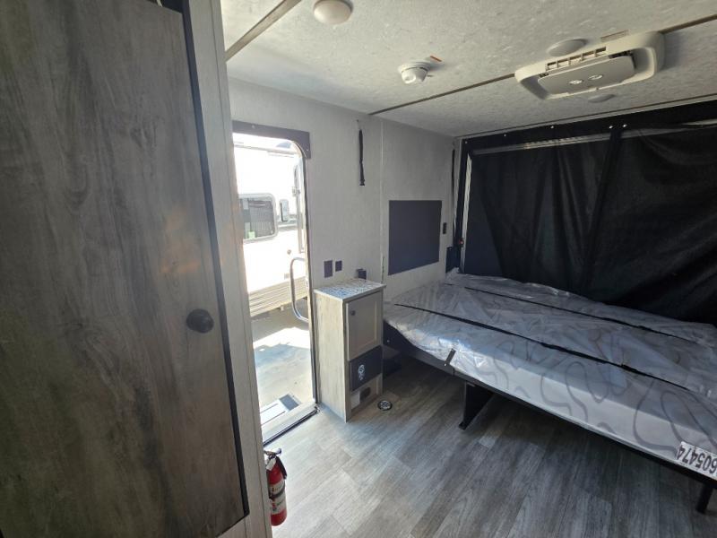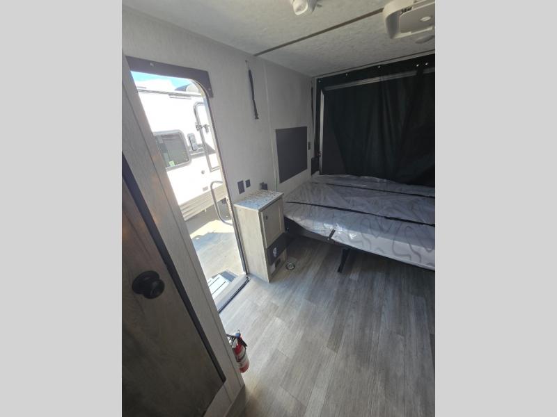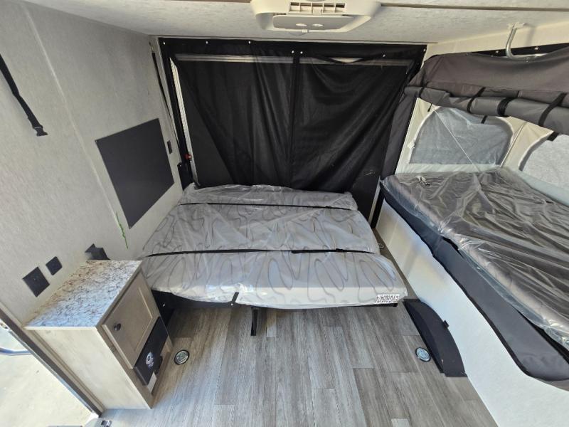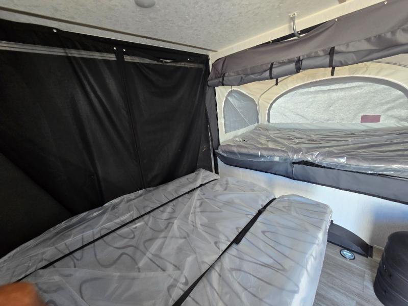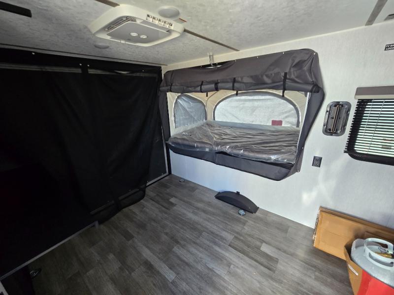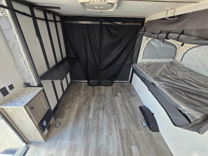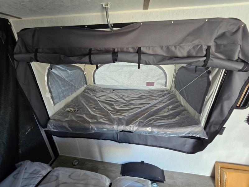 Get ready for a great camping experience where you can take along your favorite ride-on toys, kayaks, or other items that you may not normally have room to load as this toy hauler features a 6' 9" cargo width and 10' 11" cargo length. Once unloaded, set up with the rear bed that will make for a great night's rest. The front of this unit is shared with the wet bath and kitchen. Here, you can make meals on the two burner stove or in the microwave oven, and there is a refrigerator for perishables. And when the optional tent bed is added on this model, you can sleep more campers!