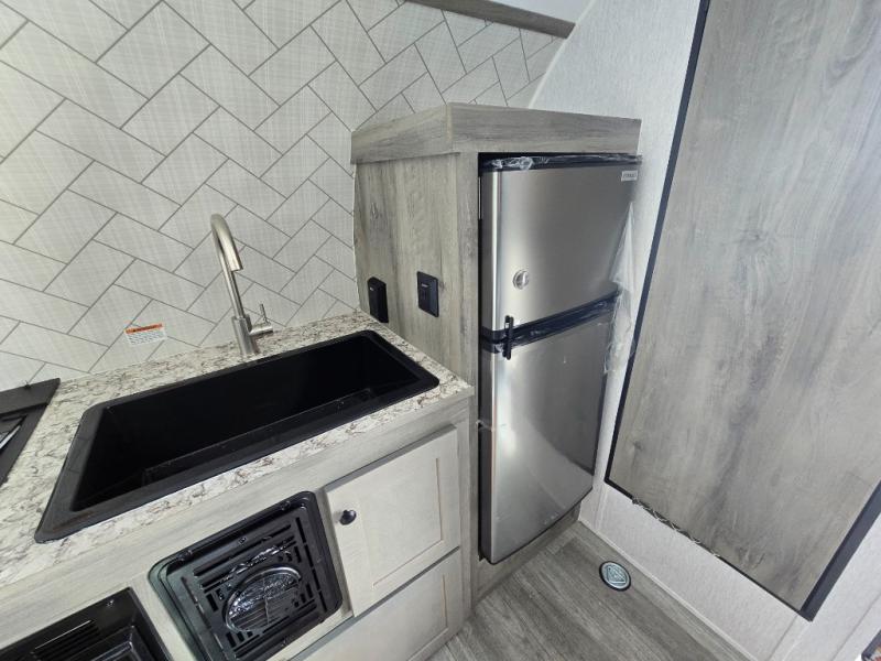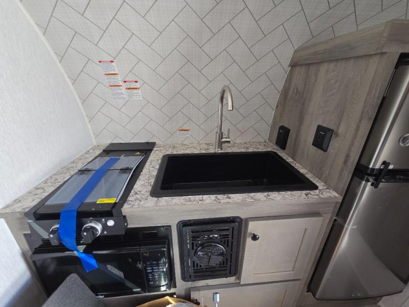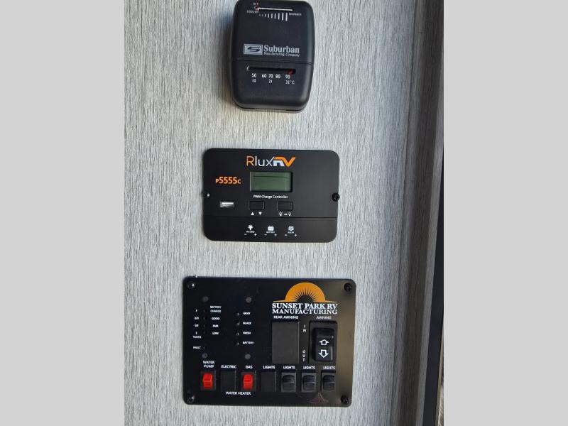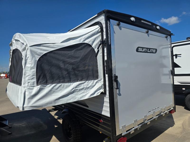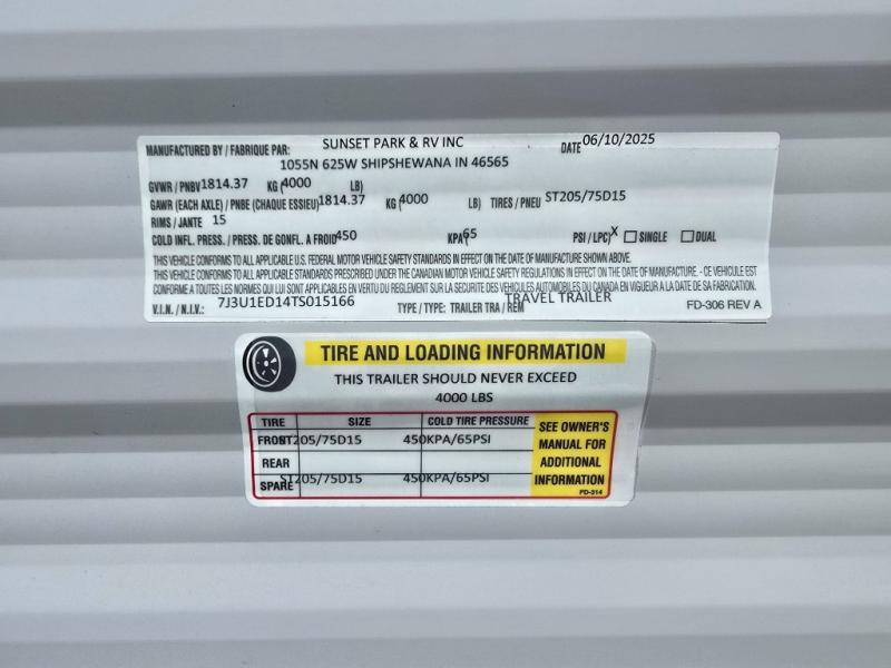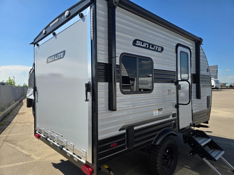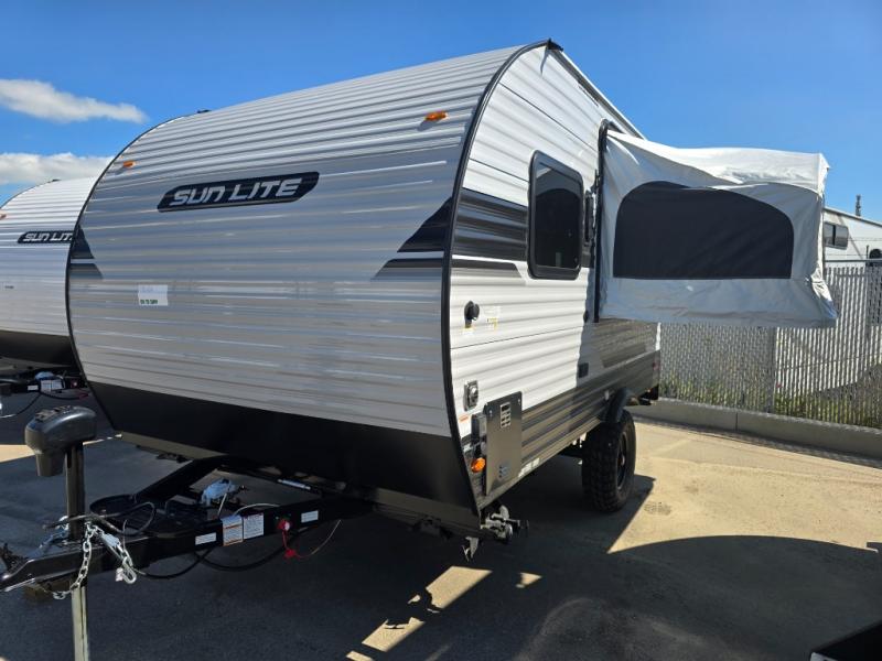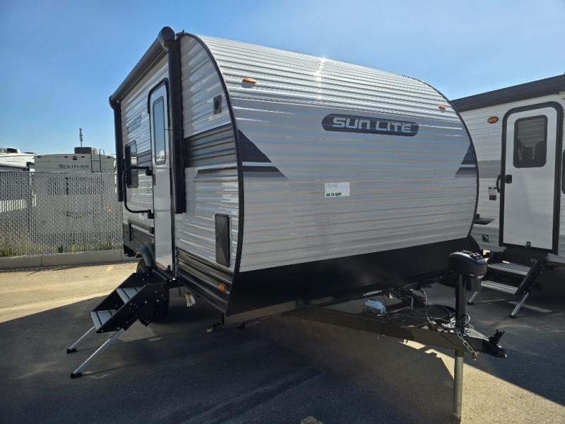 You can trust the build and enjoy your experience with any one of these Sunset Park RV Sun Lite travel trailers or toy haulers! Their aerodynamic profile is not only easy to haul, but also saves on fuel. They are built to withstand years of traveling even though they are lightweight with a diamond plate rock guard, a one piece PVC roof membrane, Dexter Spring-Leaf axles, and tinted safety glass windows. Some comfort standards you are sure to enjoy are the two-burner stove top range with hood, light and fan, plus the refrigerator and microwave, and an outside shower to help keep the dirt outdoors where it belongs.