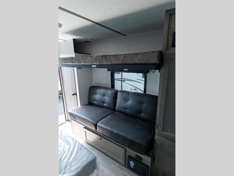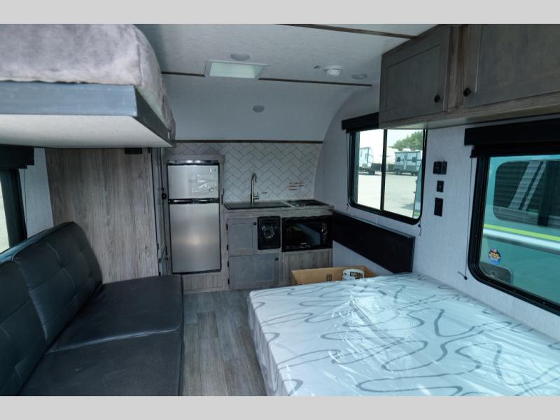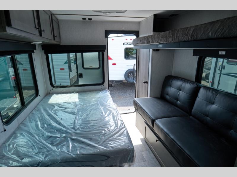 The innovative design of the Sunlite 15RBE provides an impressive amount of practical camping features that you won't find in other RVs of this size. Inside the Sunlite 15RBE, you'll find a full kitchen with a dinette bar, bathroom, couch, bunk bed, and loads of storage. Plus feel more connected with the outdoors with huge panoramic windows.