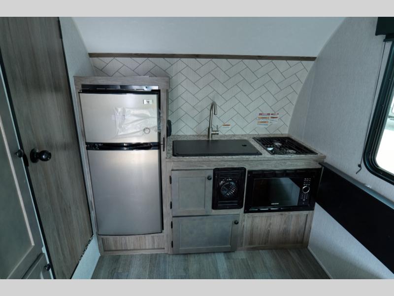 The Sunlite 15RBE’s kitchen is thoughtfully designed to bring the comforts of home on the road. It features a 4.4-cubic-foot refrigerator and freezer, a full-sized residential farmhouse sink, a microwave, and a 2-burner stove, making cooking easy and enjoyable.