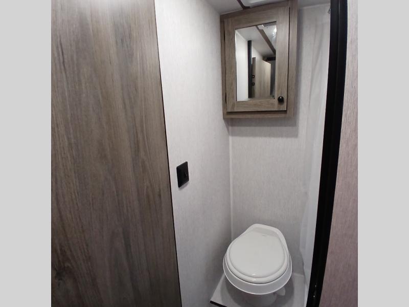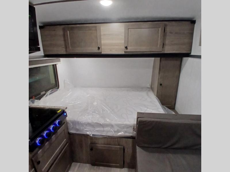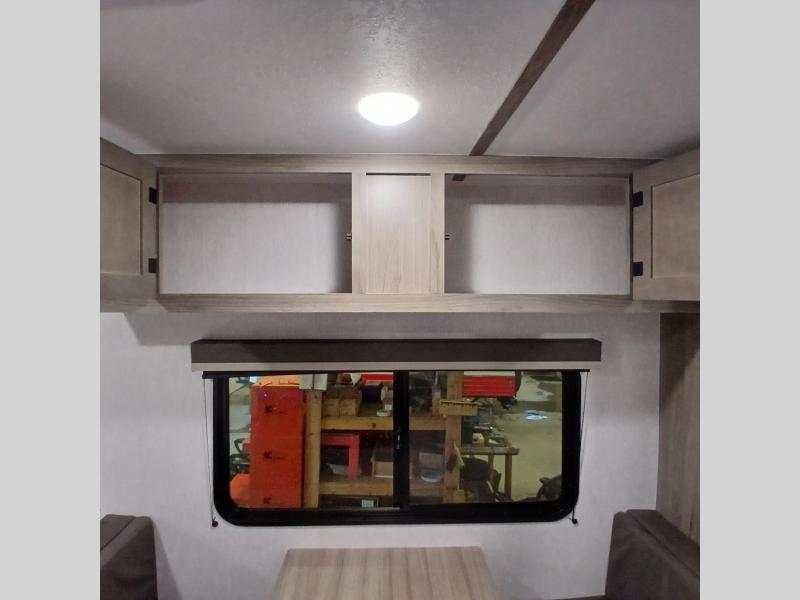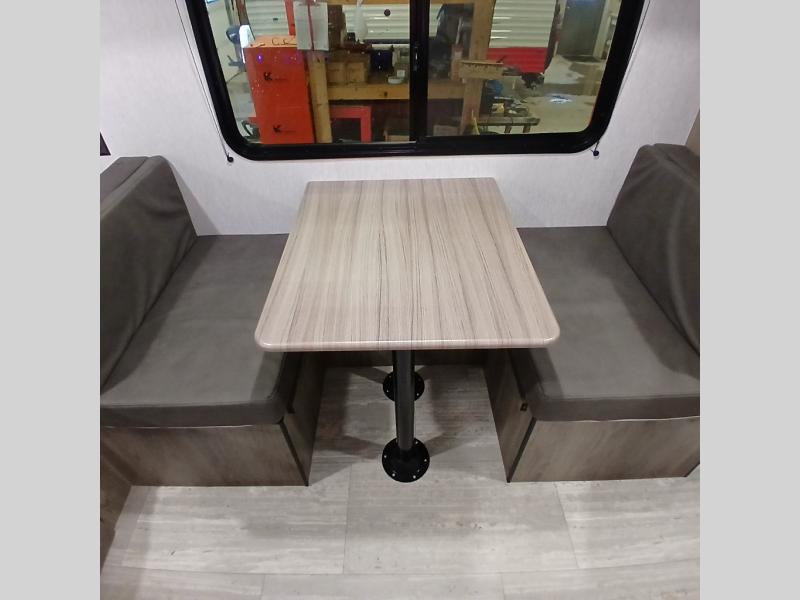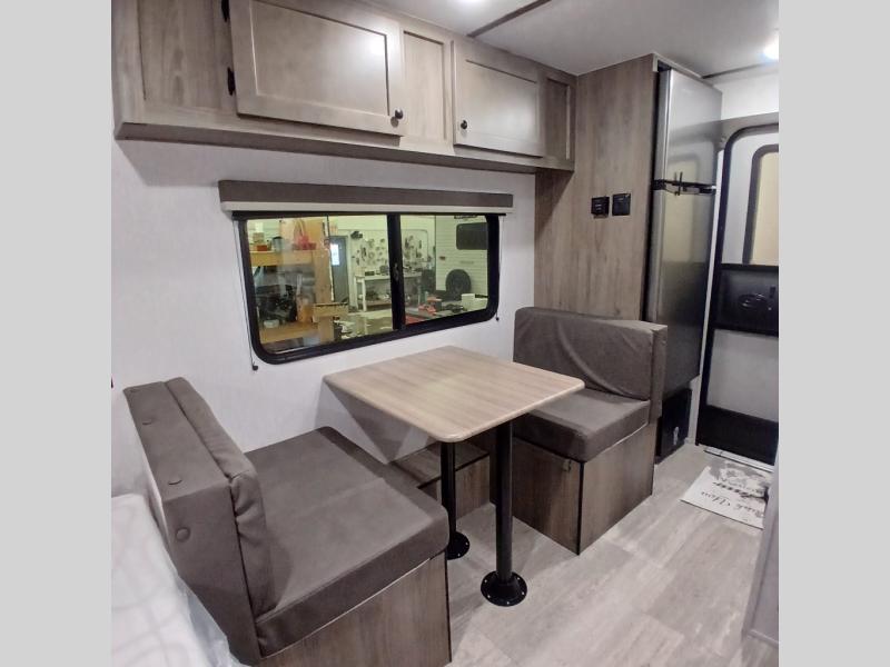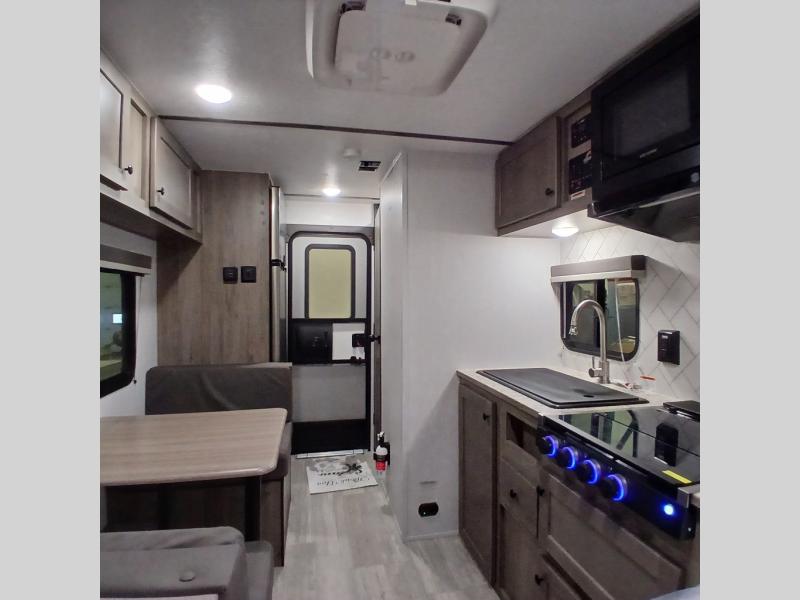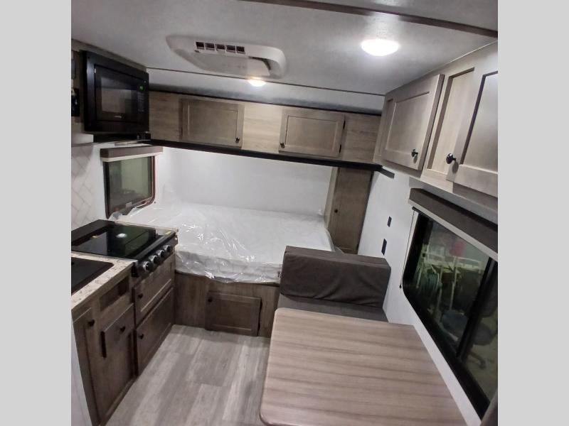 This travel trailer is perfect for couples who want to getaway together! The front bed offers a comfortable place to lay your head at night. When you're not using the booth dinette to enjoy a meal that you prepared with the two burner cooktop or playing a card game, you can transform it into an extra sleeping space. You can start your mornings feeling clean and fresh after showering in the tub with unwanted steam removed with the power roof vent.