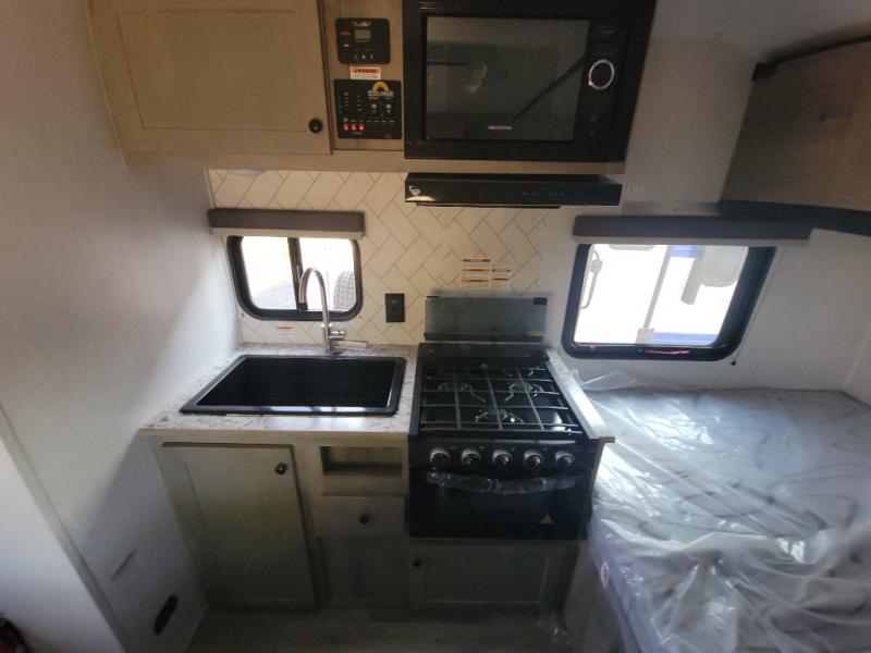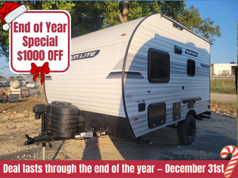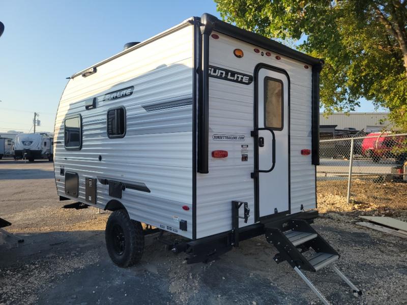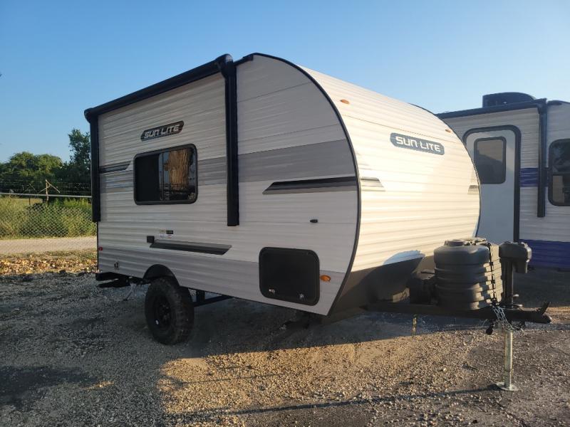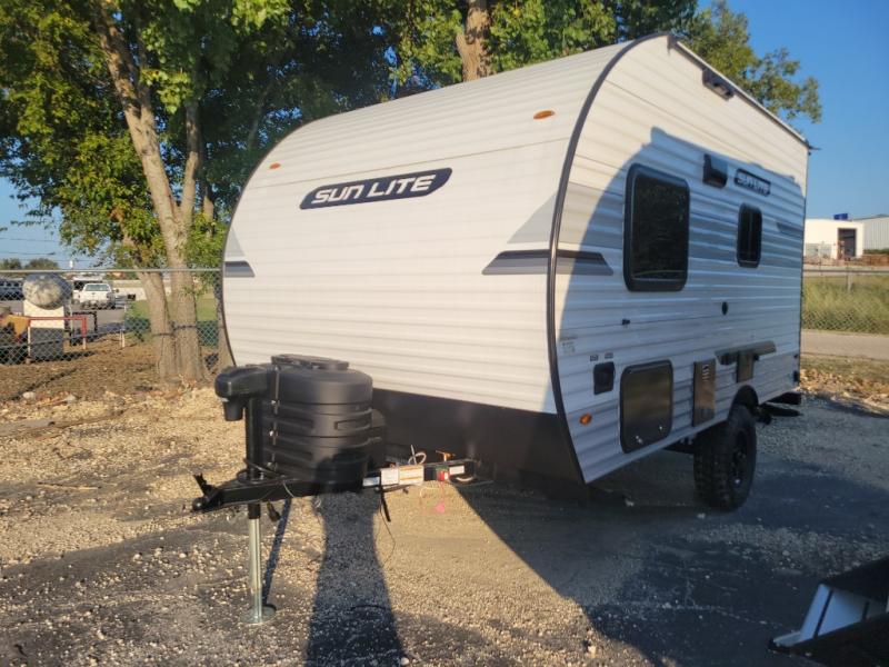 You can trust the build and enjoy your experience with any one of these Sunset Park RV Sun Lite travel trailers! Their aerodynamic profile is not only easy to haul, but also saves on fuel. They are built to withstand years of traveling even though they are lightweight with a diamond plate rock guard, a one piece PVC roof membrane, Dexter Spring-Leaf axles, and tinted safety glass windows. Some comfort standards you are sure to enjoy are the two-burner stove top range with hood, light and fan, plus the refrigerator and microwave, and an outside shower to help keep the dirt outdoors where it belongs.