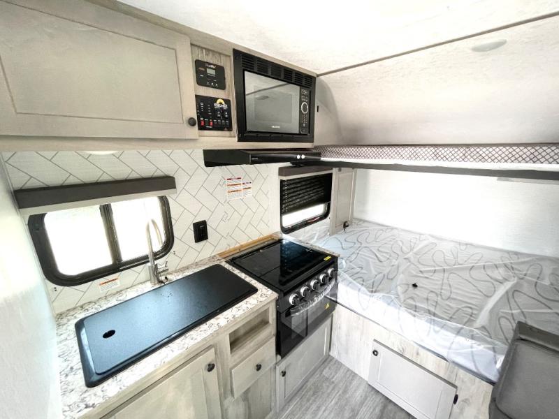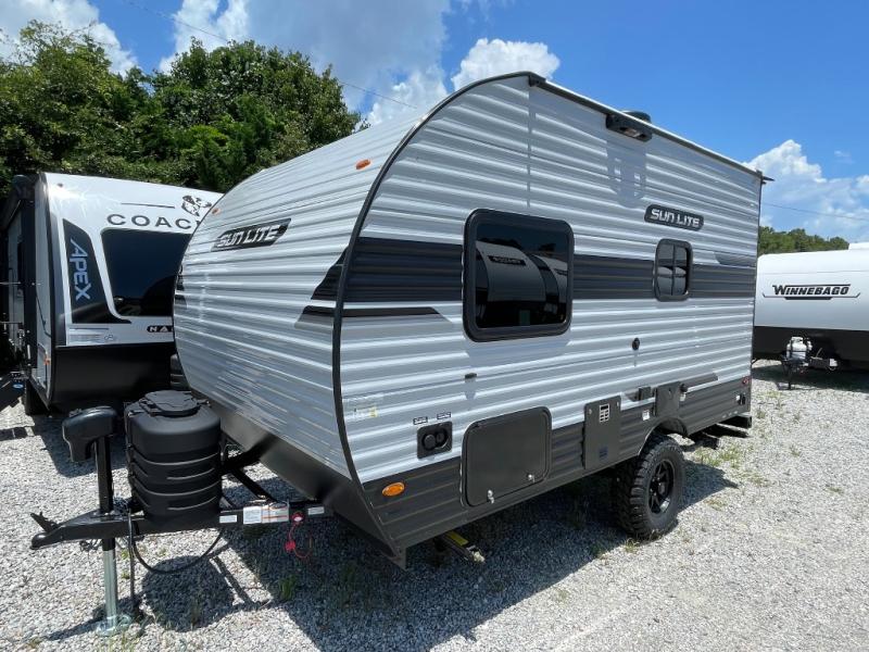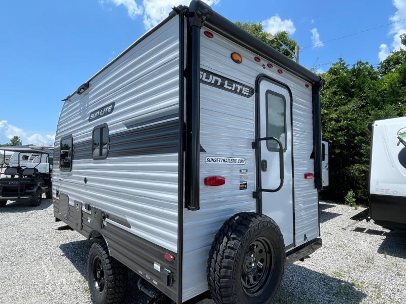You can trust the build and enjoy your experience with any one of these Sunset Park RV Sun Lite travel trailers! Their aerodynamic profile is not only easy to haul, but also saves on fuel. They are built to withstand years of traveling even though they are lightweight with a diamond plate rock guard, a one piece PVC roof membrane, Dexter Spring-Leaf axles, and tinted safety glass windows. Some comfort standards you are sure to enjoy are the two-burner stove top range with hood, light and fan, plus the refrigerator and microwave, and an outside shower to help keep the dirt outdoors where it belongs.