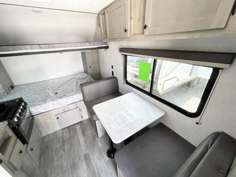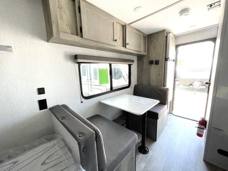 This travel trailer is perfect for couples who want to getaway together! The front bed offers a comfortable place to lay your head at night. When you're not using the booth dinette to enjoy a meal that you prepared with the two burner cooktop or playing a card game, you can transform it into an extra sleeping space. You can start your mornings feeling clean and fresh after showering in the tub with unwanted steam removed with the power roof vent.