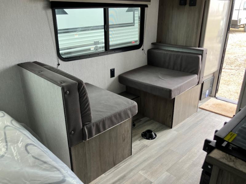 Pack your bags and load up this travel trailer for a great camping trip! You will have everything you need to keep your belly full with the two burner cooktop, your hair clean with a tub inside rear corner bathroom which also has a power vent fan, and your body well rested after sleeping on the front bed. You can even play card games at the booth dinette or transform it into an extra sleeping space. There is also an outside shower to rinse the mud off your feet before entering inside!