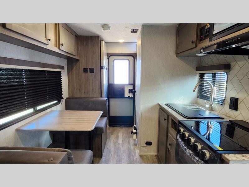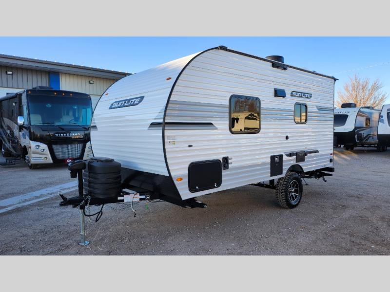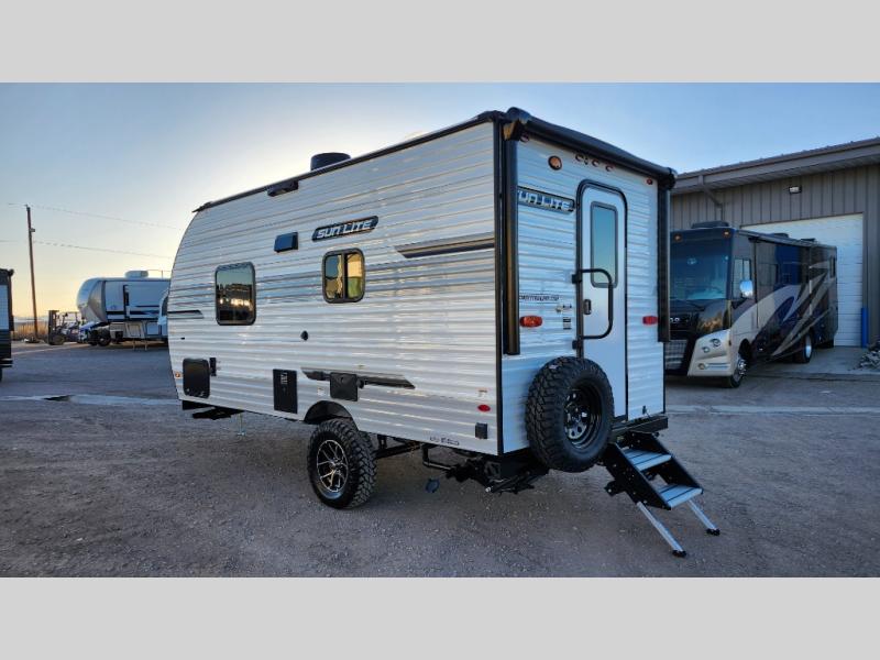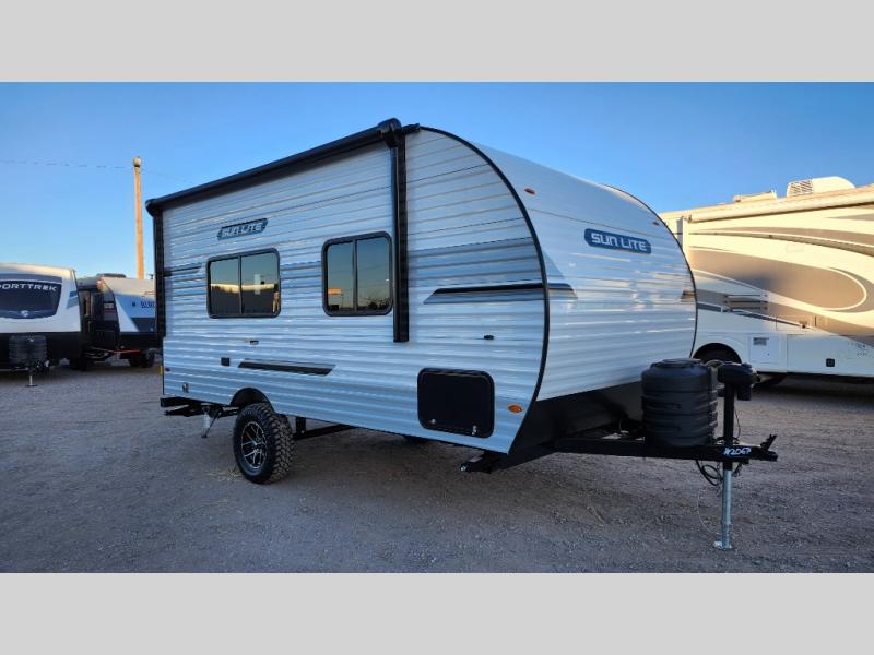 You can trust the build and enjoy your experience with any one of these Sunset Park RV Sun Lite travel trailers! Their aerodynamic profile is not only easy to haul, but also saves on fuel. They are built to withstand years of traveling even though they are lightweight with a diamond plate rock guard, a one piece PVC roof membrane, Dexter Spring-Leaf axles, and tinted safety glass windows. Some comfort standards you are sure to enjoy are the two-burner stove top range with hood, light and fan, plus the refrigerator and microwave, and an outside shower to help keep the dirt outdoors where it belongs.