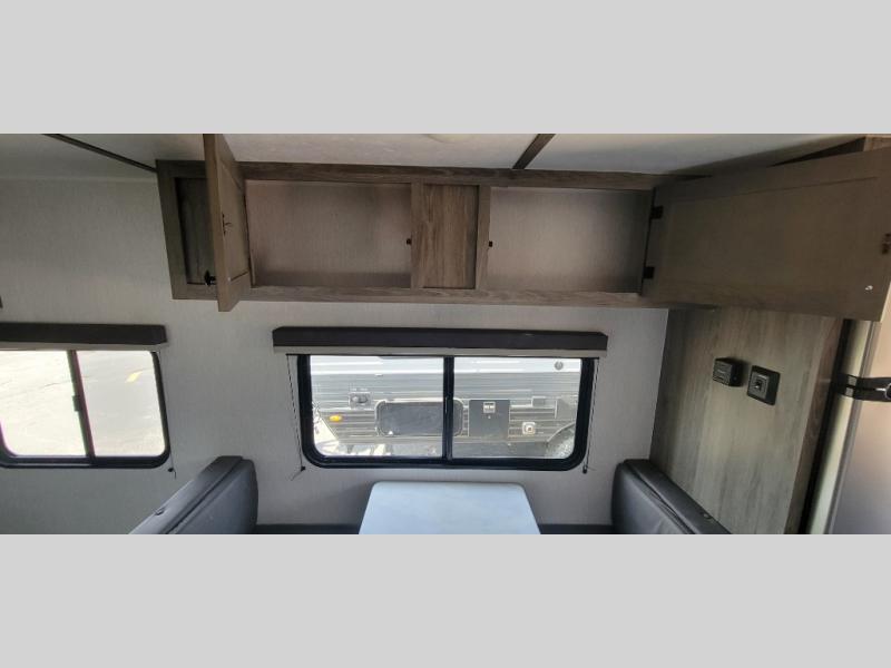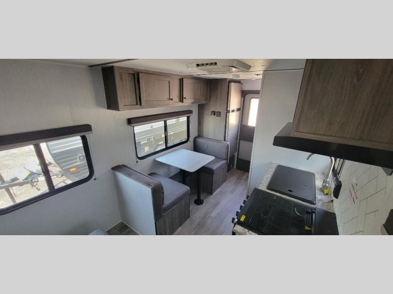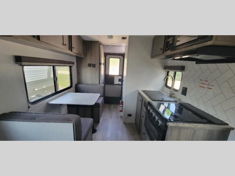 Pack your bags and load up this travel trailer for a great camping trip! You will have everything you need to keep your belly full with the two burner cooktop, your hair clean with a tub inside rear corner bathroom which also has a power vent fan, and your body well rested after sleeping on the front bed. You can even play card games at the booth dinette or transform it into an extra sleeping space. There is also an outside shower to rinse the mud off your feet before entering inside!