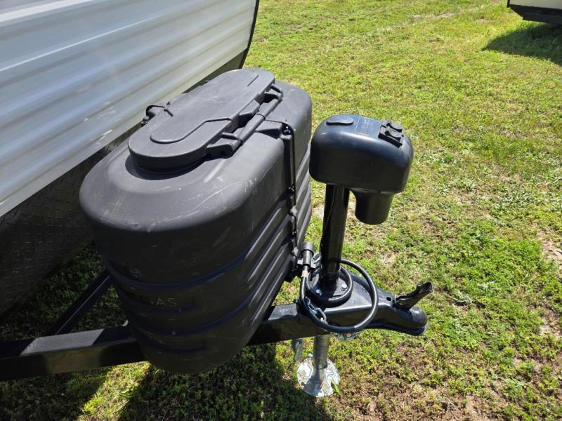 Pack your bags and load up this travel trailer for a great camping trip! You will have everything you need to keep your belly full with the two burner cooktop, your hair clean with a tub inside rear corner bathroom which also has a power vent fan, and your body well rested after sleeping on the front bed. You can even play card games at the booth dinette or transform it into an extra sleeping space. There is also an outside shower to rinse the mud off your feet before entering inside!