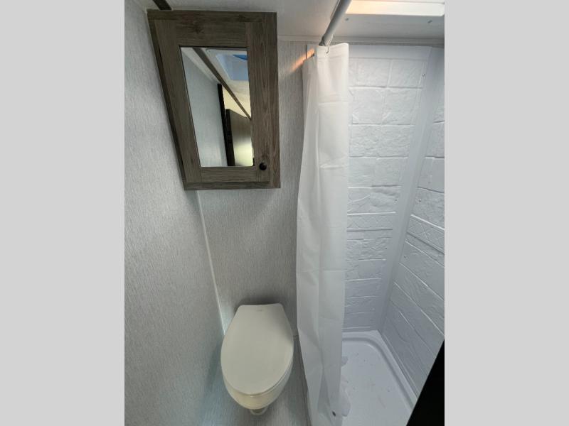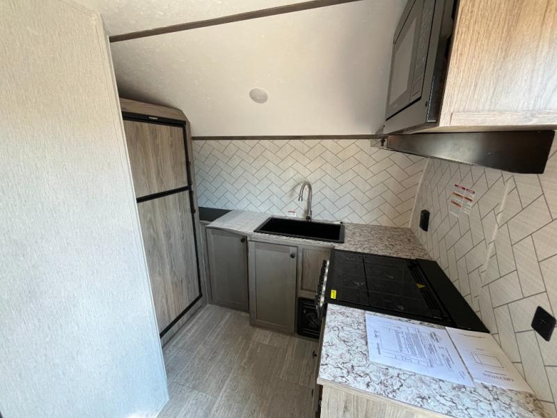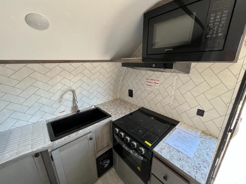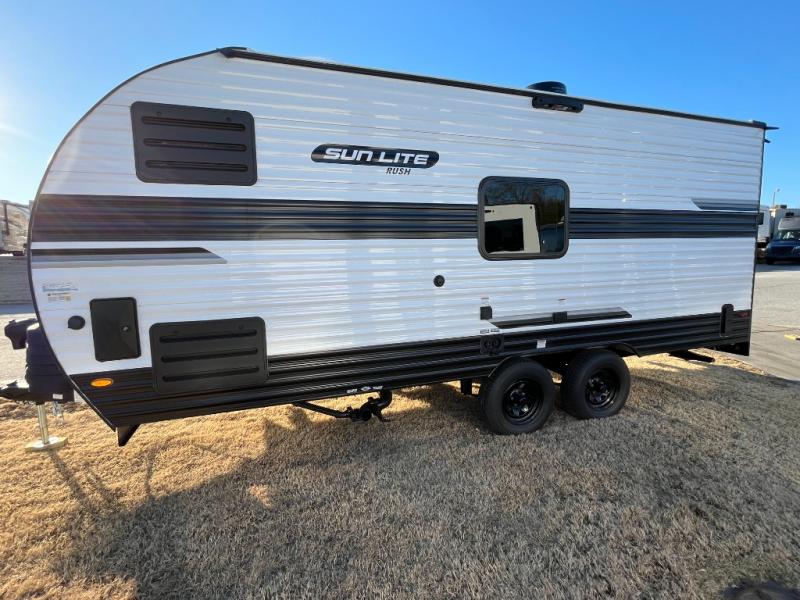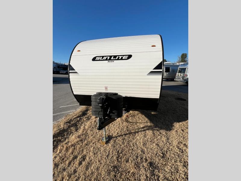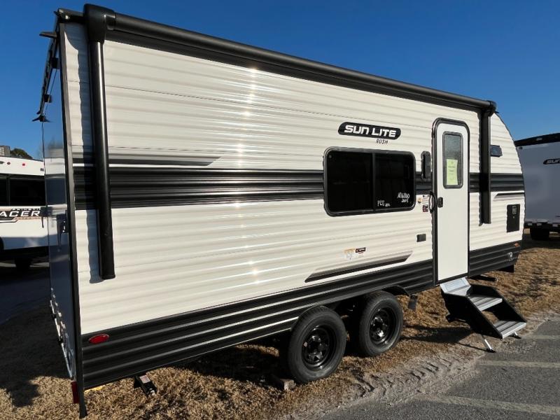 You can trust the build and enjoy your experience with any one of these Sunset Park RV Sun Lite travel trailers or toy haulers! Their aerodynamic profile is not only easy to haul, but also saves on fuel. They are built to withstand years of traveling even though they are lightweight with a diamond plate rock guard, a one piece PVC roof membrane, Dexter Spring-Leaf axles, and tinted safety glass windows. Some comfort standards you are sure to enjoy are the two-burner stove top range with hood, light and fan, plus the refrigerator and microwave, and an outside shower to help keep the dirt outdoors where it belongs.