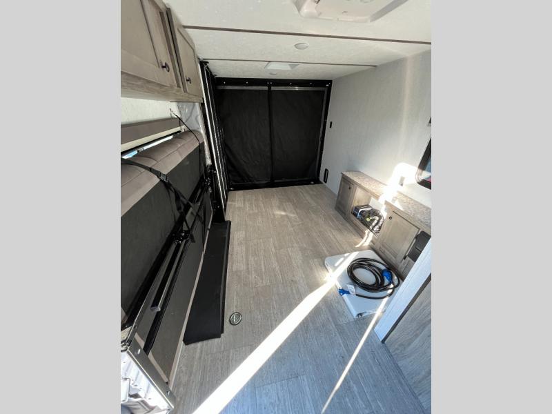 Get ready for a great camping experience where you can take along your favorite ride-on toys, kayaks, or other items that you may not normally have room to load as this toy hauler features 13' 2" of cargo space that can easily be loaded using the rear ramp door. Once unloaded, set up with the fold-down bed that will make for a great night's rest. There is also a jiffy sofa that can transform into added sleeping space at night. The kitchen amenities will make it easy to create a warm meal, and you can get cleaned up and refreshed in the bathroom with tub/shower and toilet.
