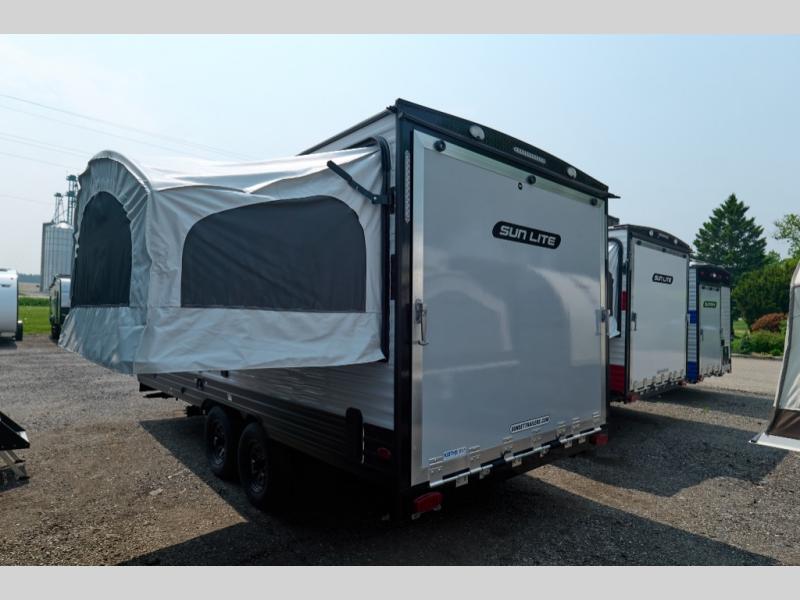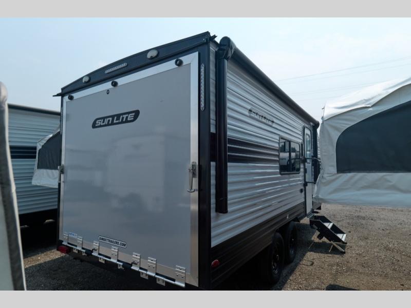 You can trust the build and enjoy your experience with any one of these Sunset Park RV Sun Lite travel trailers or toy haulers! Their aerodynamic profile is not only easy to haul, but also saves on fuel. They are built to withstand years of traveling even though they are lightweight with a diamond plate rock guard, a one piece PVC roof membrane, Dexter Spring-Leaf axles, and tinted safety glass windows. Some comfort standards you are sure to enjoy are the two-burner stove top range with hood, light and fan, plus the refrigerator and microwave, and an outside shower to help keep the dirt outdoors where it belongs.