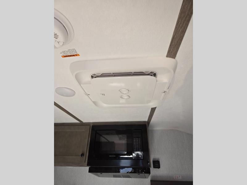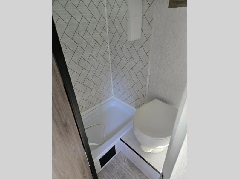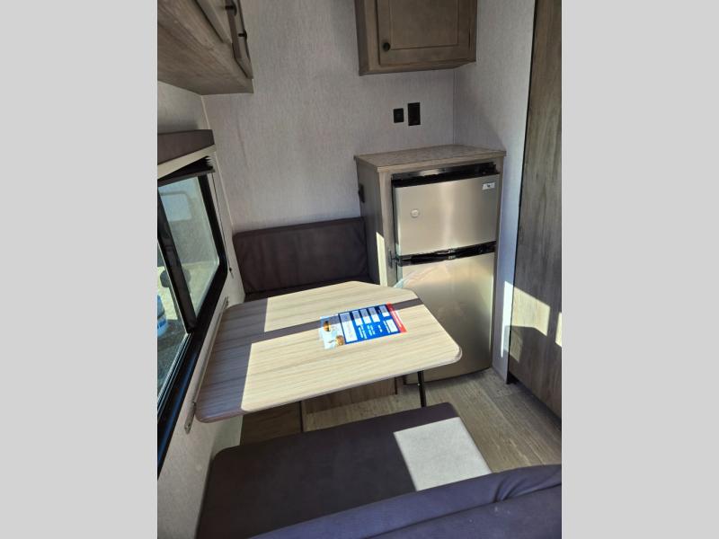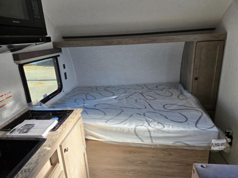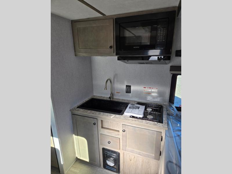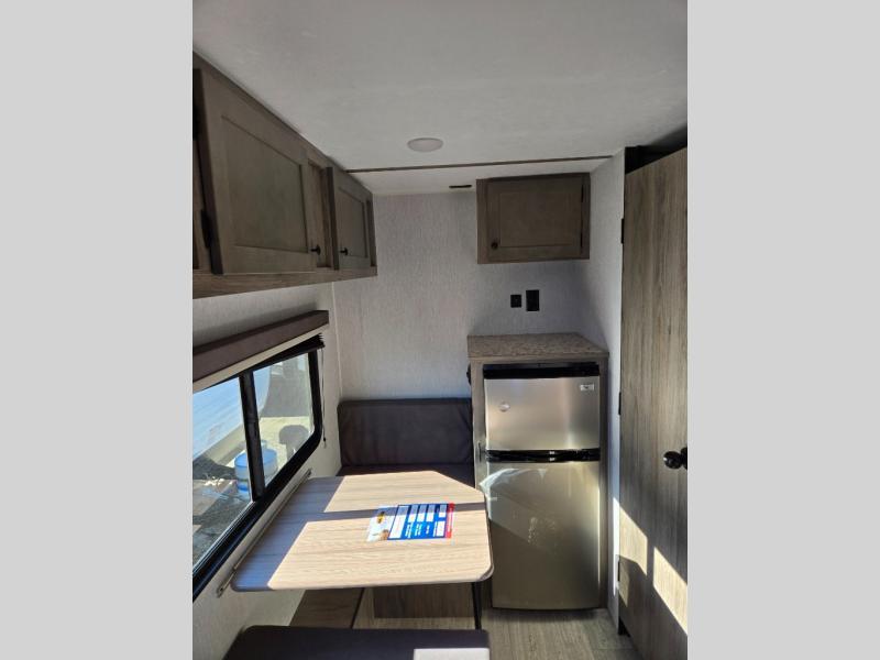 This lightweight travel trailer is perfect for two to three campers each night! You will sleep soundly on the front 54" x 74" bed with an overhead shelf and a closet for your things. Whip up eggs and bacon on the two burner cooktop in the morning, then dine at the 30" booth dinette. This can also double as sleeping space for an overnight guest or two little ones! The private bath with a 24" x 32" shower and a toilet will let you freshen up each day, and the double sink in the kitchen provides a place to wash your hands and teeth at night. You will also appreciate having a 4.3 cu. ft. 12V refrigerator to keep your food fresh and a 5K BTU wall A/C to keep you comfortable all summer long!