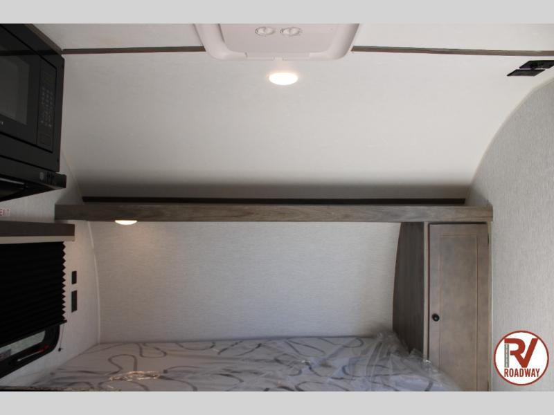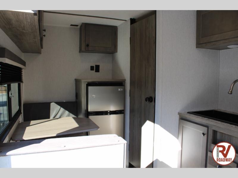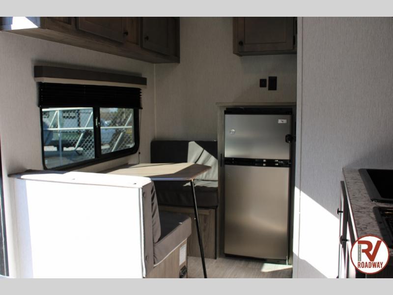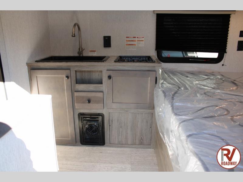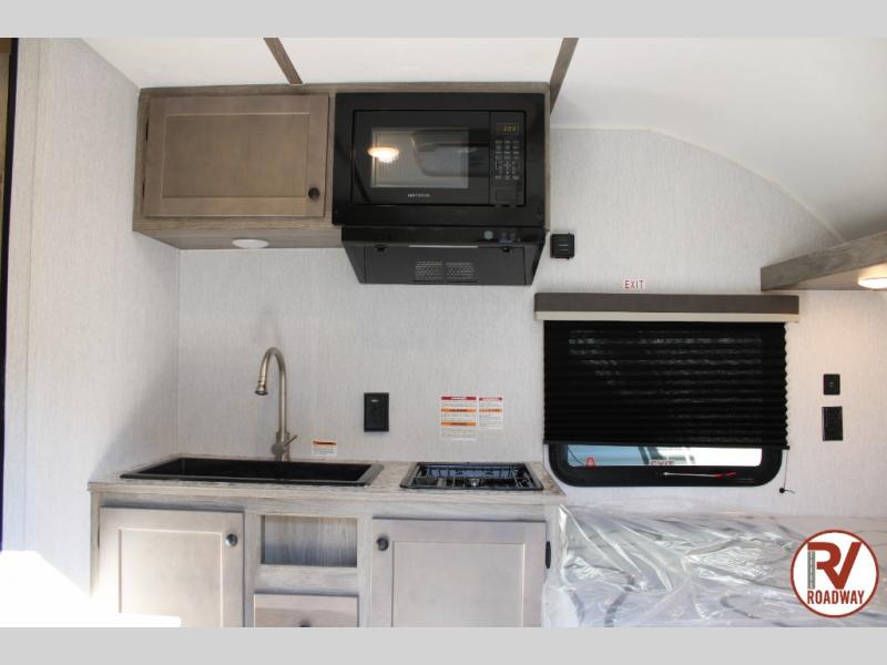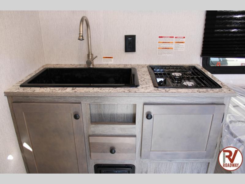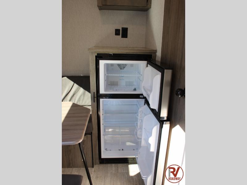 This lightweight travel trailer is perfect for two to three campers each night! You will sleep soundly on the front 54" x 74" bed with an overhead shelf and a closet for your things. Whip up eggs and bacon on the two burner cooktop in the morning, then dine at the 30" booth dinette. This can also double as sleeping space for an overnight guest or two little ones! The private bath with a 24" x 32" shower and a toilet will let you freshen up each day, and the double sink in the kitchen provides a place to wash your hands and teeth at night. You will also appreciate having a 4.3 cu. ft. 12V refrigerator to keep your food fresh and a 5K BTU wall A/C to keep you comfortable all summer long!