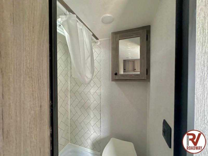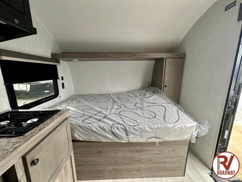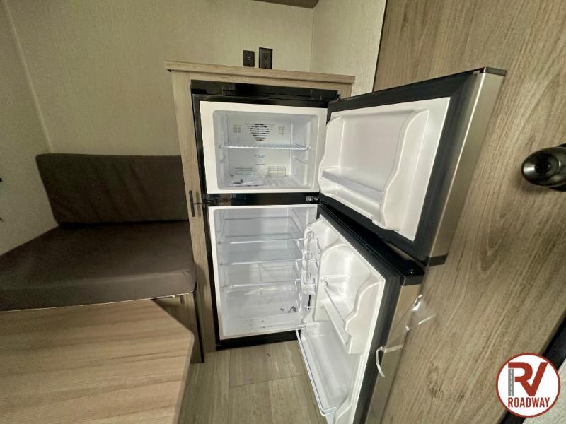 This lightweight travel trailer is perfect for two to three campers each night! You will sleep soundly on the front 54" x 74" bed with an overhead shelf and a closet for your things. Whip up eggs and bacon on the two burner cooktop in the morning, then dine at the 30" booth dinette. This can also double as sleeping space for an overnight guest or two little ones! The private bath with a 24" x 32" shower and a toilet will let you freshen up each day, and the double sink in the kitchen provides a place to wash your hands and teeth at night. You will also appreciate having a 4.3 cu. ft. 12V refrigerator to keep your food fresh and a 5K BTU wall A/C to keep you comfortable all summer long!